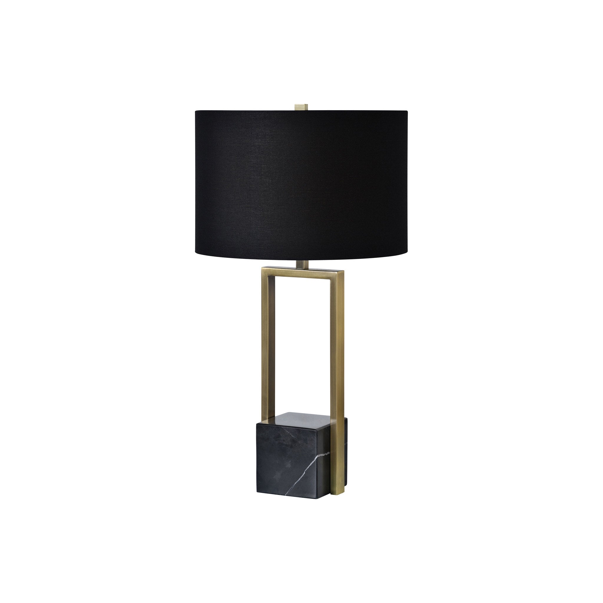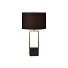 Le design moderne est à l'honneur avec cette lampe de table. L'association d'angles prononcés, de marbre, de fer plaqué laiton antique et d'un abat-jour en coton noir est élégante et cosmopolite. Elle apportera une touche d'éclat à votre salon.