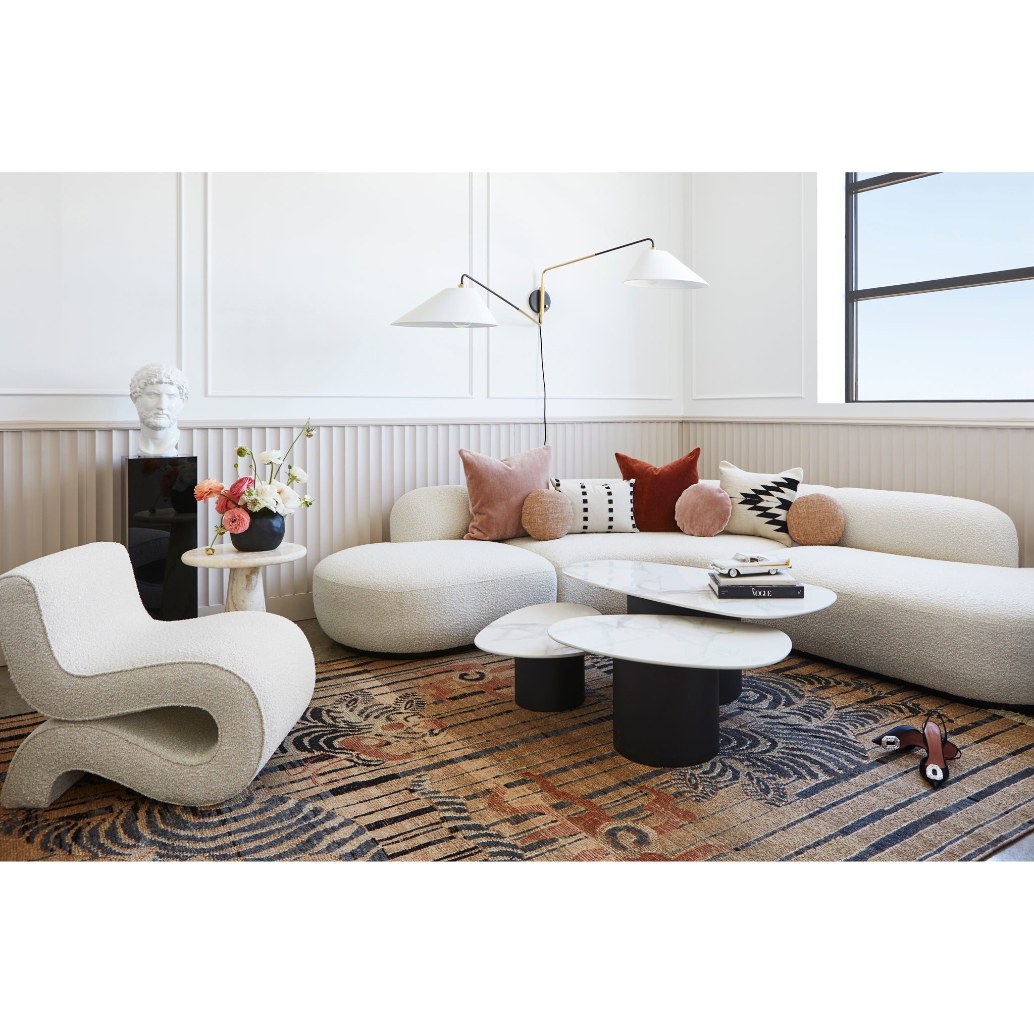Duo se distingue par son style unique. Des abat-jour allongés en lin belge blanc s'épanouissent depuis des bras incurvés en bronze vieilli. Leur forme étirée apporte une touche d'originalité et diffuse une douce lumière. Le lustre à trois lumières se fixe près du plafond, tandis que l'applique murale articulée à deux lumières pivote de gauche à droite et s'incline de haut en bas. Création de Kelly Behun pour Hudson Valley Lighting.