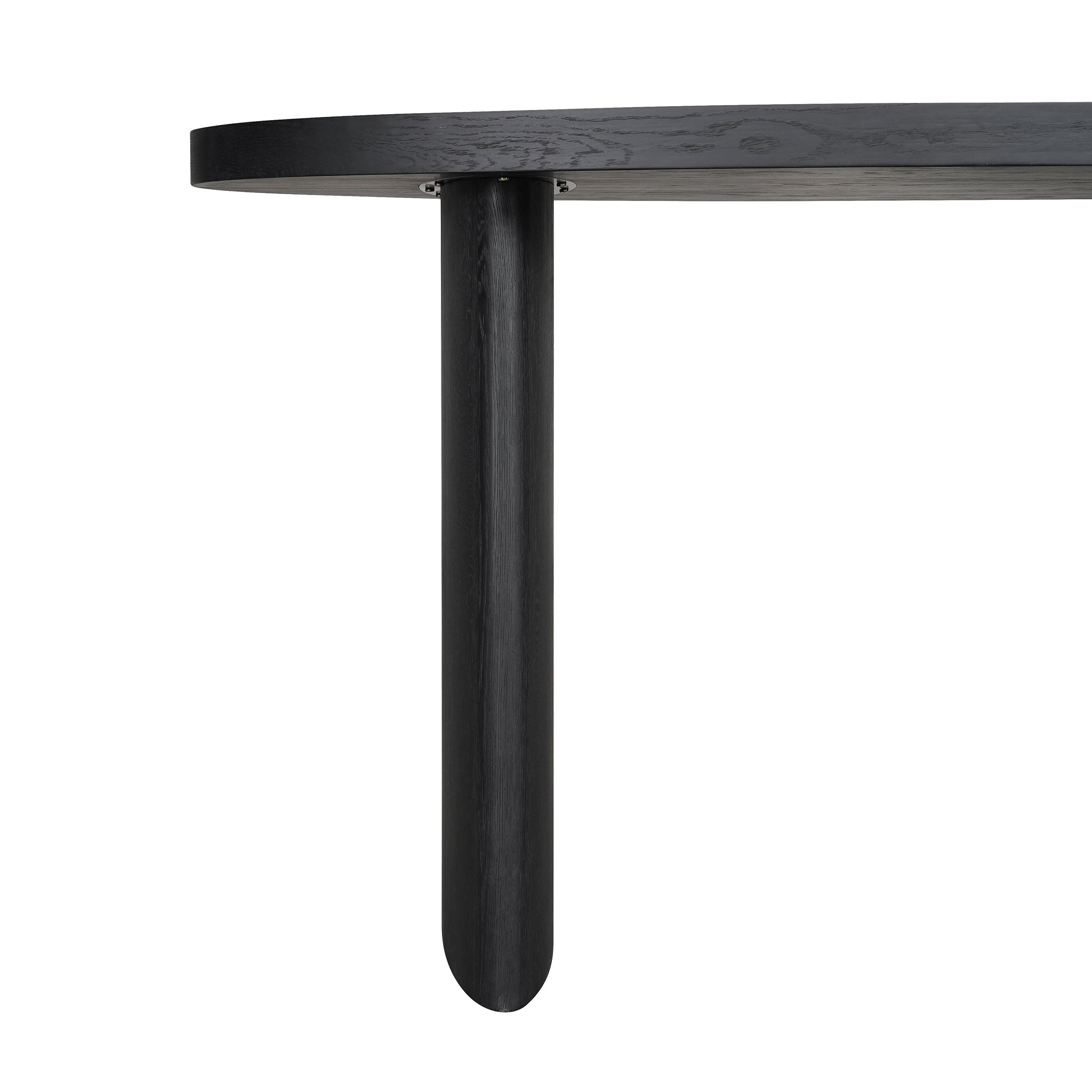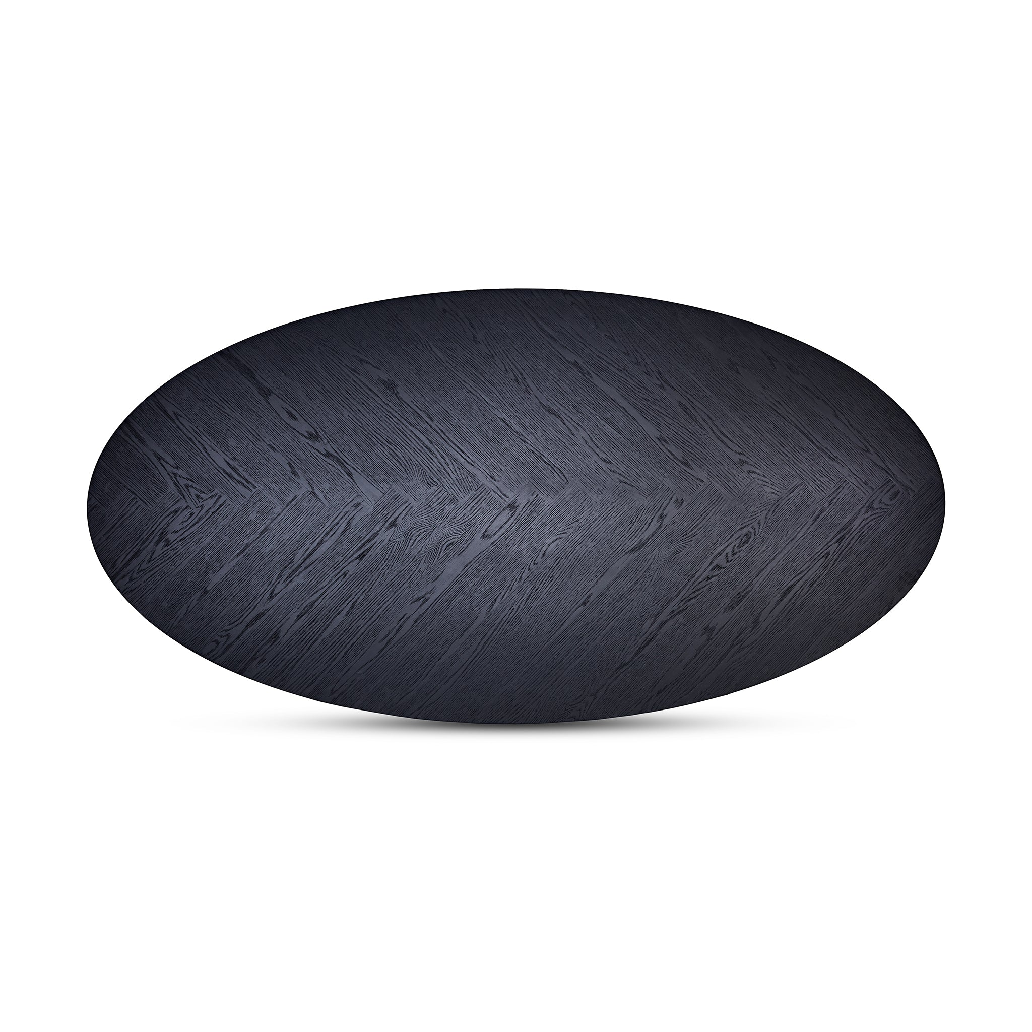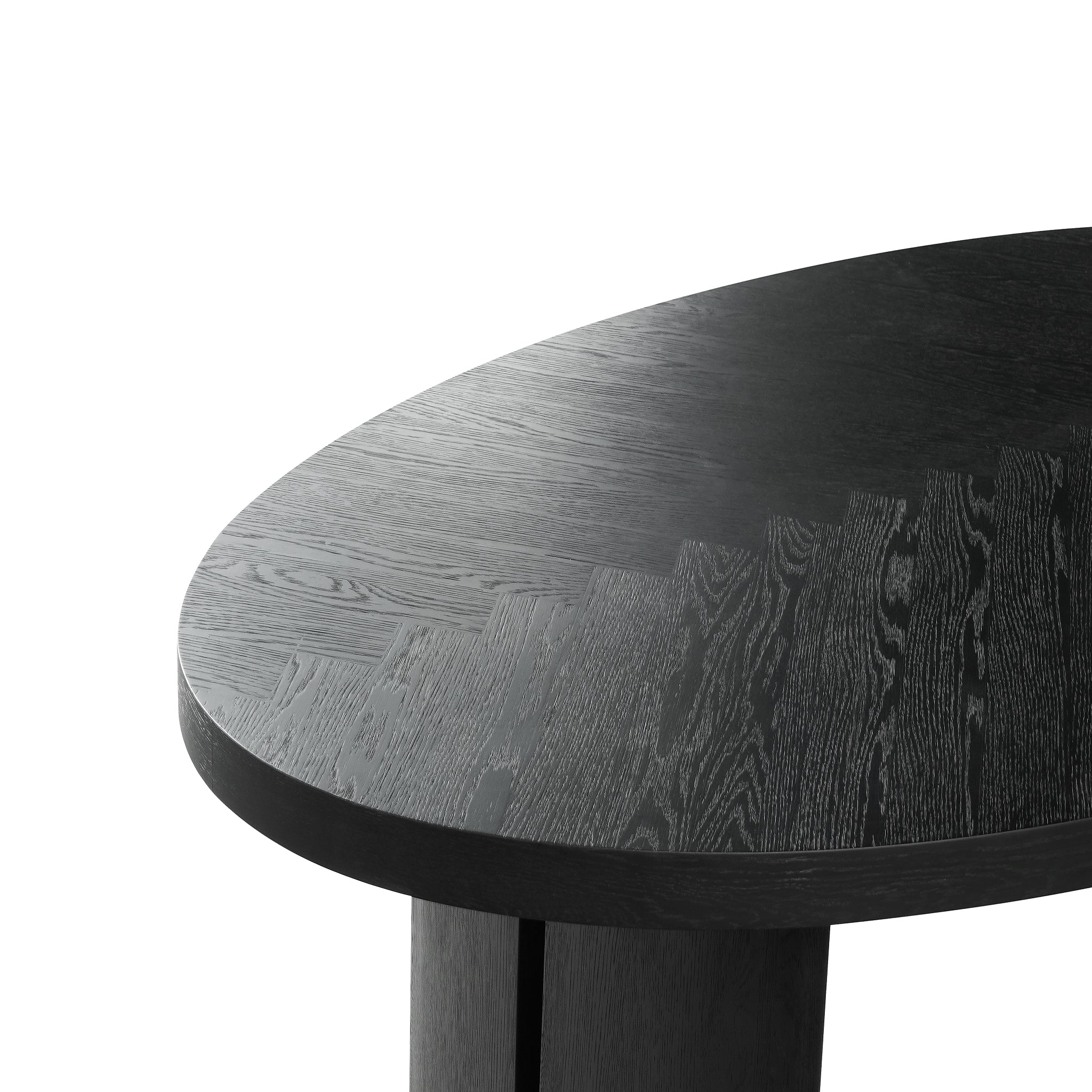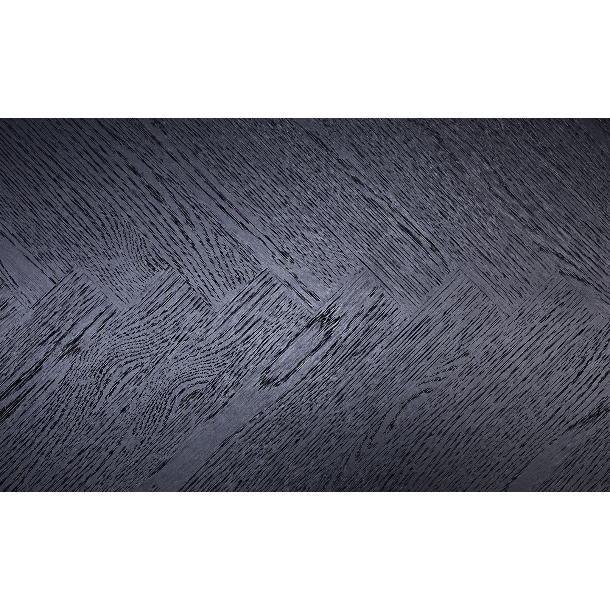 La table à manger Jeremiah présente une silhouette contemporaine avec un piètement aux bords arrondis et un plateau au motif chevrons magnifiquement détaillé. La finition teintée noire apporte une touche de maturité, mettant en valeur le motif parqueté captivant des surfaces extérieures. Un plateau épais rehausse l'esthétique générale et souligne le motif rustique.
