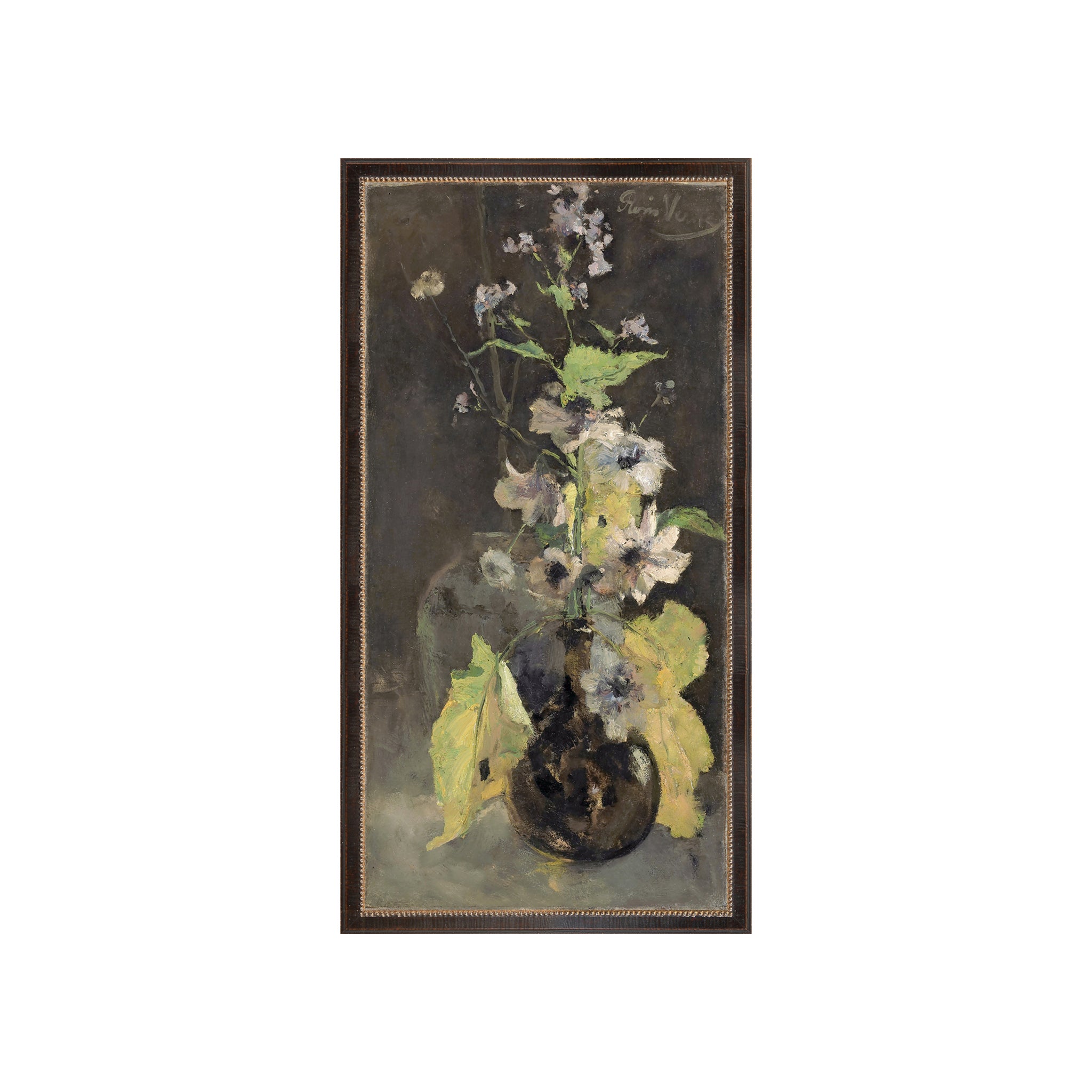Cette impressionnante nature morte florale est un ajout chaleureux et naturel à notre petite collection d'art. L'éclat des fleurs, contrasté par le vase sombre et fumé, offre une palette de verts, de blush doux et de reflets dorés chatoyants. Les coups de pinceau audacieux confèrent à ce tableau profondeur et texture, ajoutant une élégance saisissante à votre pièce.