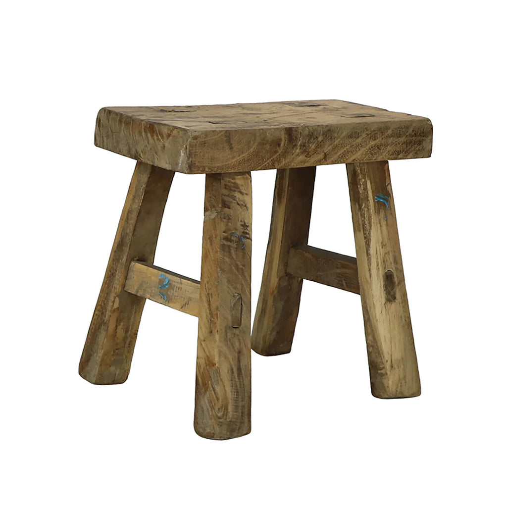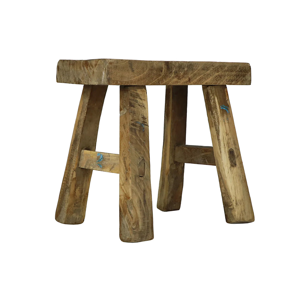 Tabouret en bois récupéré et réassemblé. Fabriqué en bois récupéré, sa finition transparente met en valeur la beauté naturelle du bois. Ce meuble n'est pas destiné à servir d'assise. Il peut servir de rehausseur de table ou de repose-pieds de cuisine.