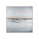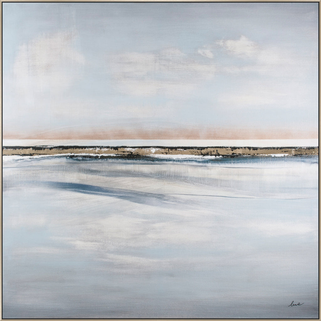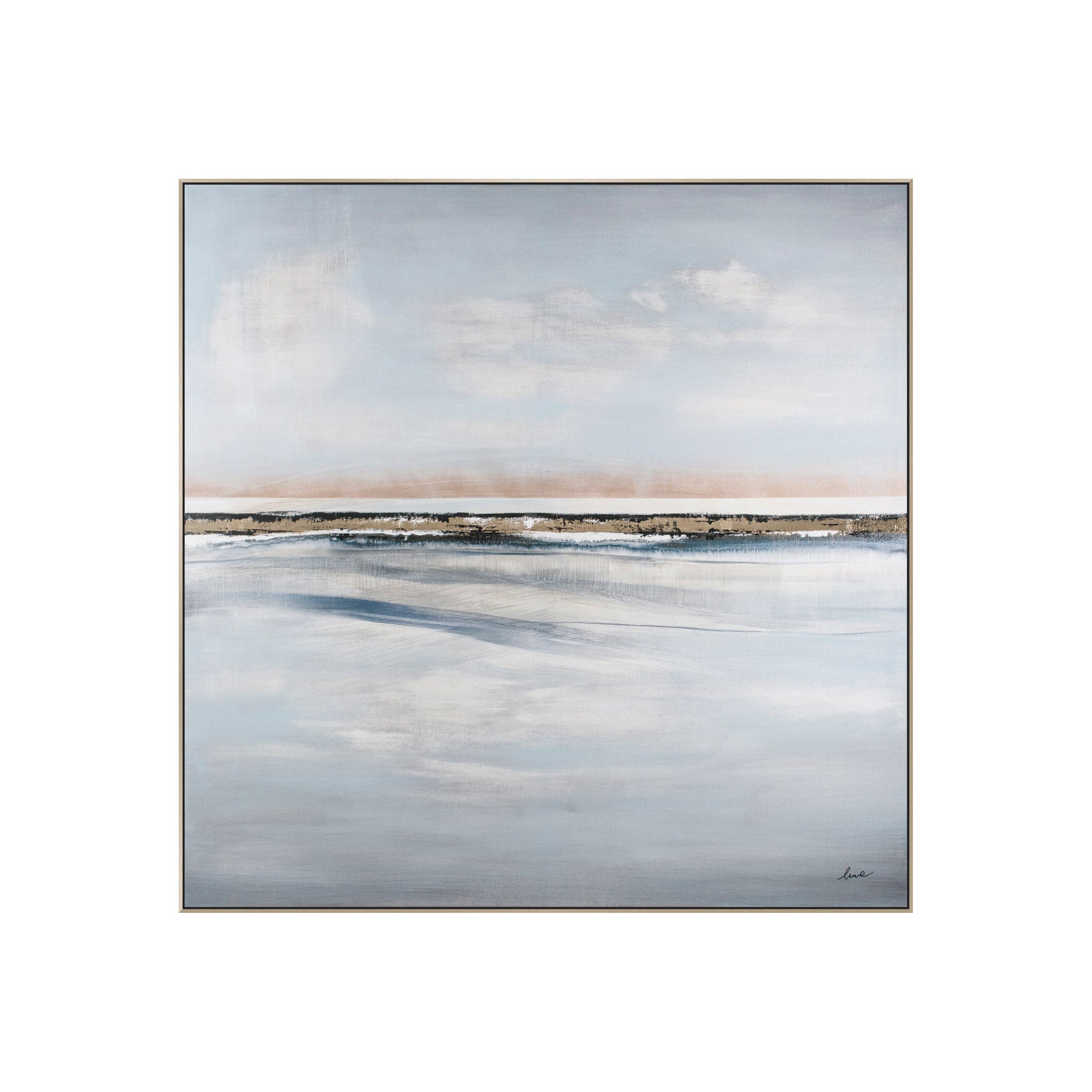 Une scène sereine pour apaiser votre salon. Cette toile peinte à la main est rehaussée de feuilles d'or pour une touche d'éclat et de profondeur. Son cadre flottant champagne complète parfaitement le tableau.