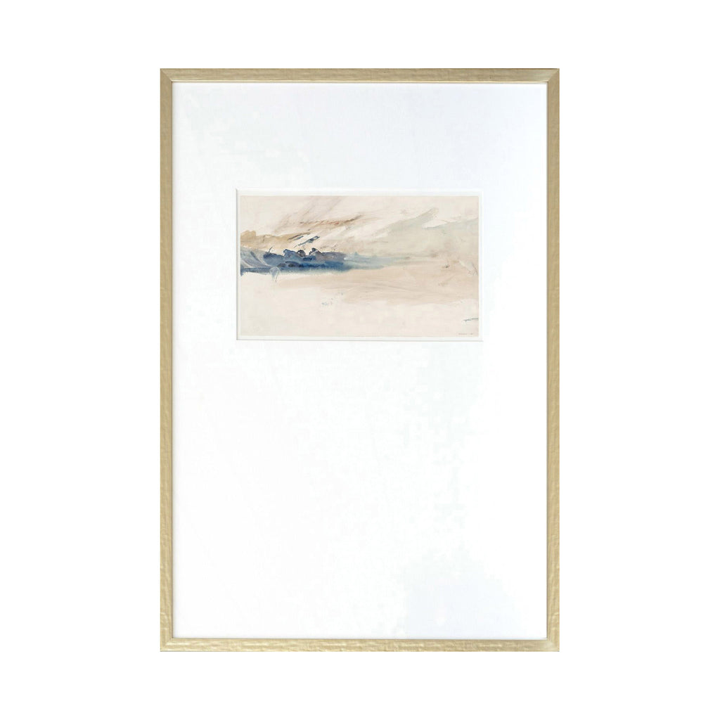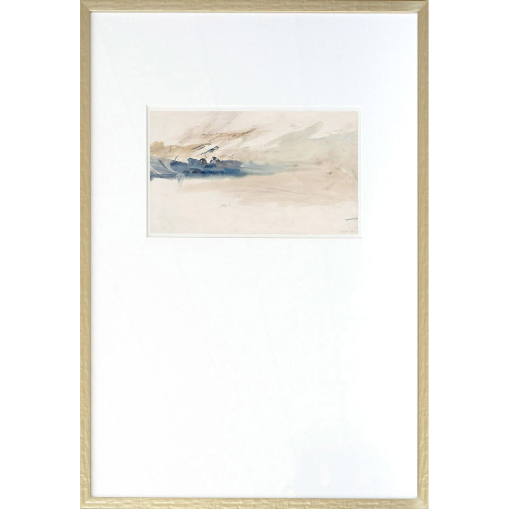 William Turner était un peintre romantique anglais considéré comme un précurseur du mouvement impressionniste français. Ses larges lavis atmosphériques lui ont valu le surnom de « peintre de la lumière ». Inspiré par les couchers de soleil spectaculaires de l'Angleterre de 1816, il est présenté dans un passe-partout double épaisseur, surdimensionné et lesté, avec un cadre argenté finement moucheté.