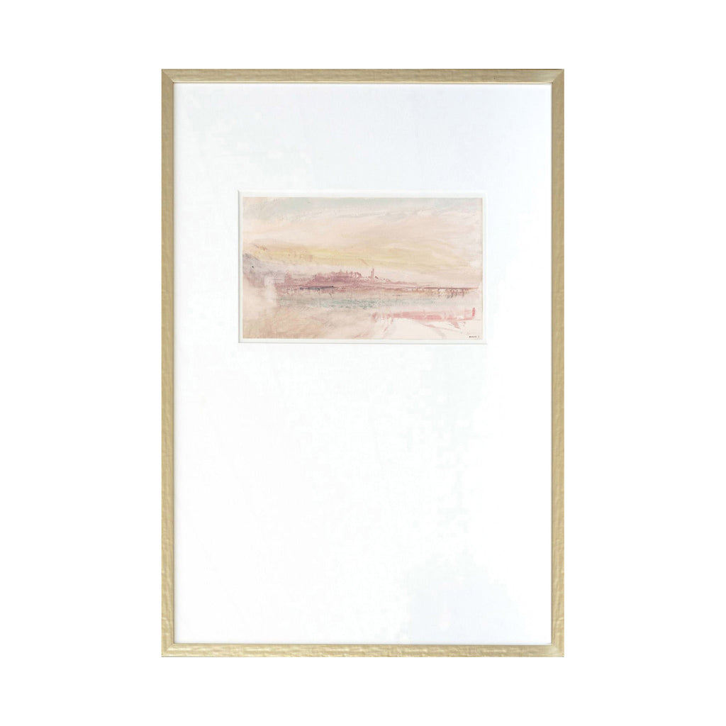 William Turner était un peintre romantique anglais considéré comme un précurseur du mouvement impressionniste français. Ses larges lavis atmosphériques lui ont valu le surnom de « peintre de la lumière ». Inspiré par les couchers de soleil spectaculaires de l'Angleterre de 1816, il est présenté dans un passe-partout double épaisseur, surdimensionné et lesté, avec un cadre argenté finement moucheté.