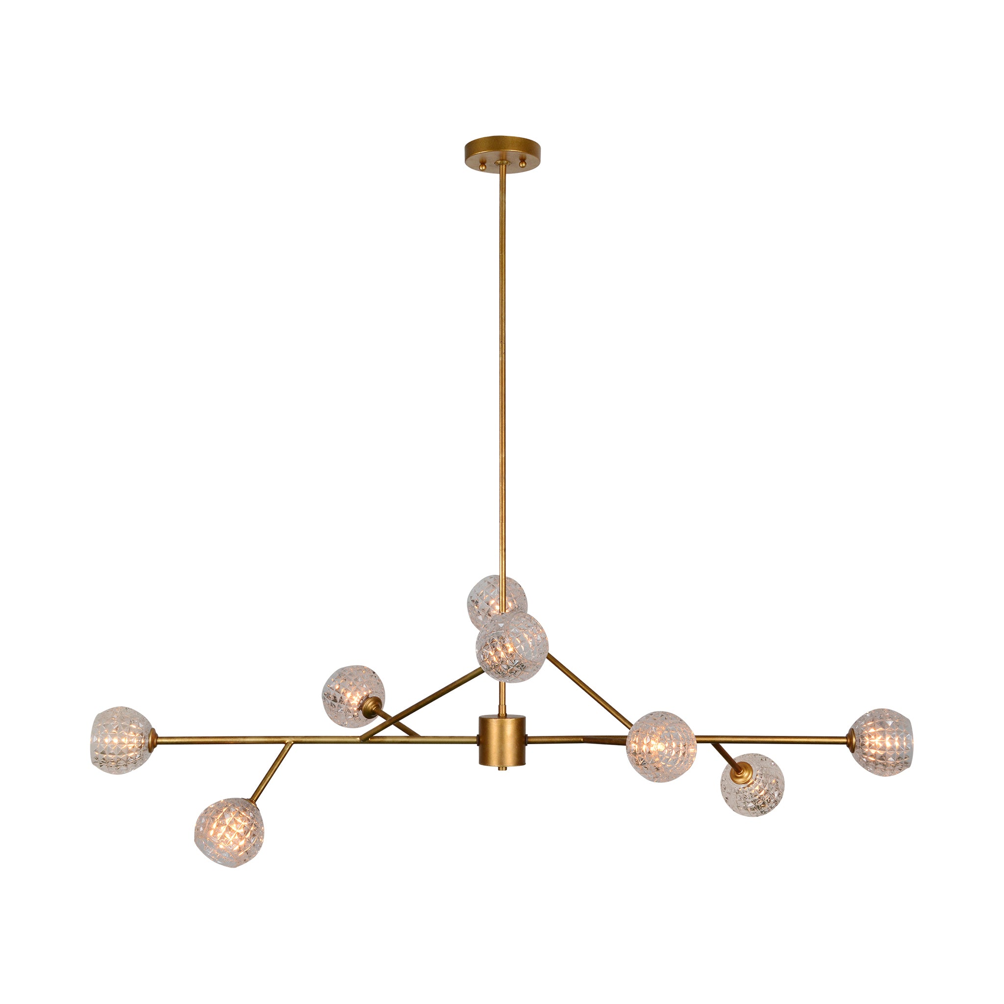 Les motifs floraux de cette suspension décorative s'inspirent des branches fleuries des cerisiers. Huit abat-jour en verre taillé en cristal ajoutent une touche luxueuse à la forme épurée de la tige finition or vieilli et des bras tendus de la suspension. Son design glamour allie des éléments et finitions classiques à une silhouette contemporaine pour créer un luminaire intemporel et étincelant.