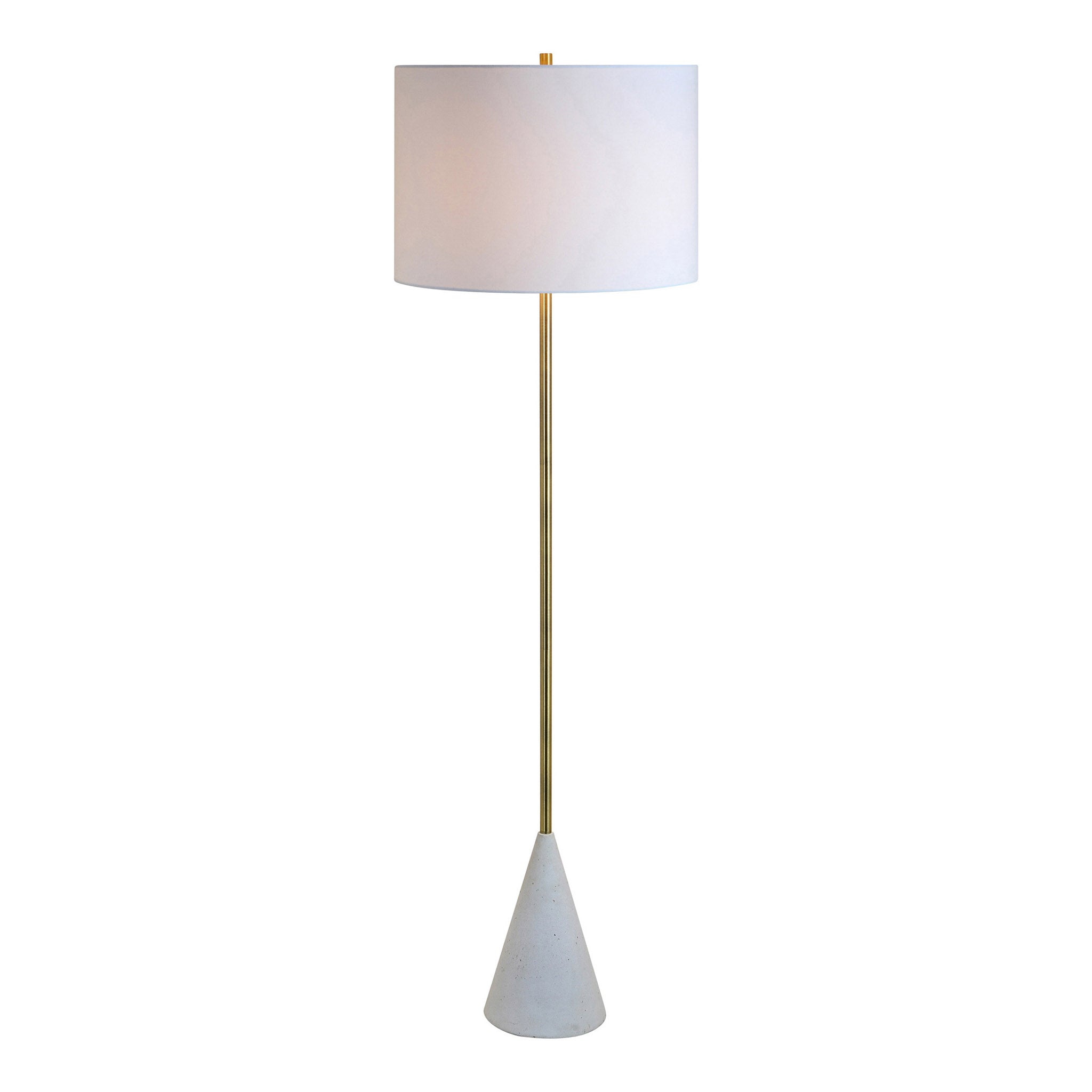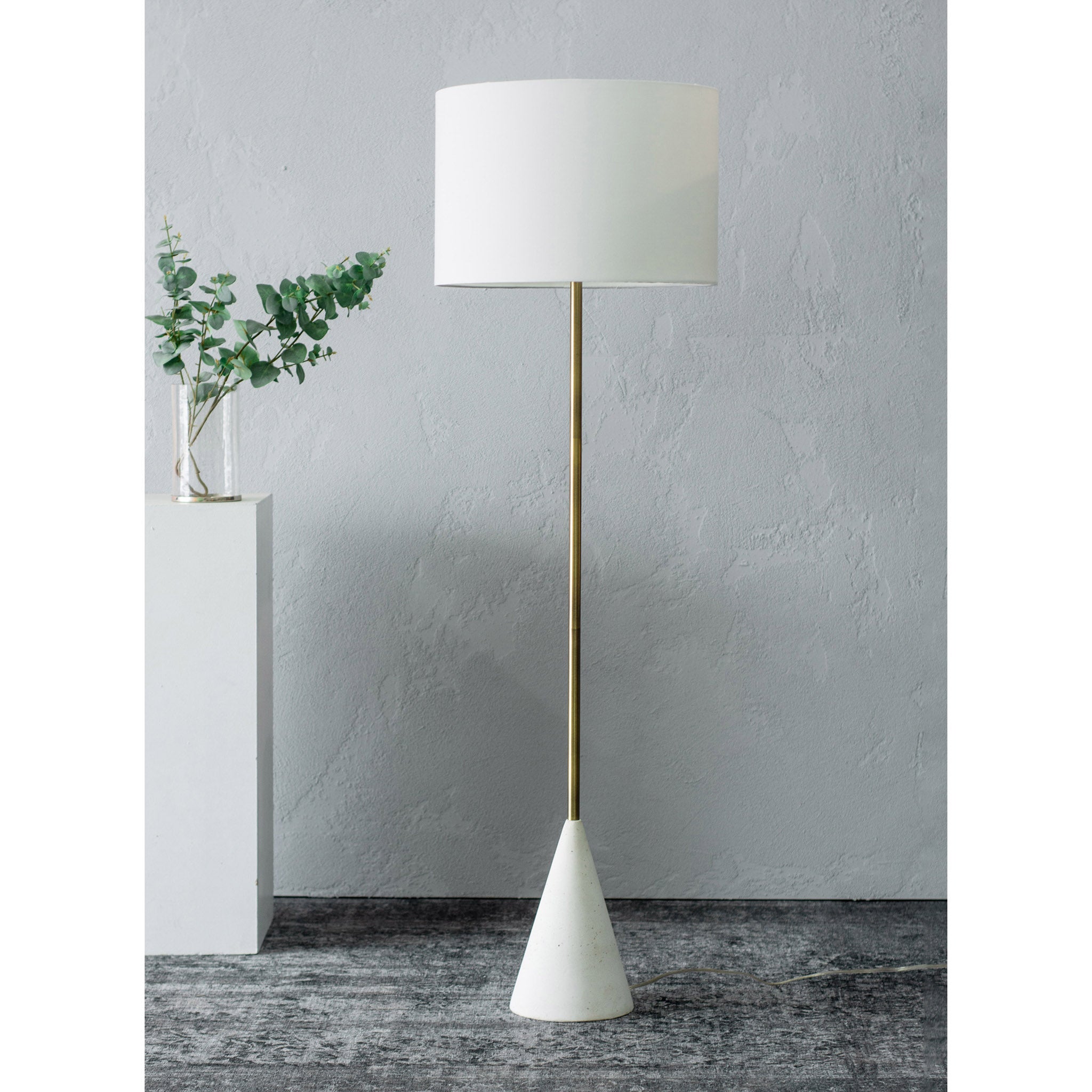 Ce lampadaire se distingue par sa base conique en terrazzo moucheté. Sa structure en fer brossé vieilli est surmontée d'un abat-jour en coton blanc cassé. L'interrupteur à pied facilite l'éclairage.