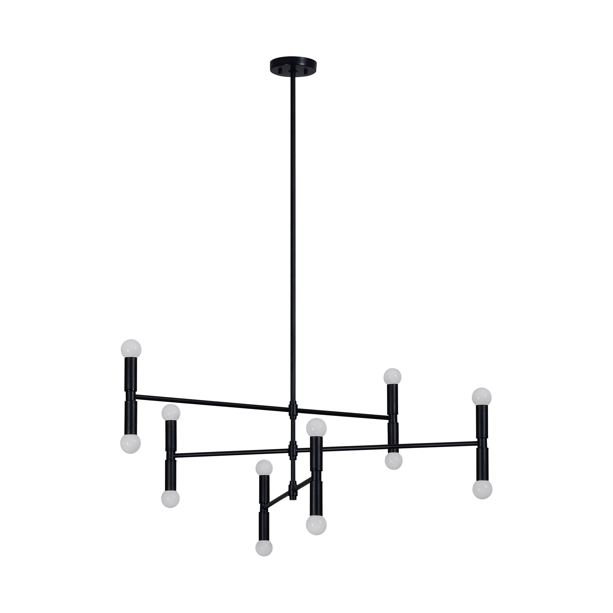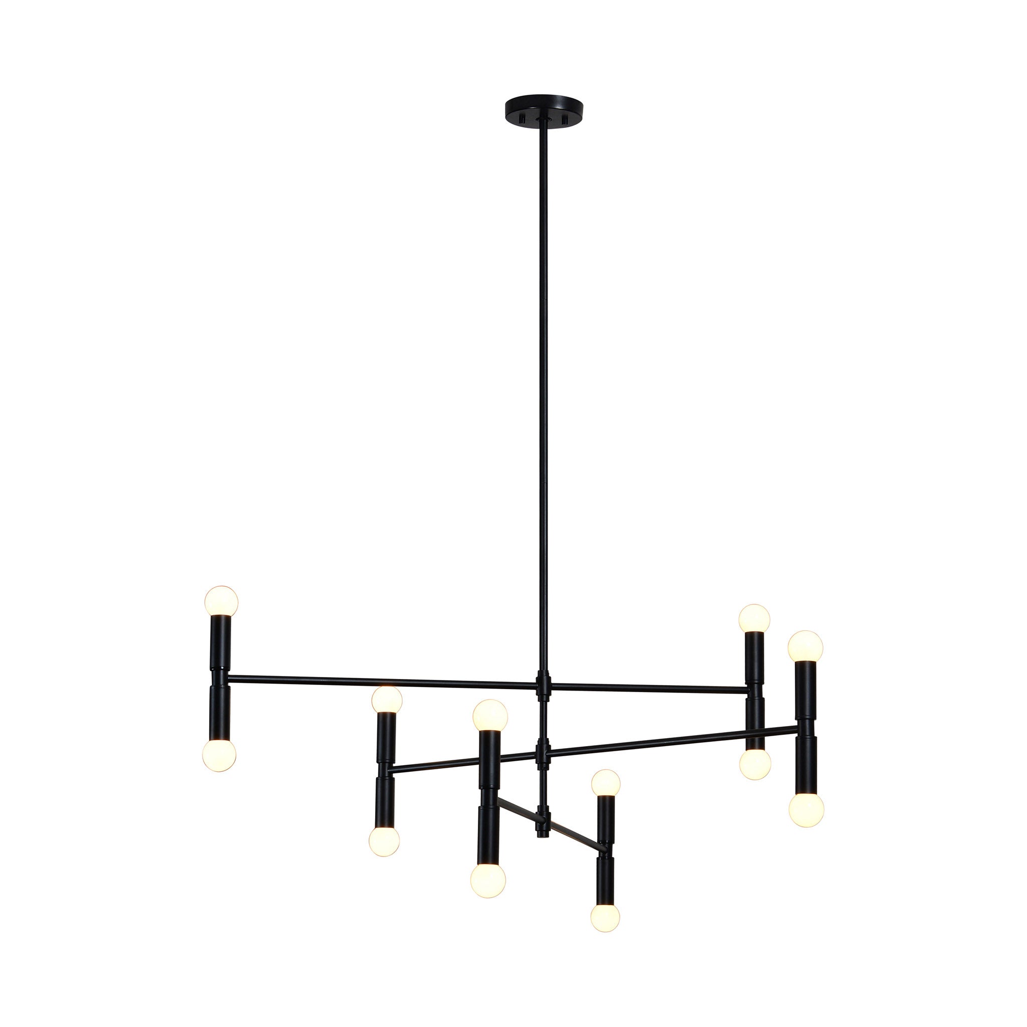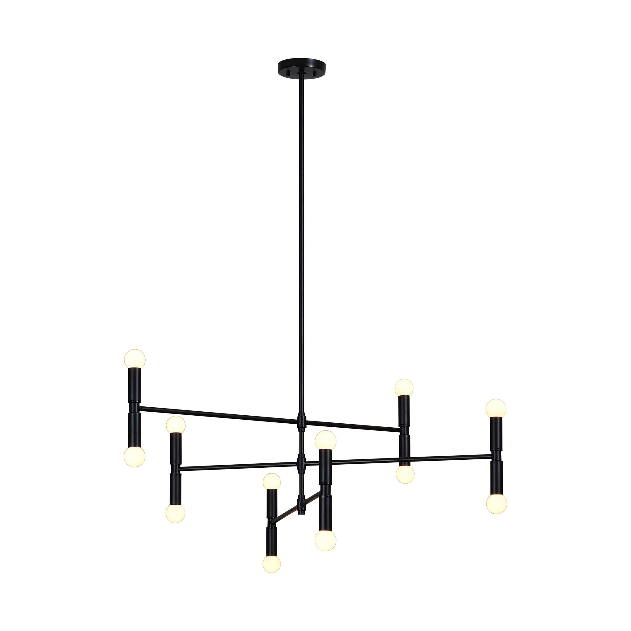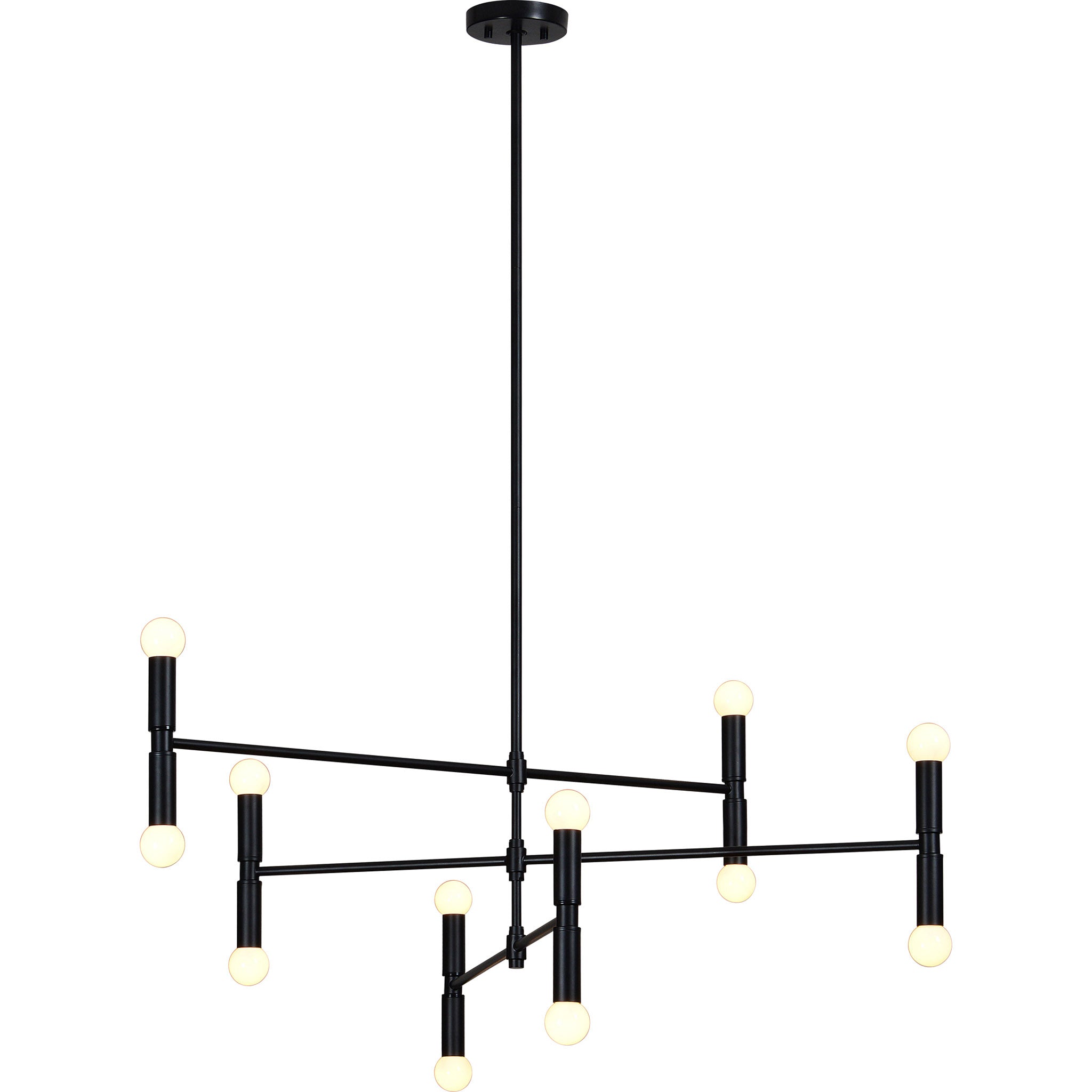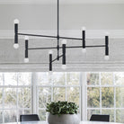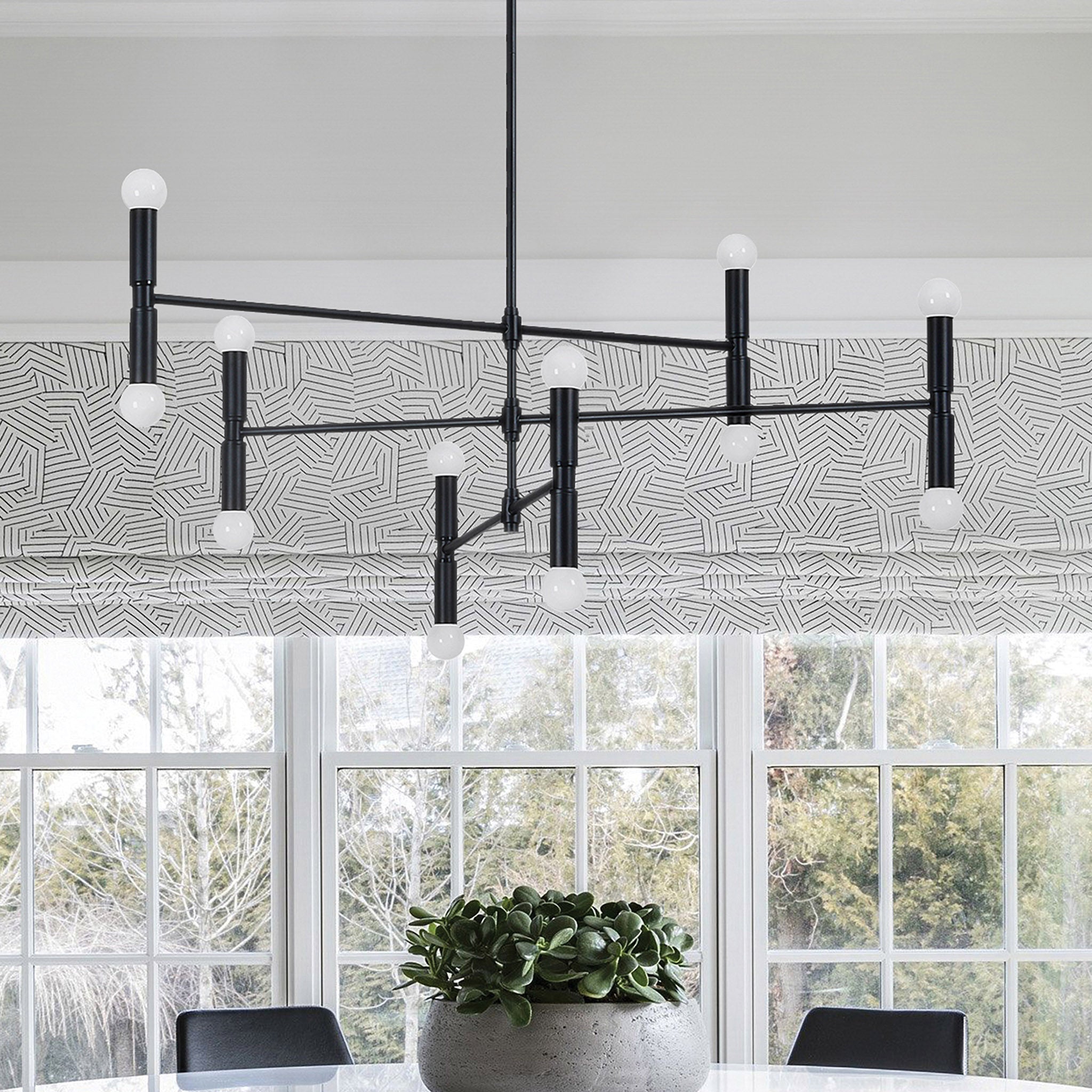 La salle à manger moderne est sublimée par ce plafonnier alliant énergie ludique et raffinement. Disposé à chaque extrémité de ses bras, il offre une belle luminosité. Fabriqué en fer avec une finition thermolaquée noir mat, il s'harmonise parfaitement avec les autres éléments de décoration.