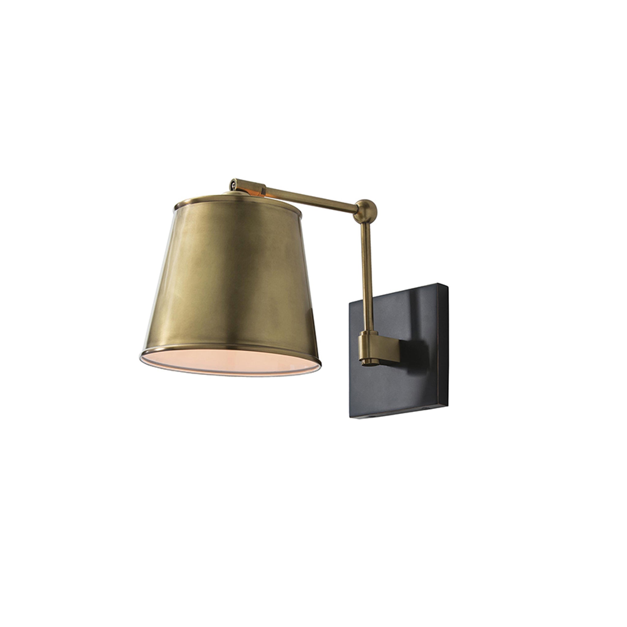 Cette applique murale de style milieu du siècle, en laiton antique avec plaque arrière en bronze, s'inscrit dans une sensibilité moderne. Son format en fait l'applique idéale pour mettre en valeur votre œuvre d'art préférée ou à côté d'un lit lorsque l'espace est restreint et qu'une table de chevet ne convient pas.