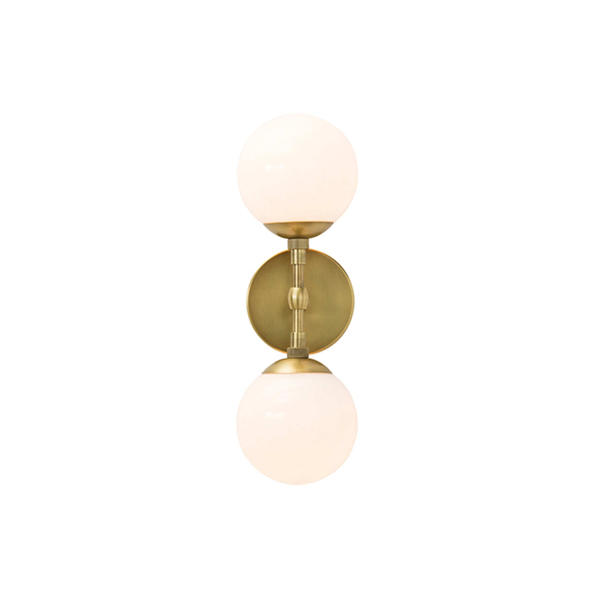 Avec ses proportions parfaitement équilibrées, cette applique double oppose des globes en verre dépoli à des bras et une plaque arrière en laiton antique. Un élément sophistiqué pour les intérieurs modernes, elle peut être montée horizontalement ou verticalement.