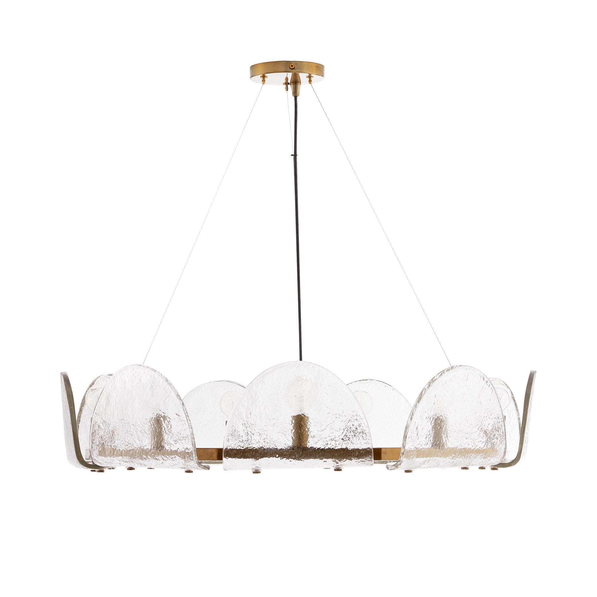 Chef-d'œuvre d'une beauté discrète, le Mendez équilibre un design de haut niveau et une composition organique. Neuf panneaux de verre affaissé de forme festonnée sont courbés sur un cadre en fer laiton antique, chacun étant un bouclier individuel pour une ampoule. Les panneaux de verre présentent une finition lustrée fumée et une texture martelée qui fonctionnent à l'unisson pour diffuser et disperser la lumière et rehausser les éléments bruts de l'esthétique globale. La finition variera. Résistant à l'humidité, bien que des zones extérieures couvertes limitées puissent affecter la finition.