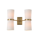 Cousine du design populaire Yasmin, l'applique en bois est mise en valeur par deux abat-jour en lin blanc cassé, émettant de la lumière au-dessus et en dessous de l'applique. finition en laiton antique partout. également disponible en argent vintage (49041). classé humide, bien que des conditions extérieures couvertes limitées puissent affecter la finition.