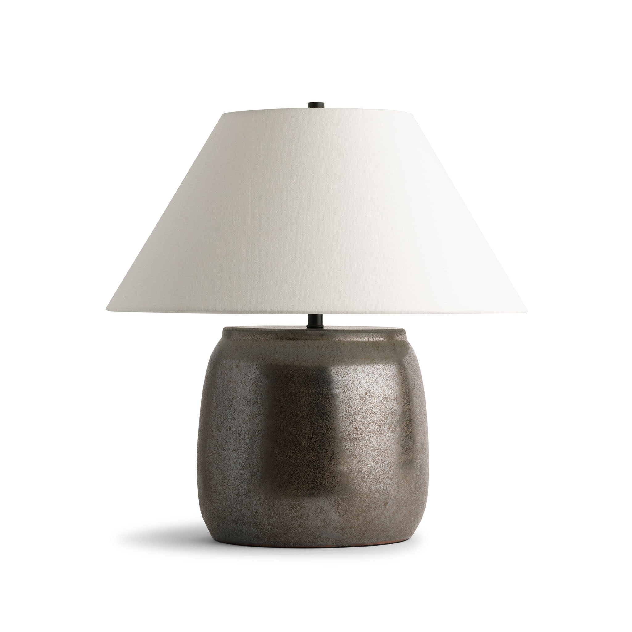 Le charme rustique de cette lampe de table Ryan en céramique s'harmonisera parfaitement avec tout type de décoration. Surmontée d'un luxueux abat-jour en lin blanc cassé, la base en céramique marron présente une finition texturée qui confère à cette imposante lampe une esthétique vieillie.