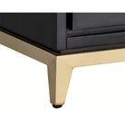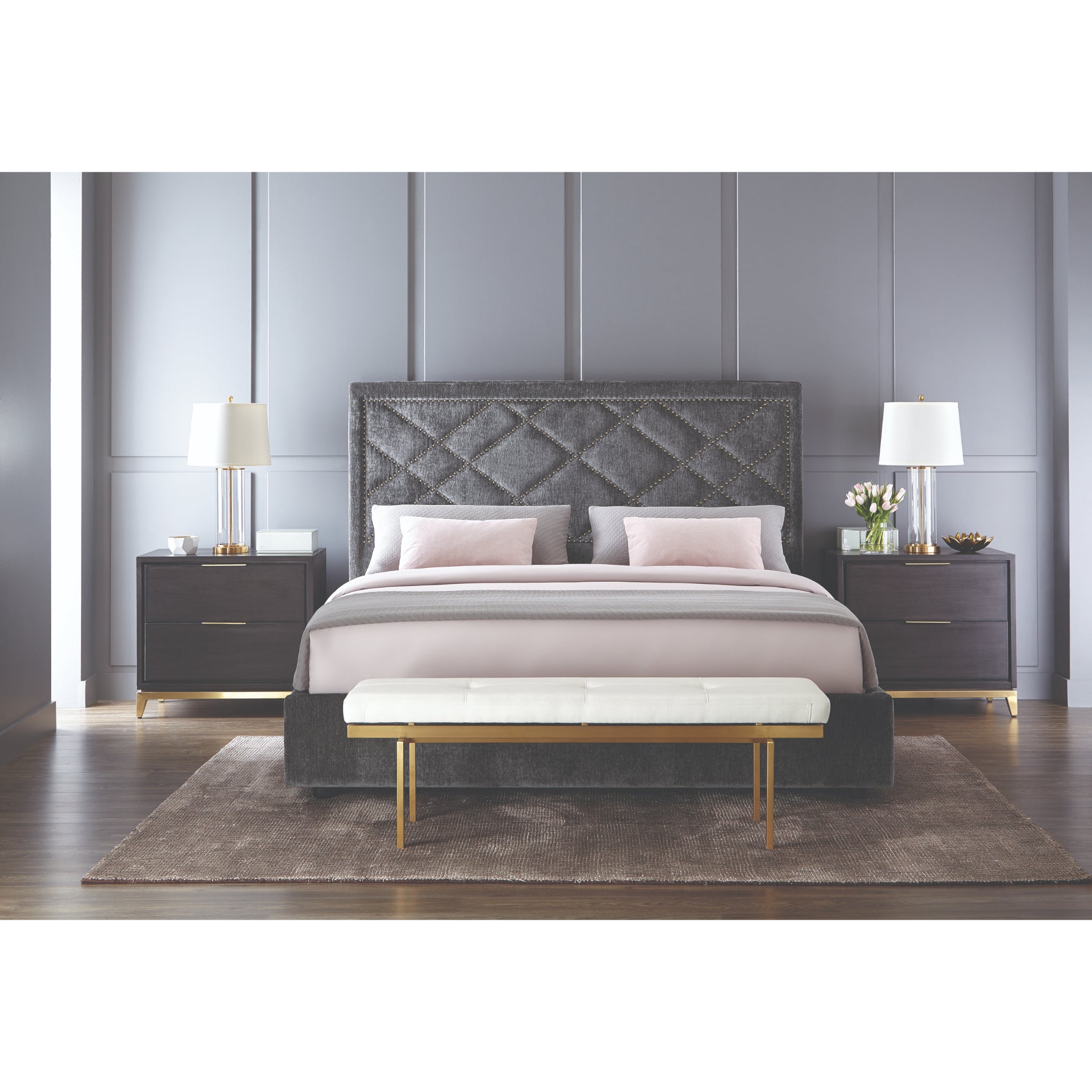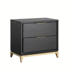 Cette table de chevet apportera chaleur et élégance à votre chambre. Fabriquée en placage d'acacia finition gris-brun fumé, elle est dotée de deux tiroirs profonds à fermeture douce. Des poignées et un piètement en acier doré jaune brossé complètent son style.
