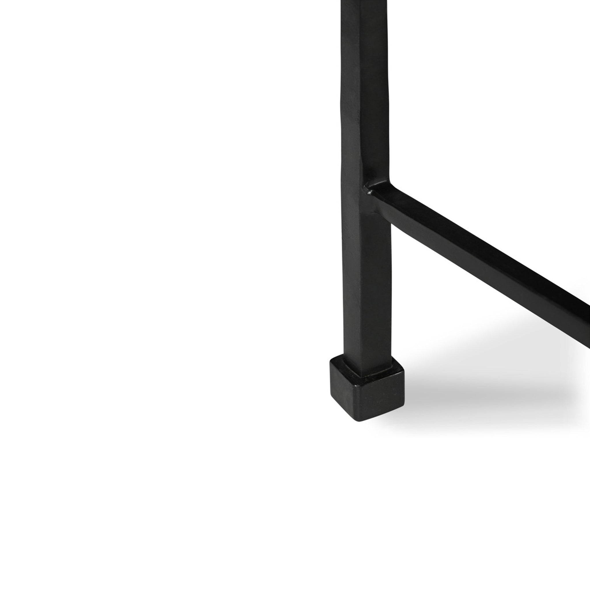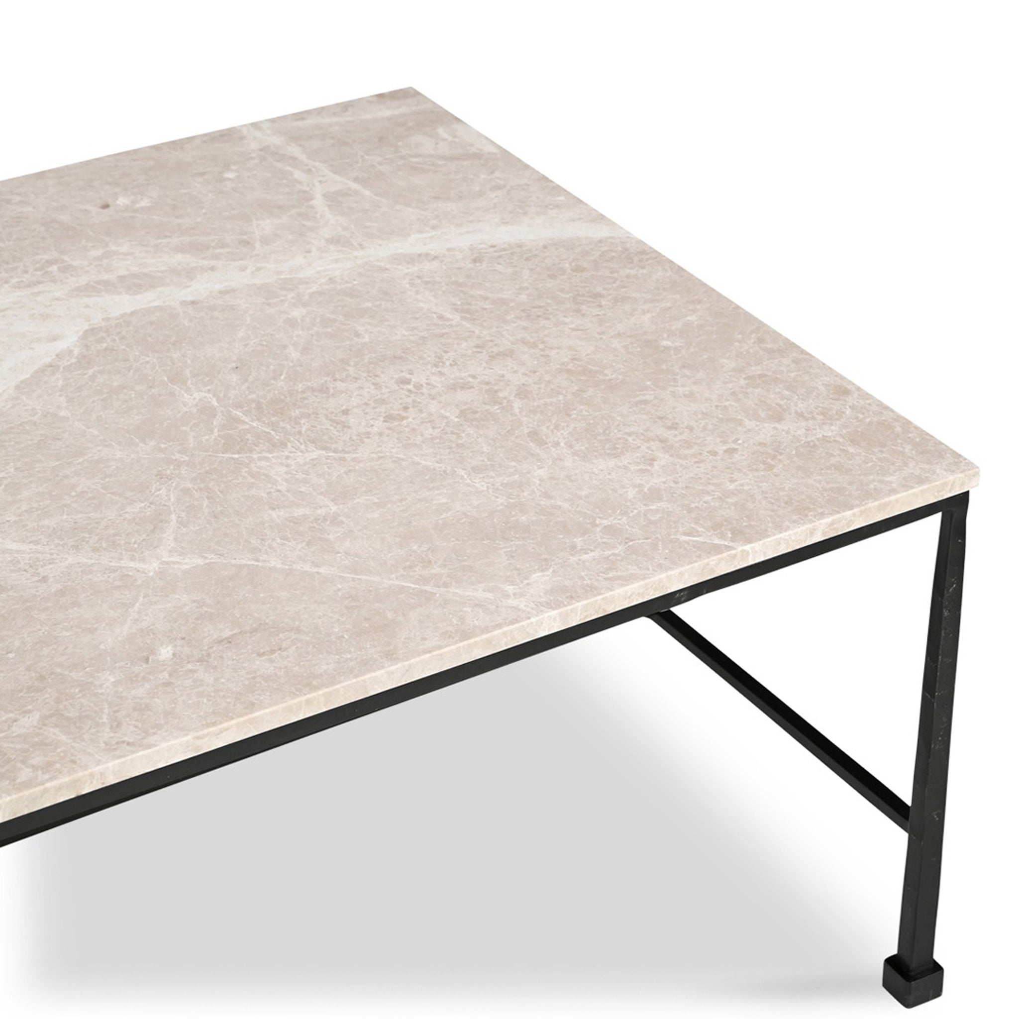 Ancrée dans un élégant piètement en fer orné de détails martelés, la table basse Simon, avec son piétement carré sculpté, insuffle une touche artistique incomparable, sublimée par un plateau en marbre italien Botticino. Le contraste saisissant des textures renforce l'attrait visuel, captivant et durable.