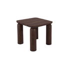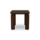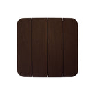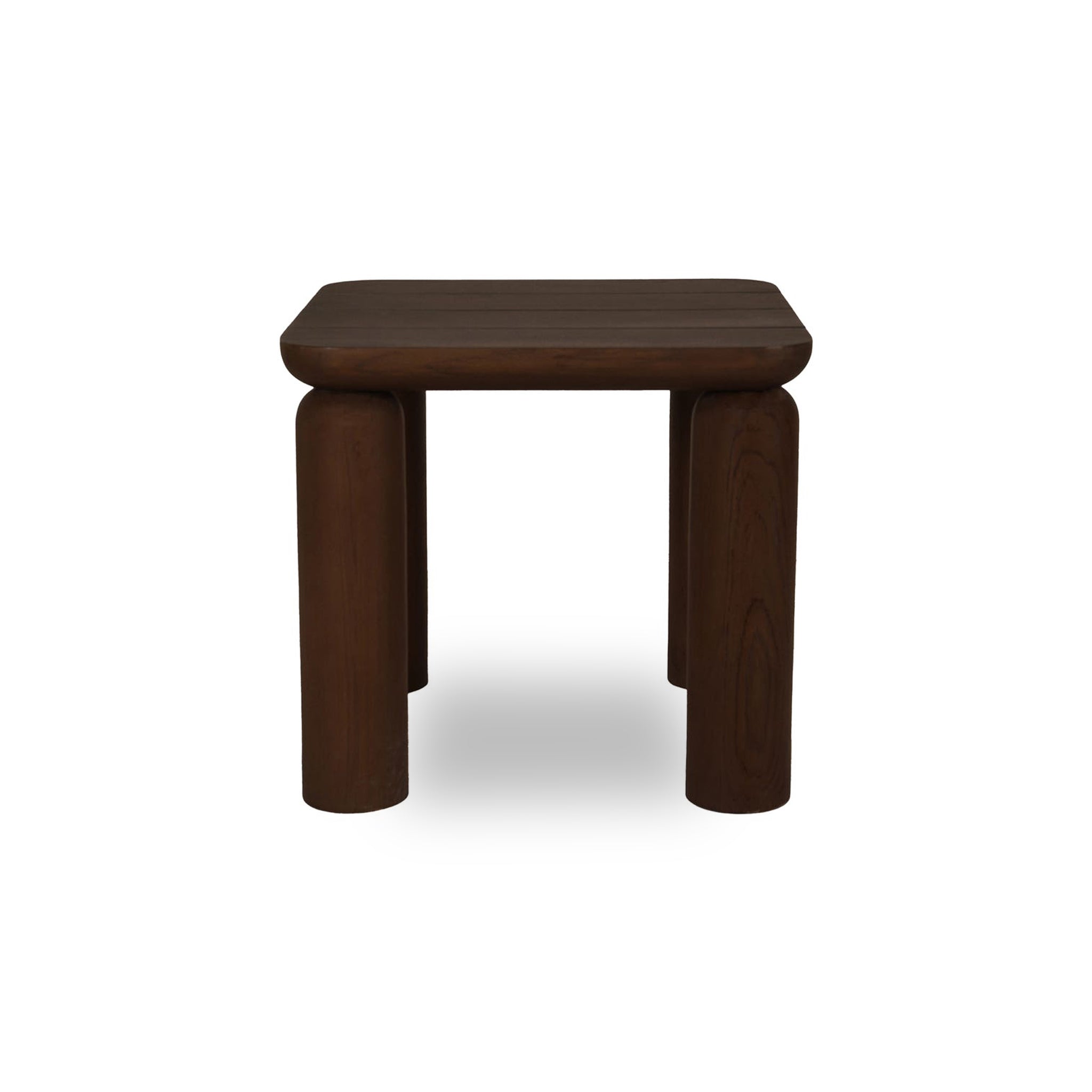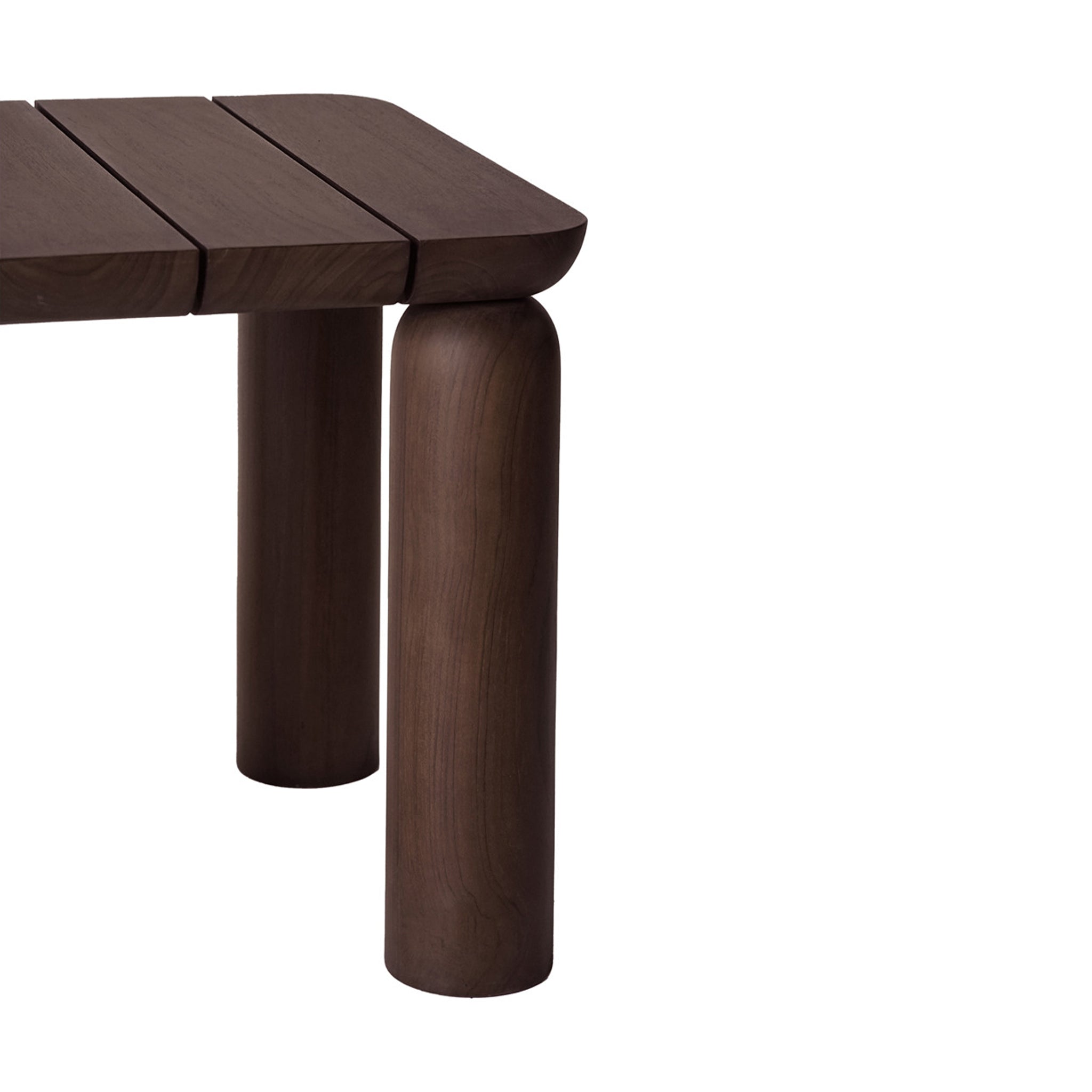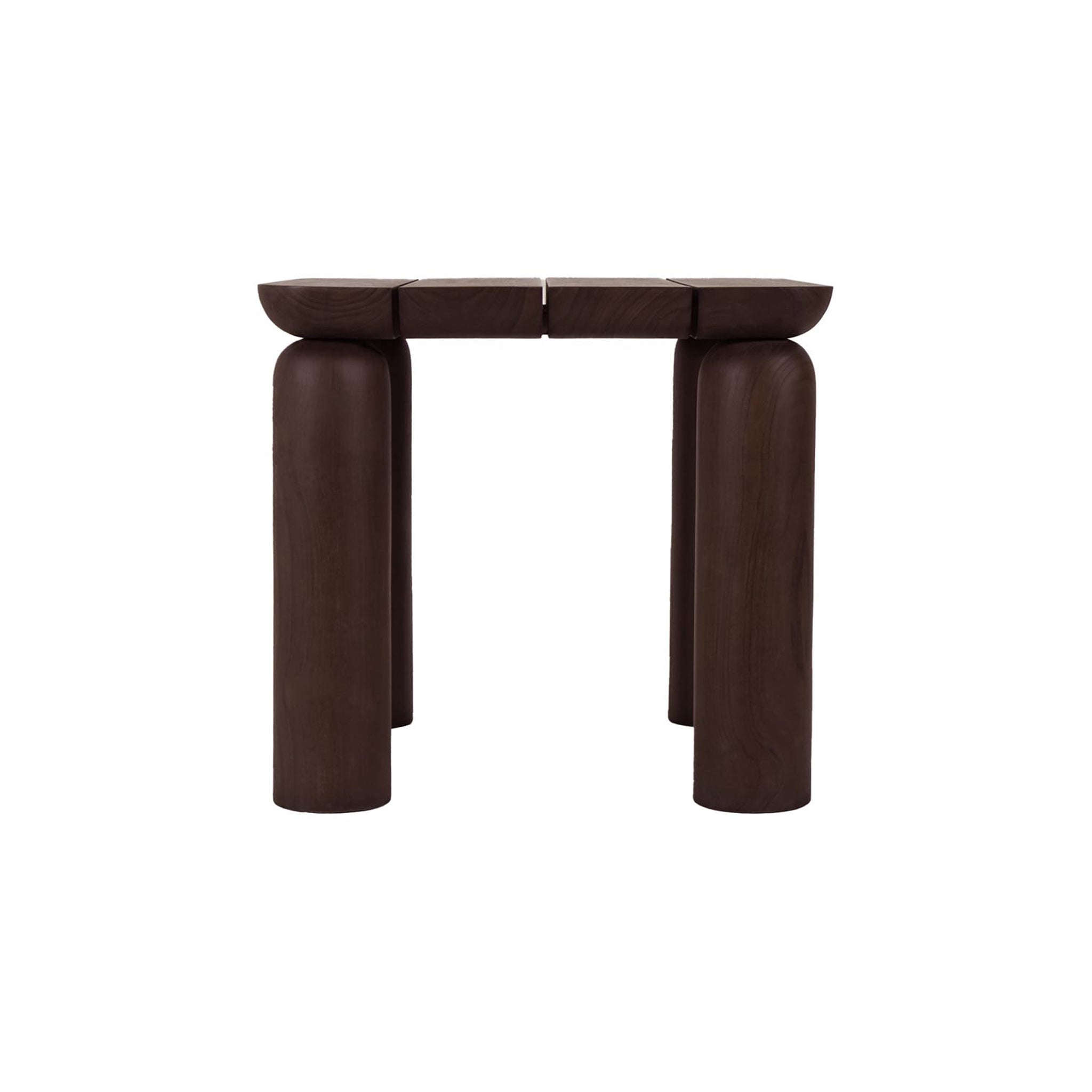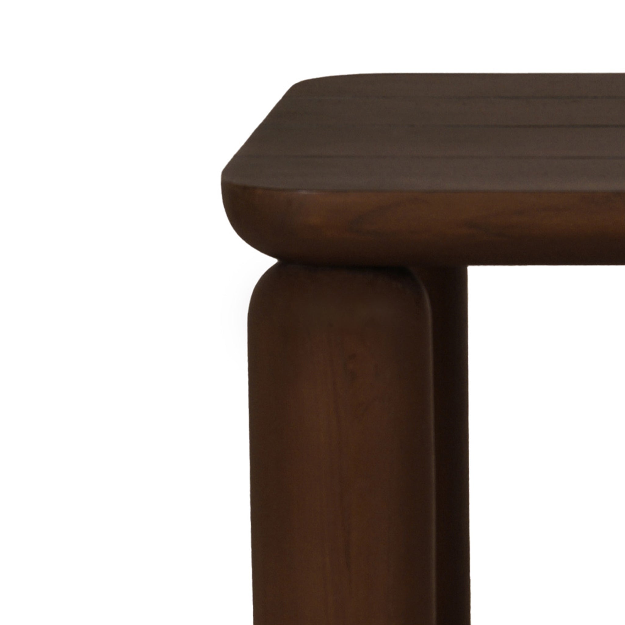 Durable and weather-resistant, the Benedetta outdoor side table adds a playful touch to the outdoor space without compromising on elegance. This solid teak side table features a slatted top and round cylindrical legs in a toasted brown finish. Its unique design features a floating effect where the sloped top piece interacts with the legs, creating visual interest.
