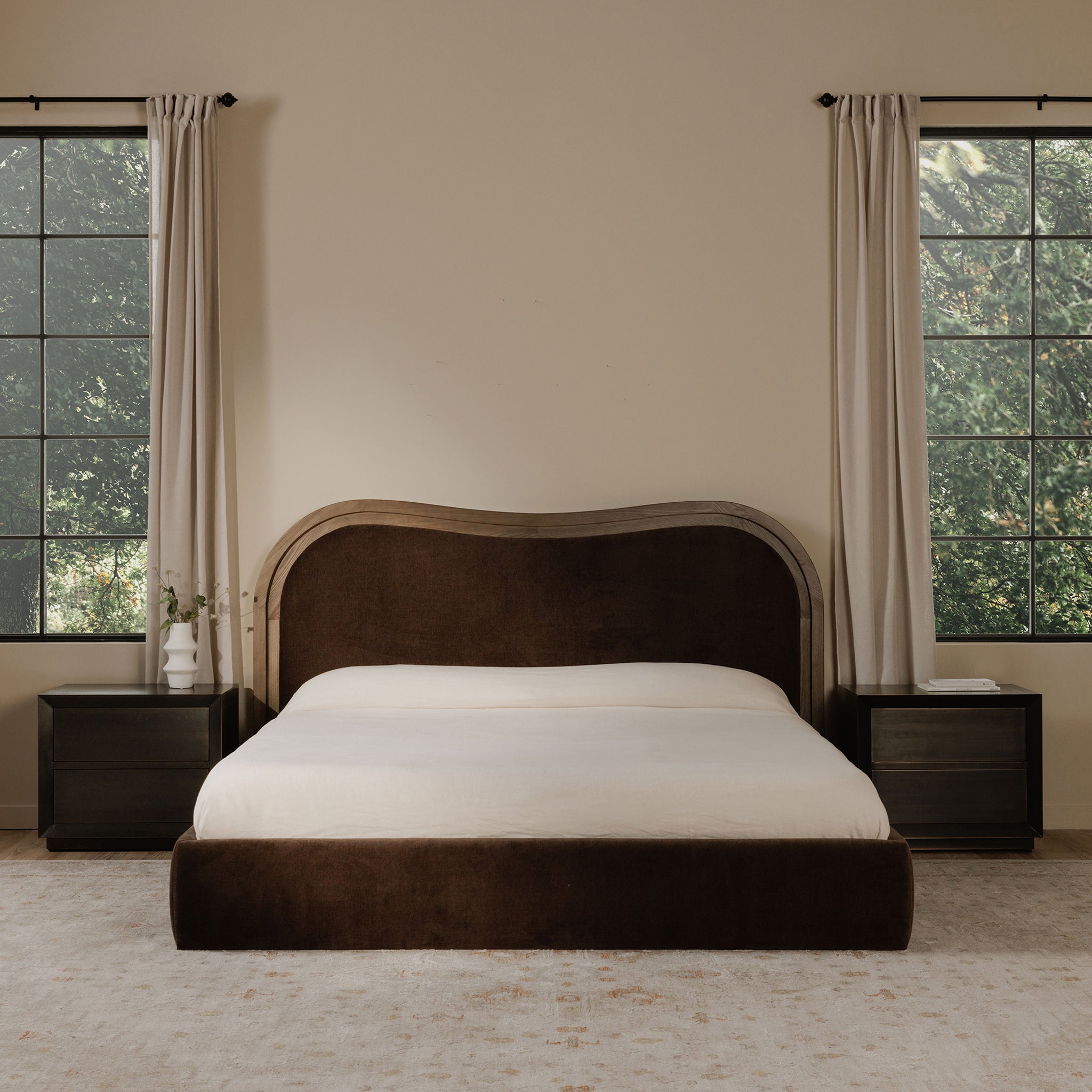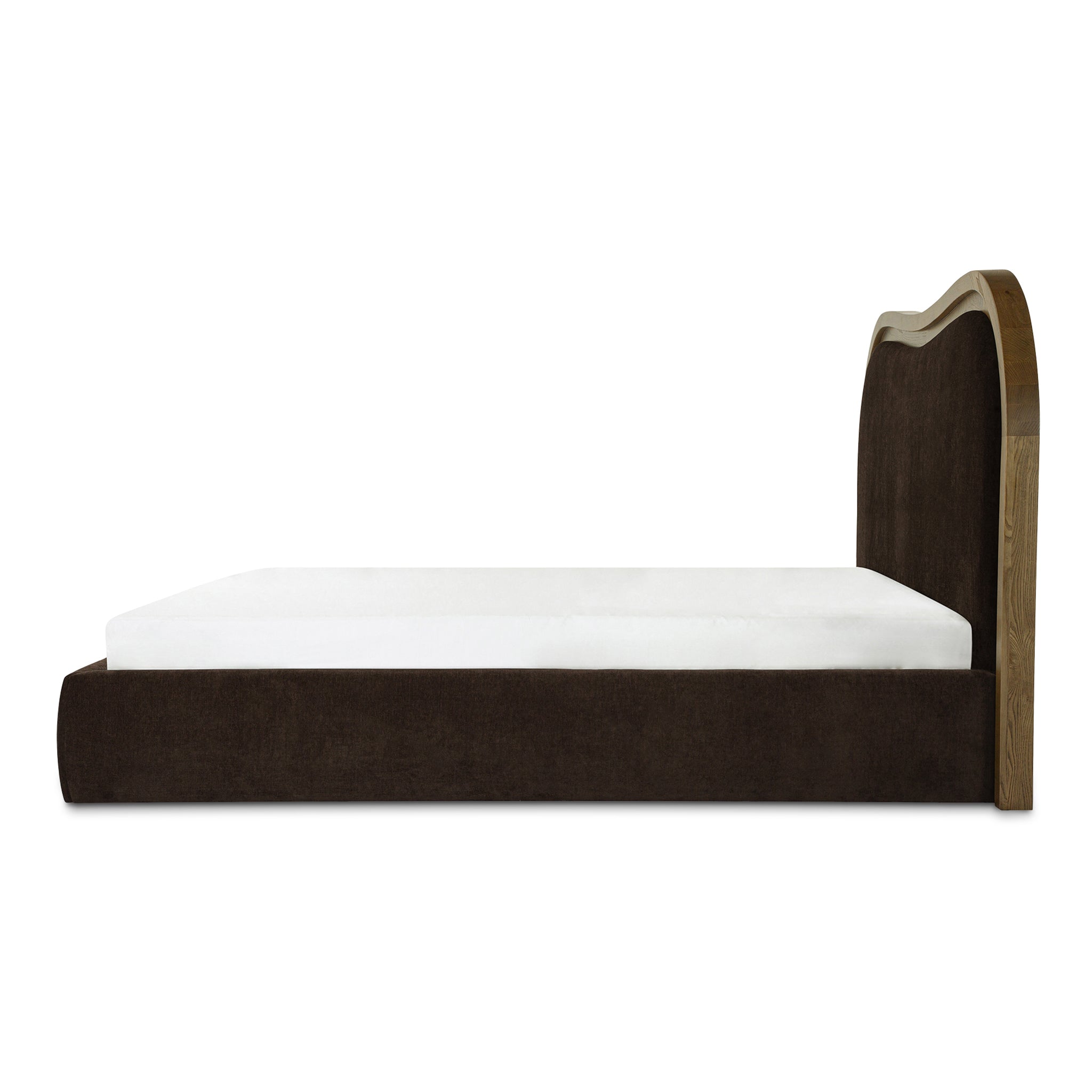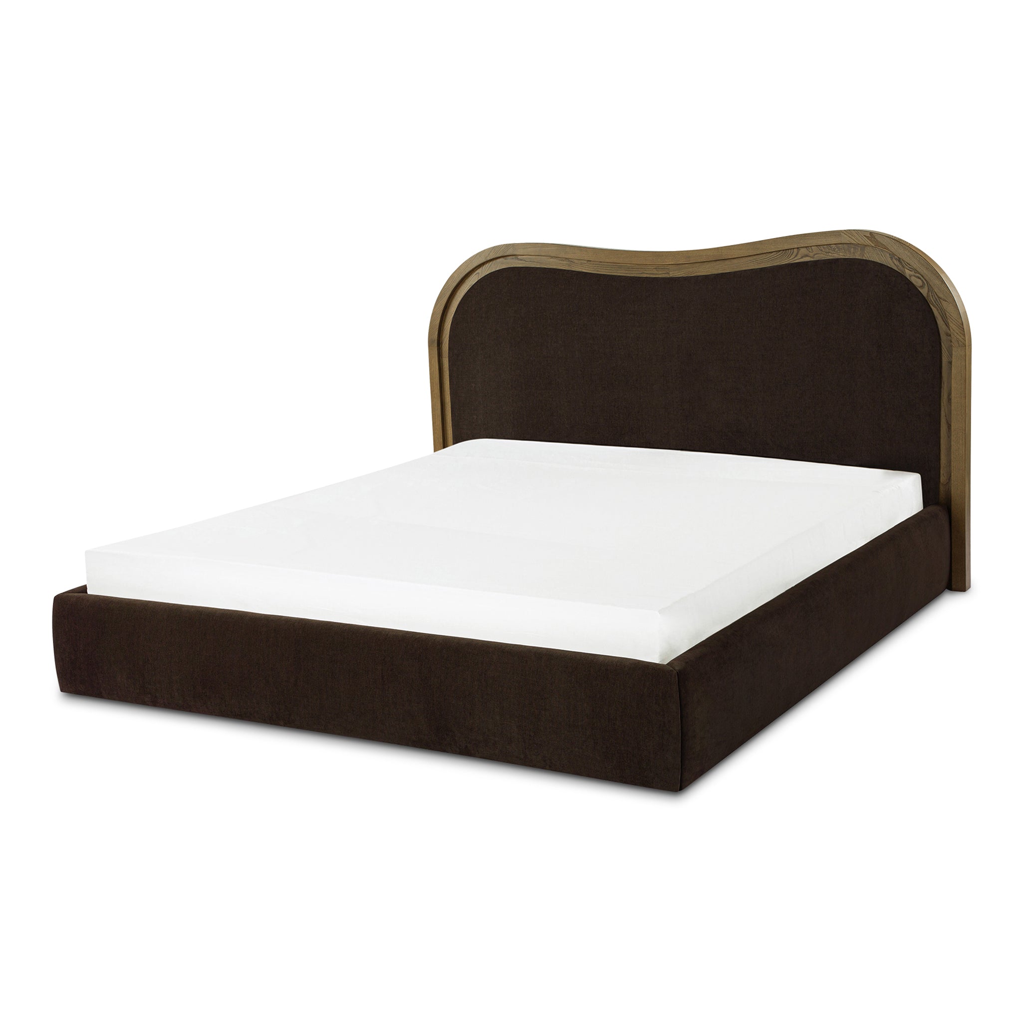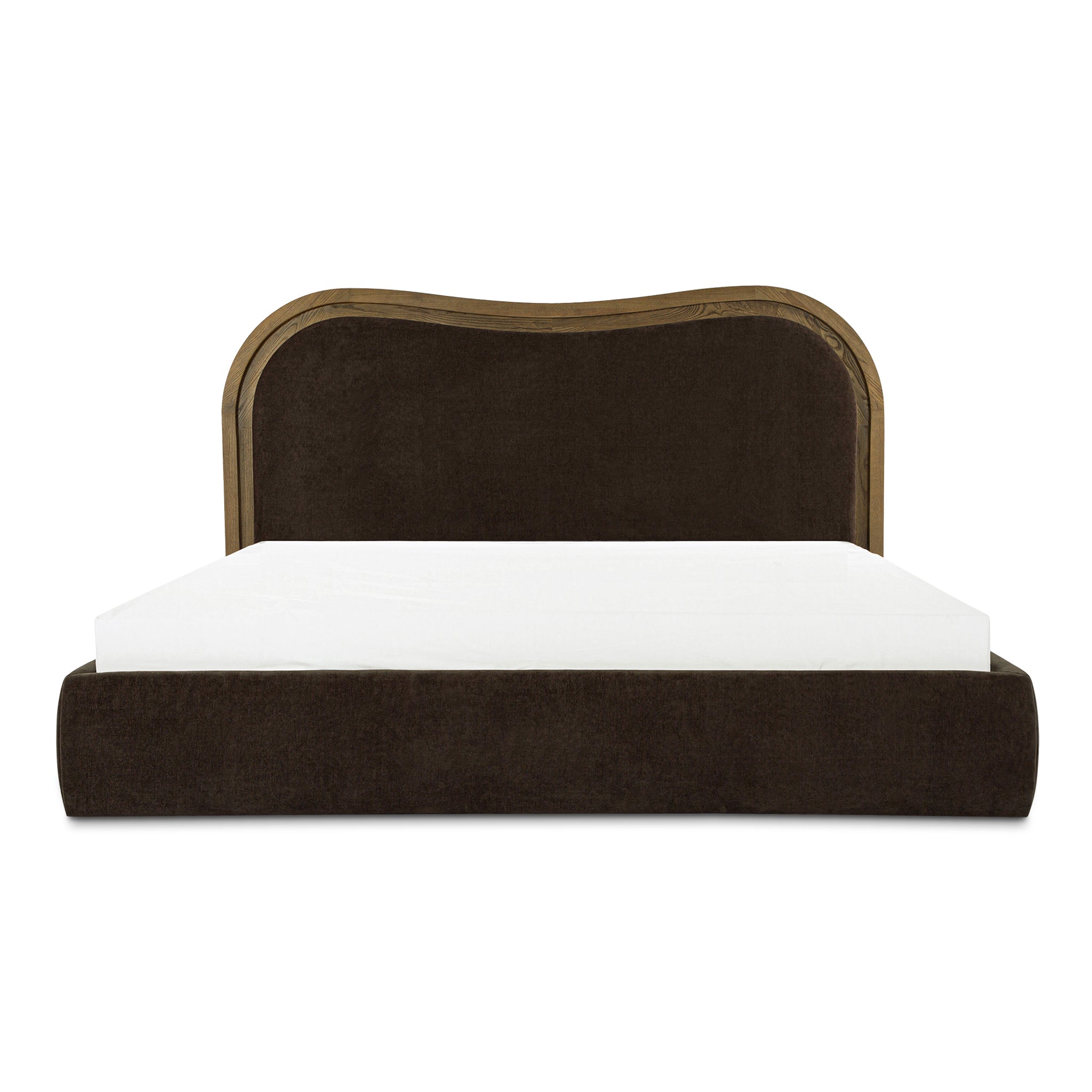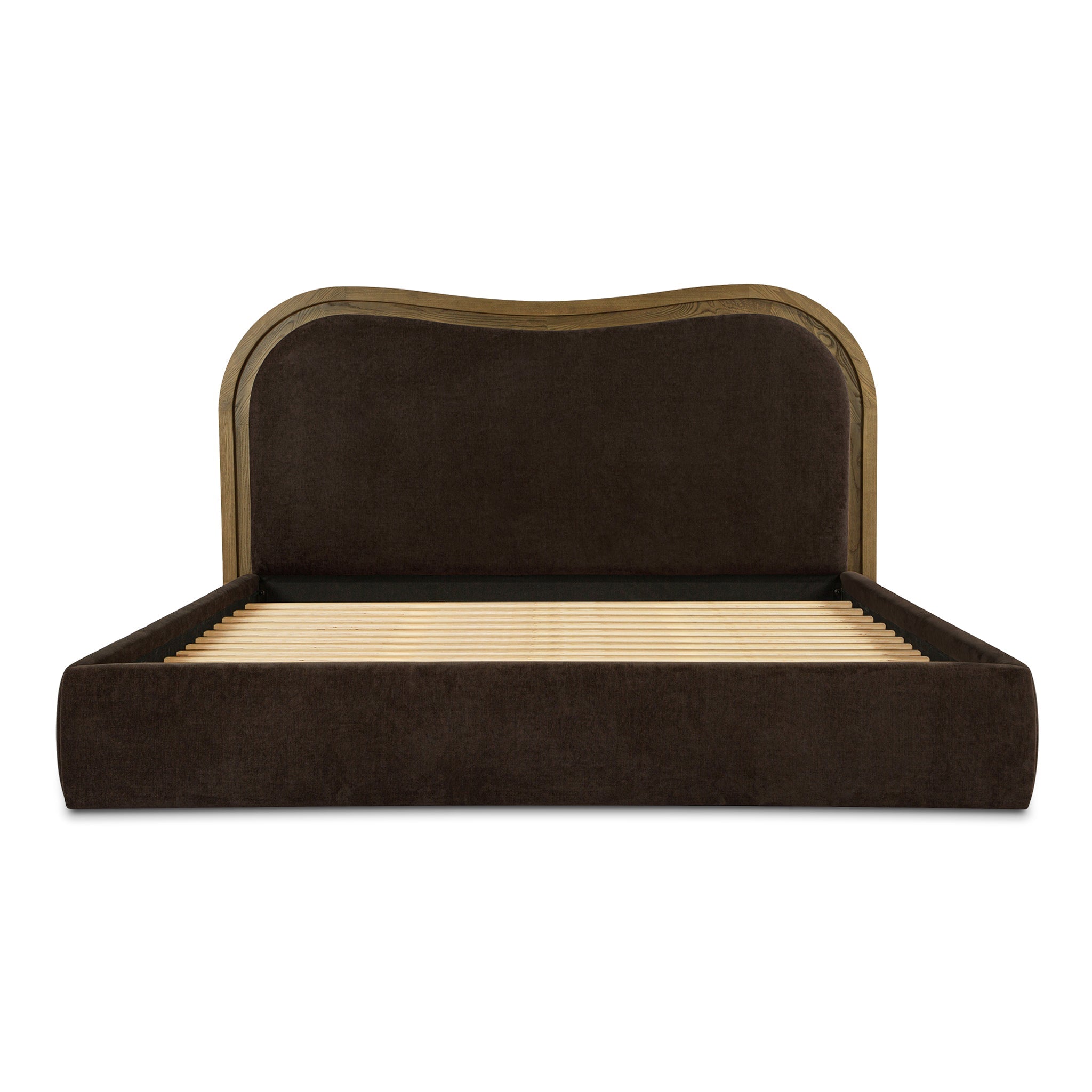 A wave bed, but make it architectural. Coralie brings Art Deco curves to bedtime with a headboard that looks carved, not crowded. The stepped-down inset frame shapes a clean wave, while foam-and-fiber padding keeps your sit-up-and-read routine comfortable. Wrapped in 100% polyester upholstery and grounded by an ash frame in a mid-brown finish, it feels balanced and intentional. Included slats support your mattress-no box spring needed. So your room gets the statement, and you rest.