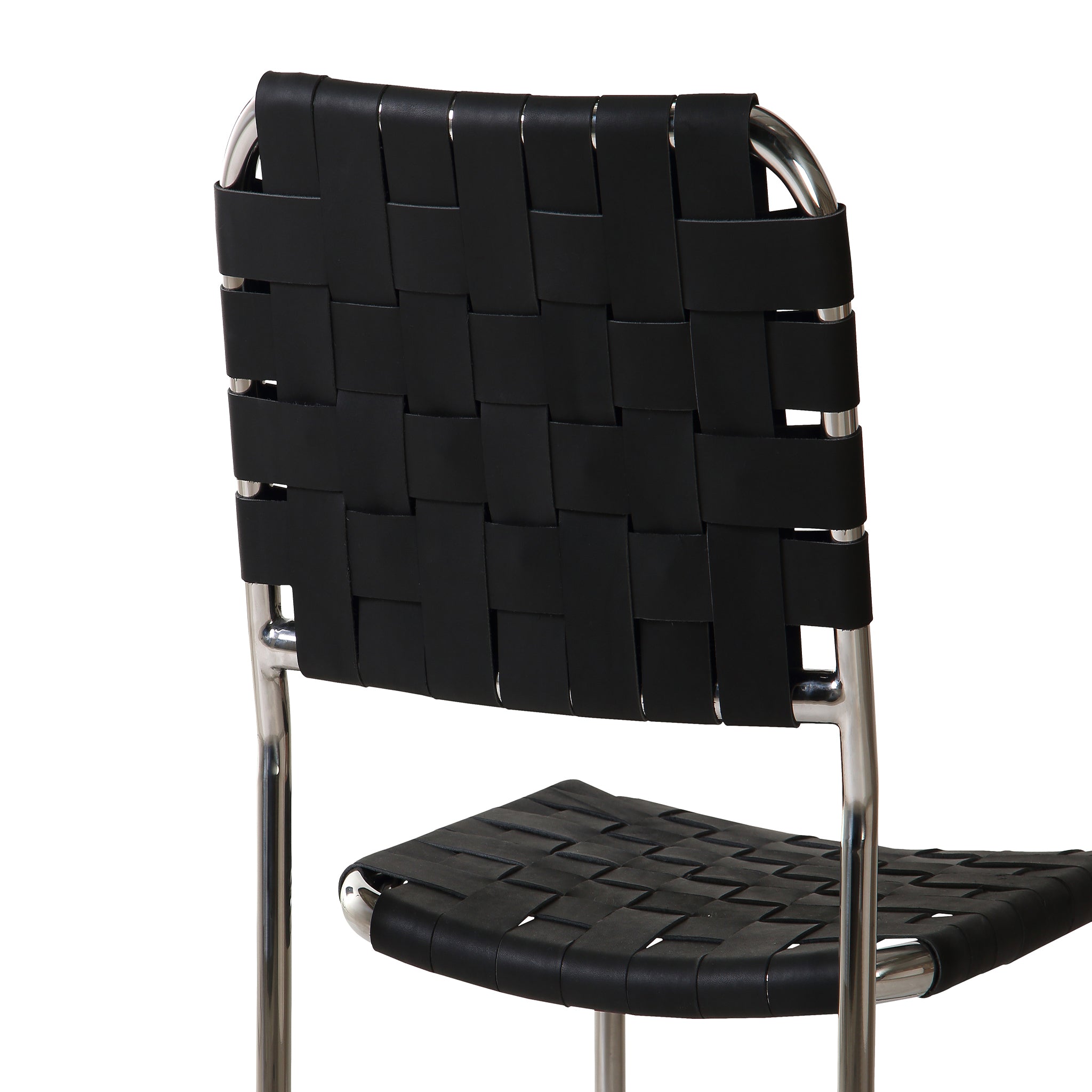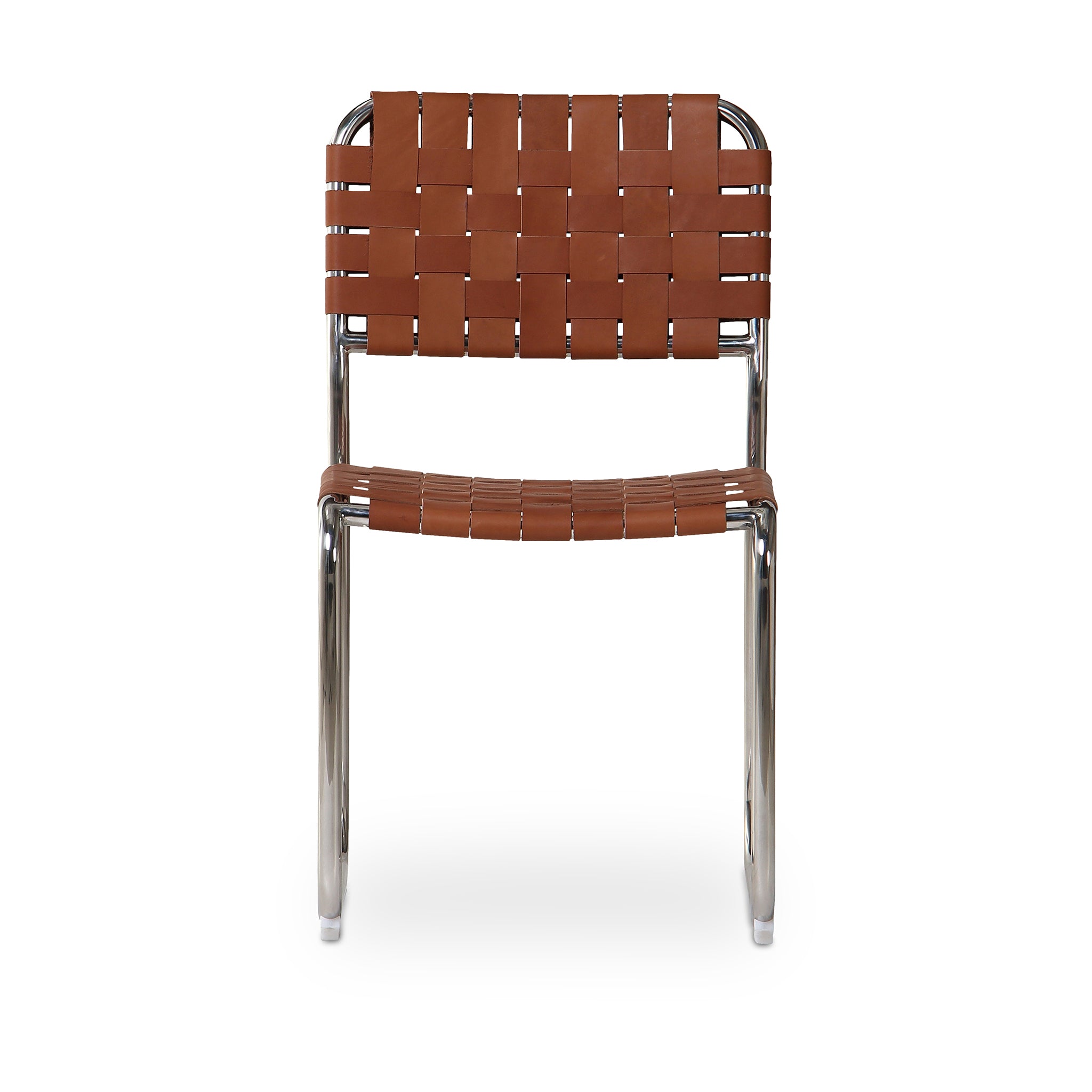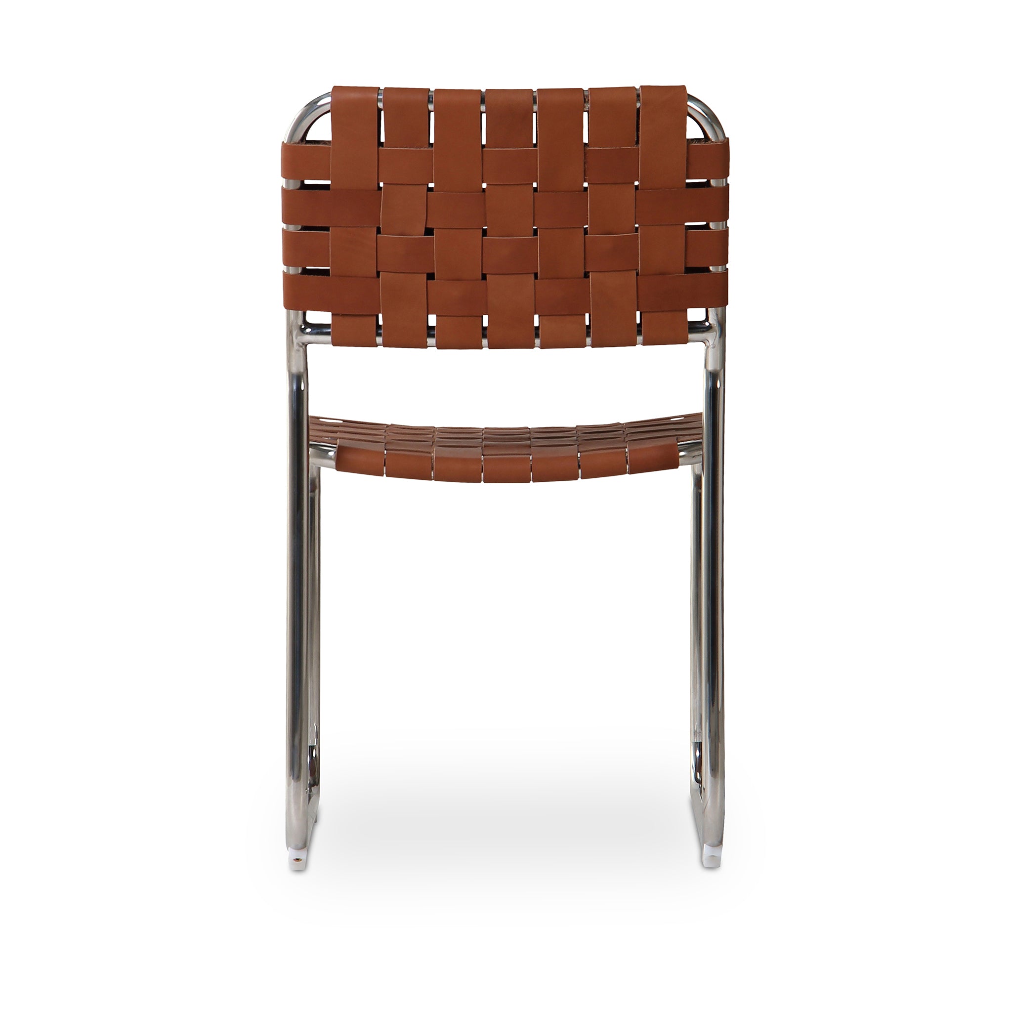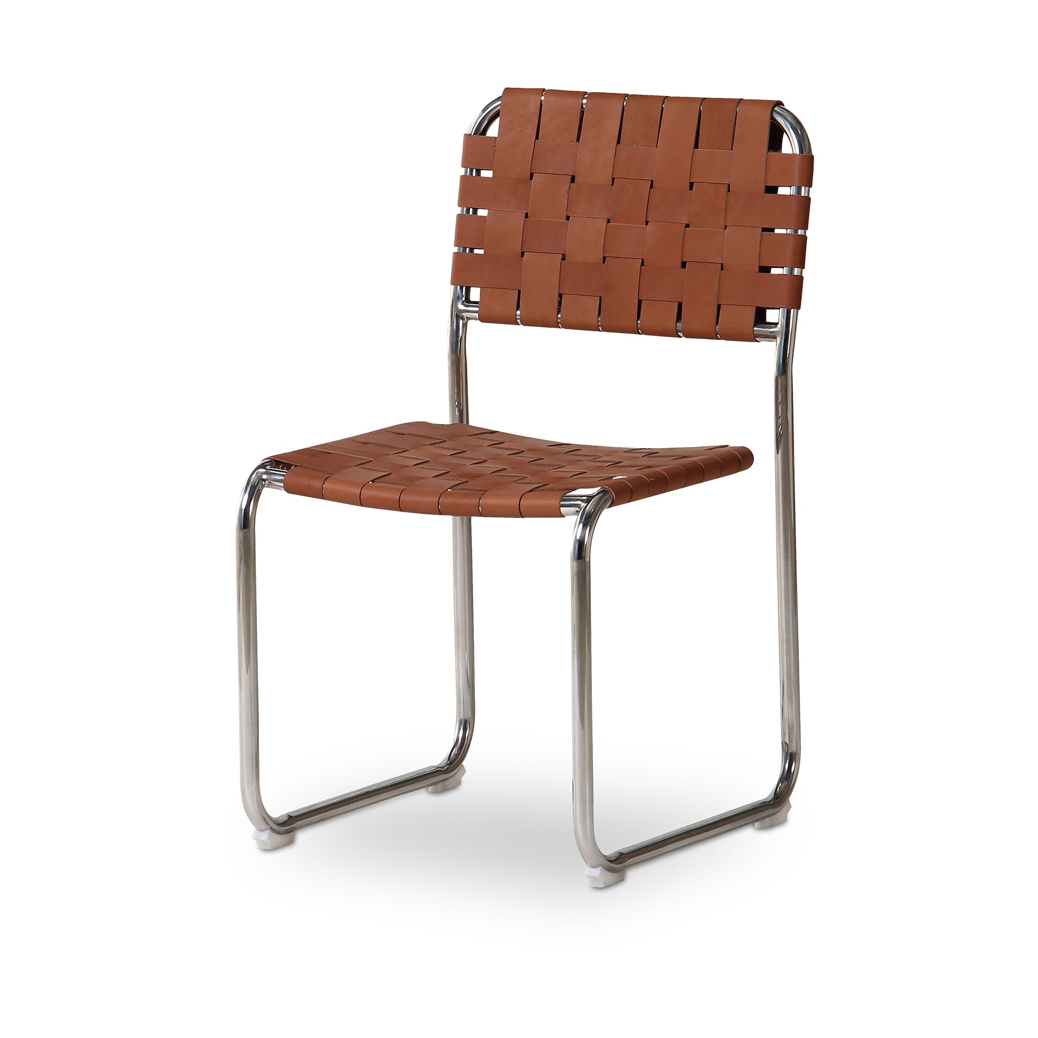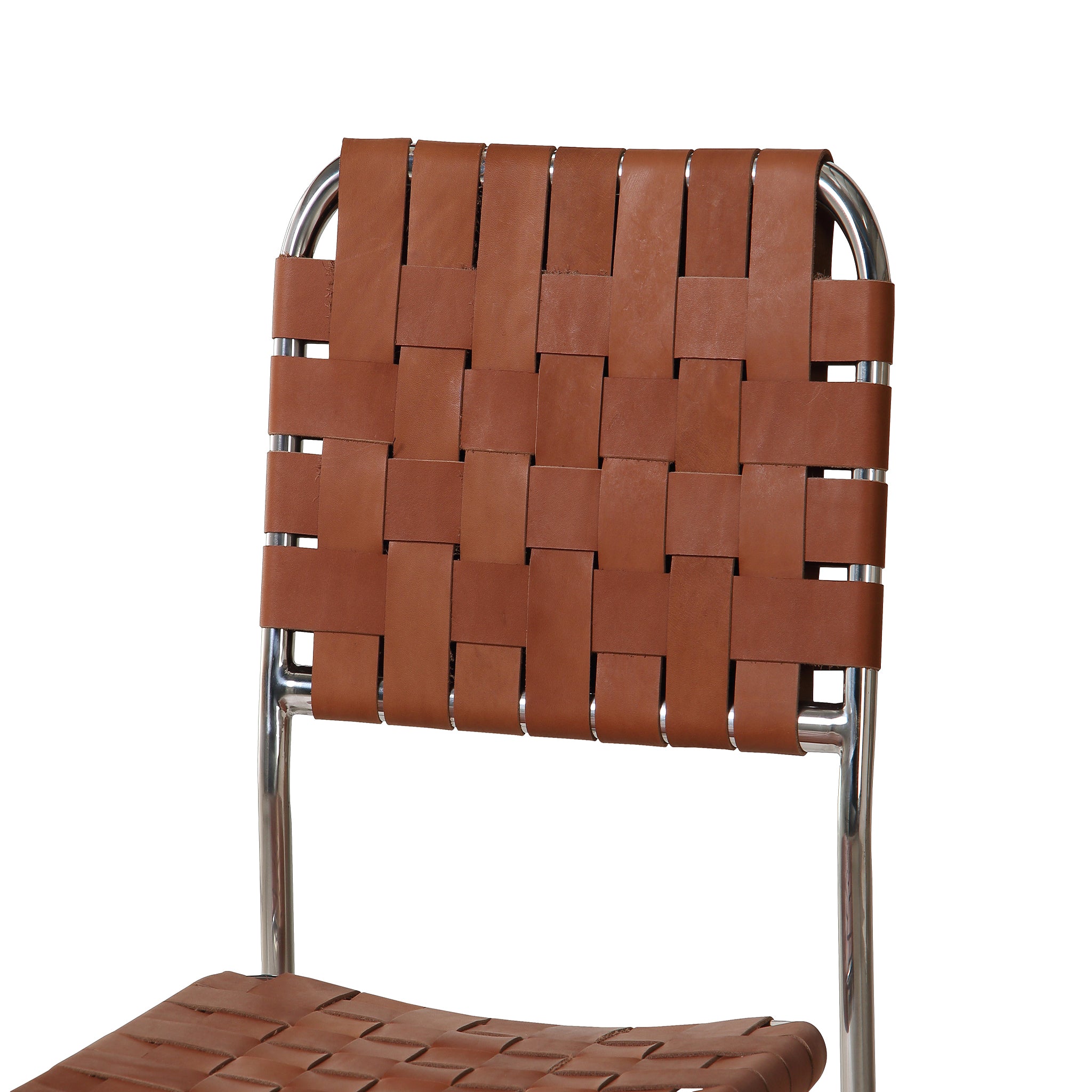 The Eli dining chair is a trend-forward piece blending handmade charm with industrial chic. It features a sturdy chrome iron frame, artistically complemented by handwoven leather straps in a classic basketweave pattern across the seat and back. The leather's rich texture against the sleek metal base and cut-out back adds visual depth, while a distinctive gap between the seat and back enhances its modern appeal.