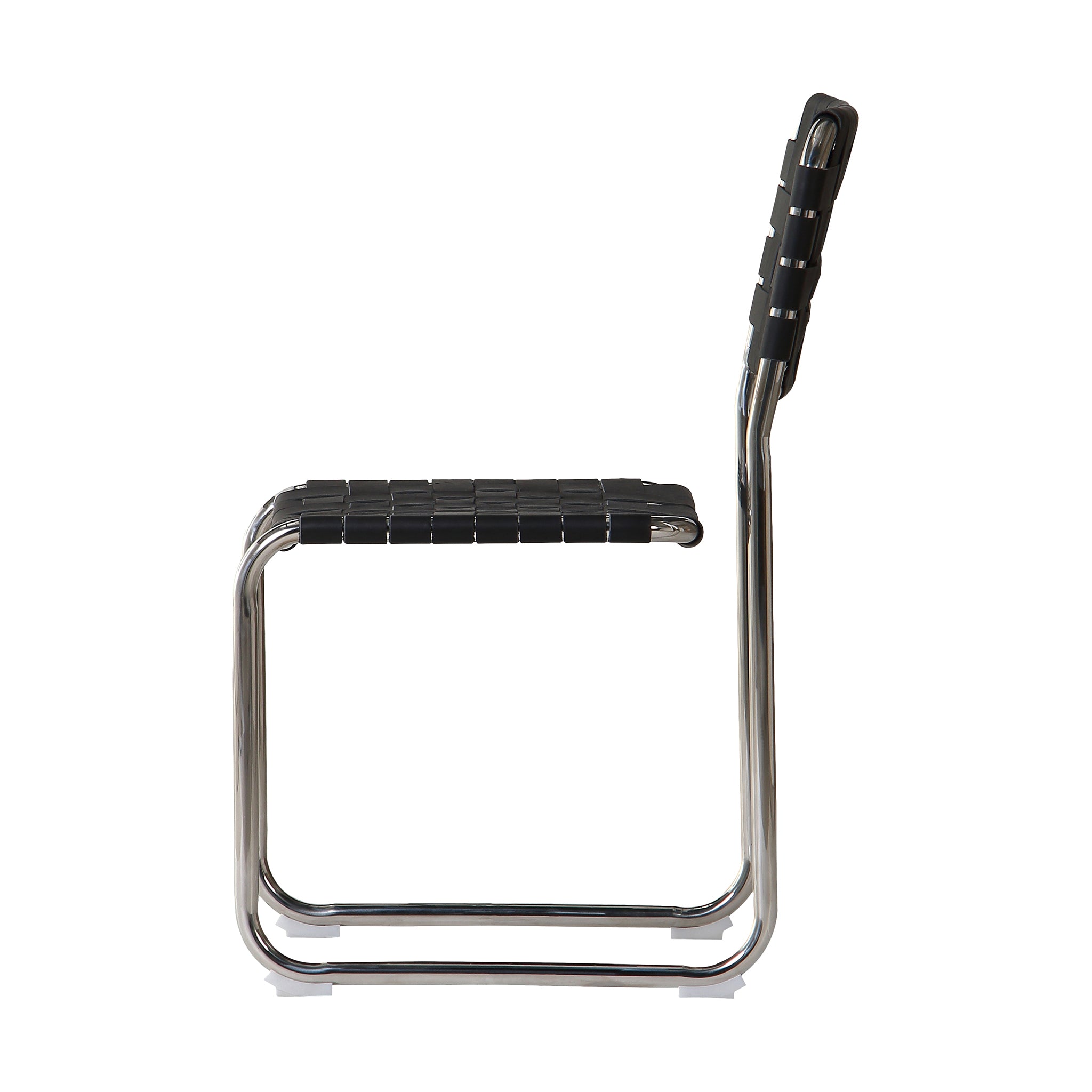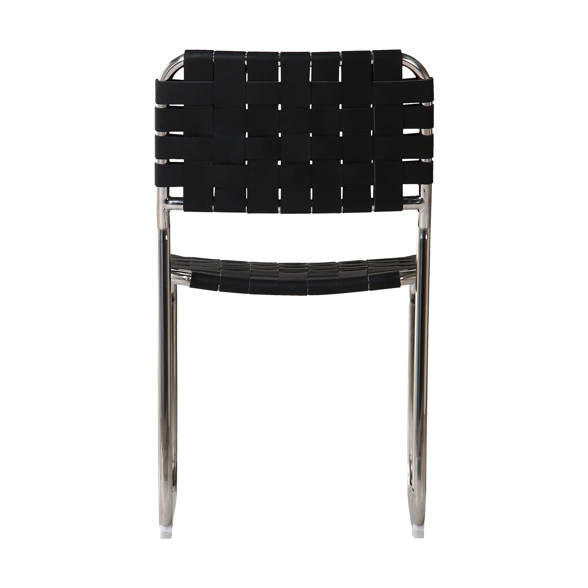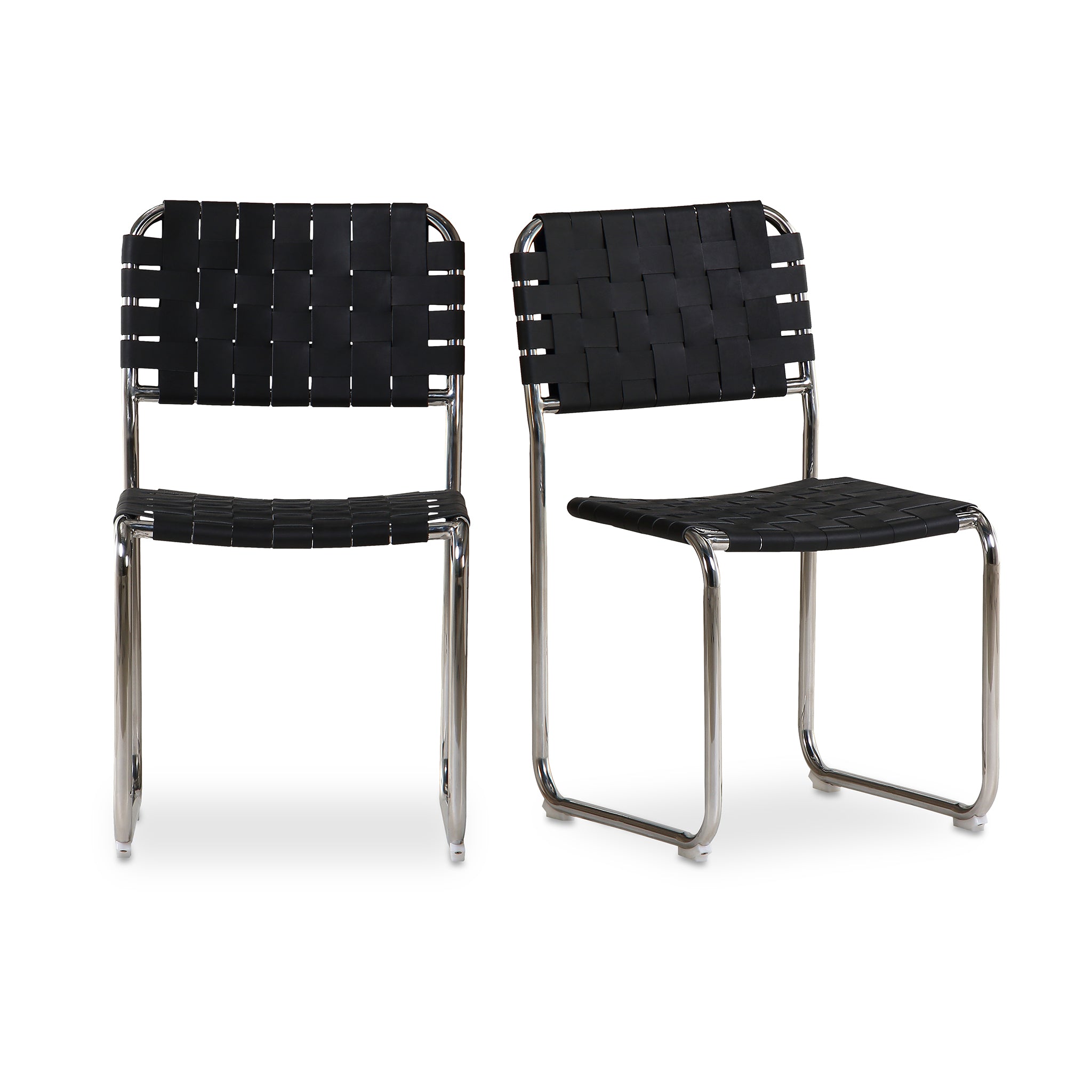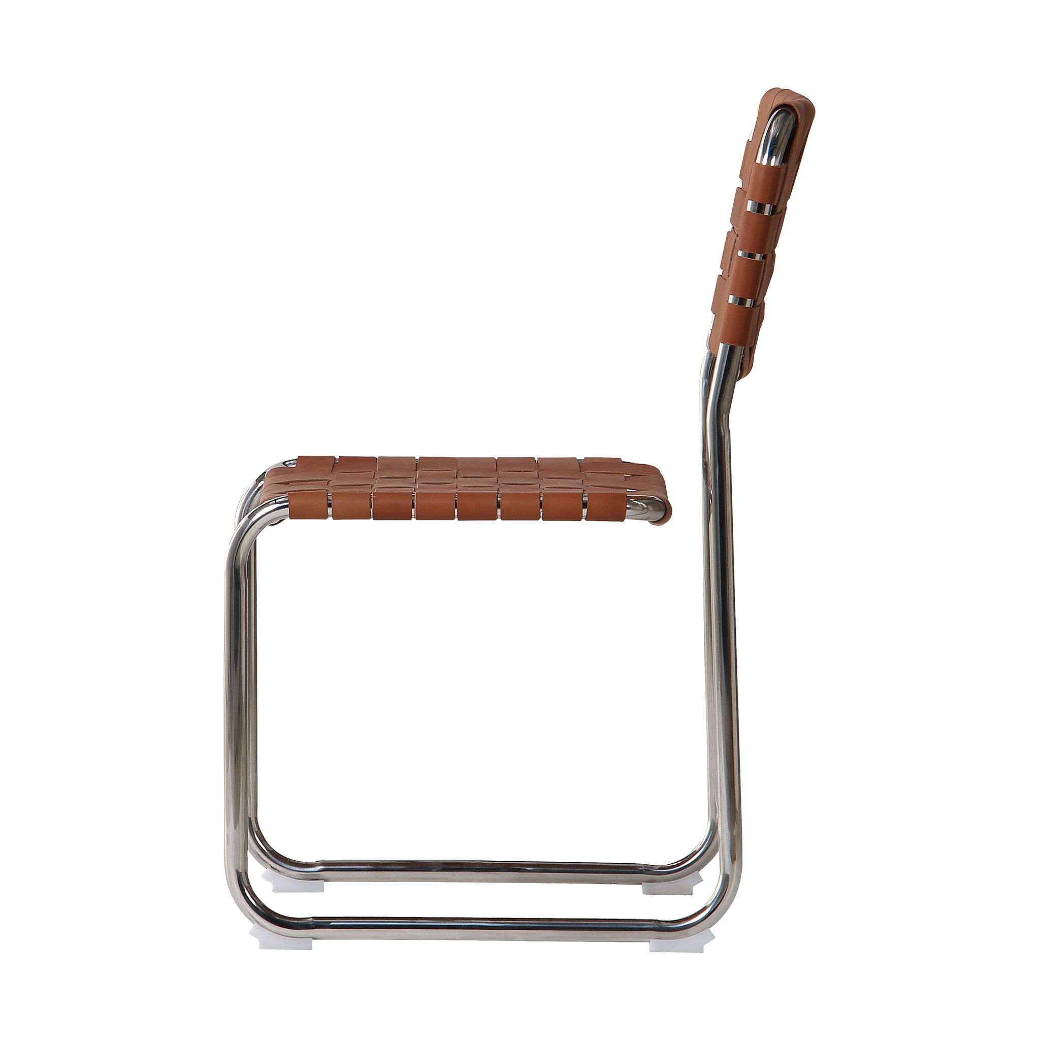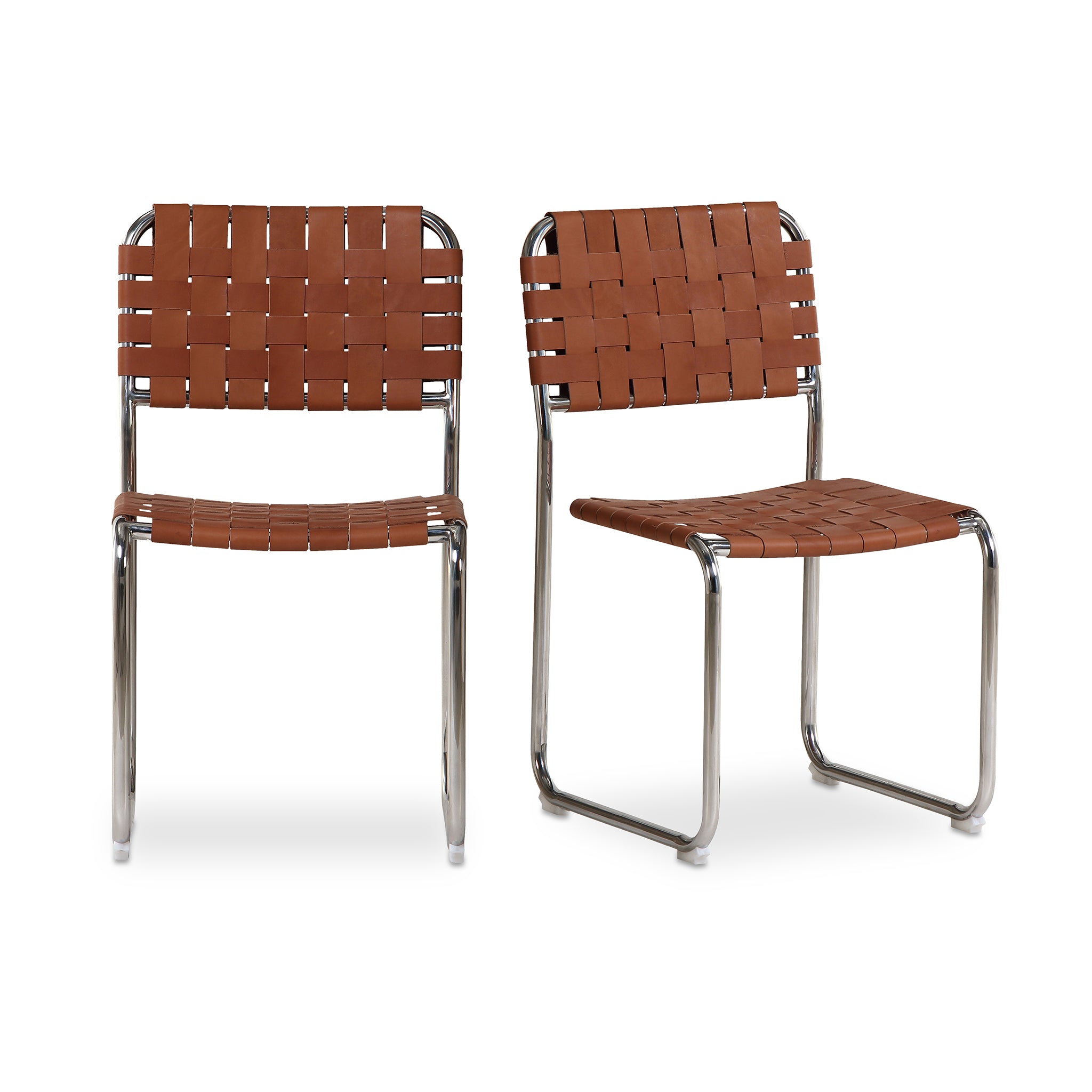 The Eli dining chair is a trend-forward piece blending handmade charm with industrial chic. It features a sturdy chrome iron frame, artistically complemented by handwoven leather straps in a classic basketweave pattern across the seat and back. The leather's rich texture against the sleek metal base and cut-out back adds visual depth, while a distinctive gap between the seat and back enhances its modern appeal.