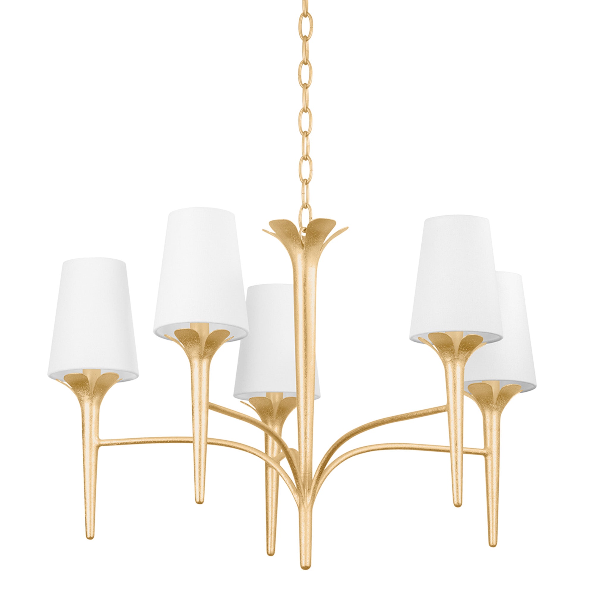 Slender Gold Leaf arms with pretty petal-like accents bring a warm, floral feeling to this sculptural design. Tapered white linen shades pair perfectly with the natural, organic vibe. Both the one-light sconce and the five-light chandelier will add a soft glow and a fresh style to any space.