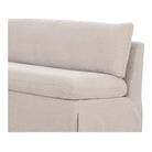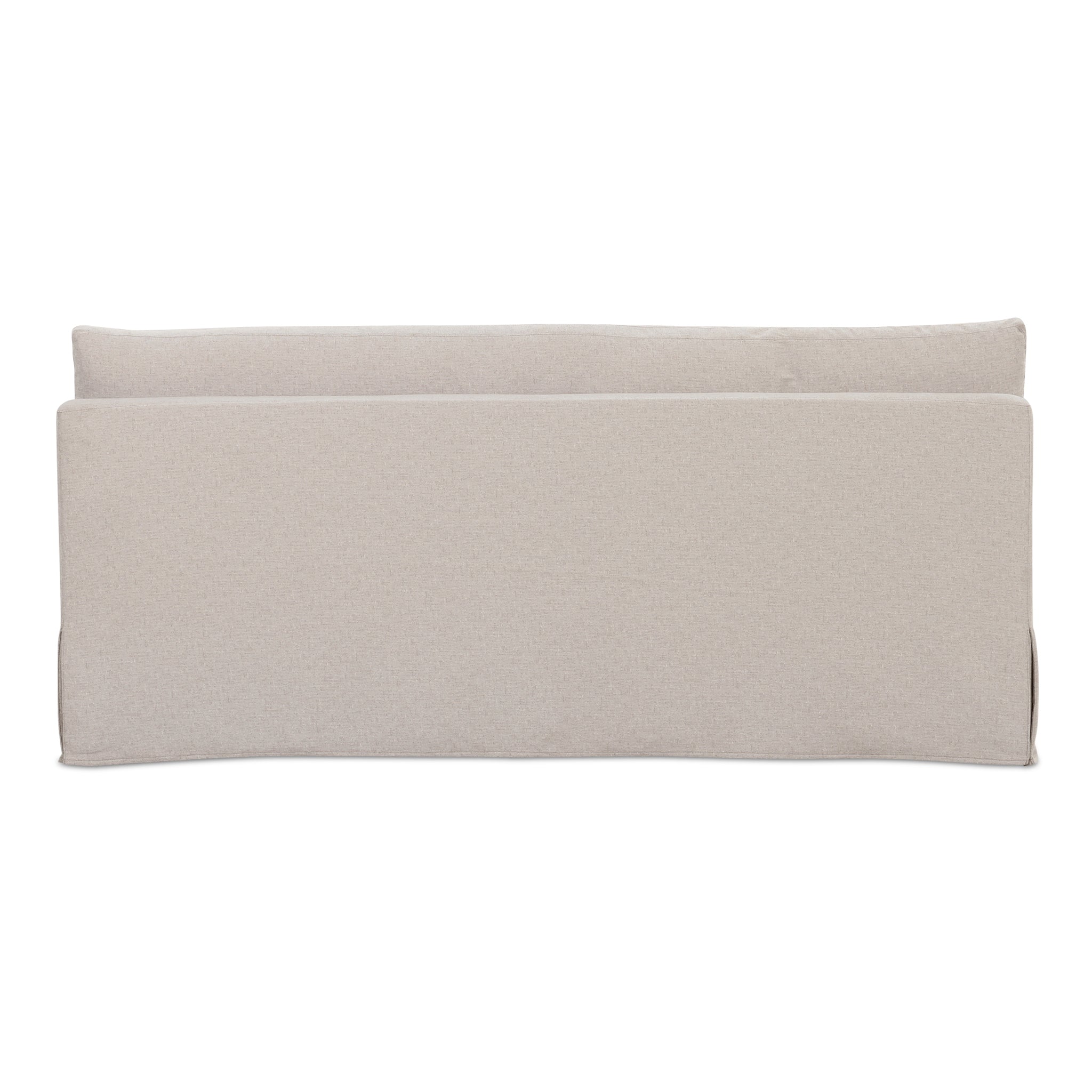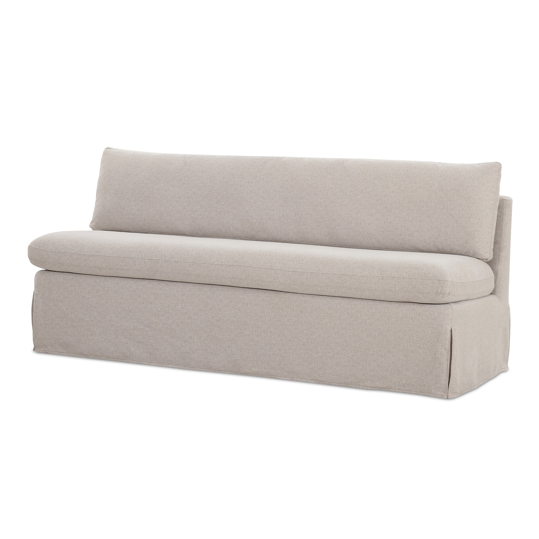 The Fiona slipcover dining bench's snug-fitting, washable slipcover with inverted pleats offers a tidy appearance and effortless upkeep. A slight tilt encourages a relaxed seating posture with a pillow back and seat cushions for comfort. Designed to be modular, it includes alligator clips to connect with other pieces in the collection, adapting seamlessly to various dining table sizes.