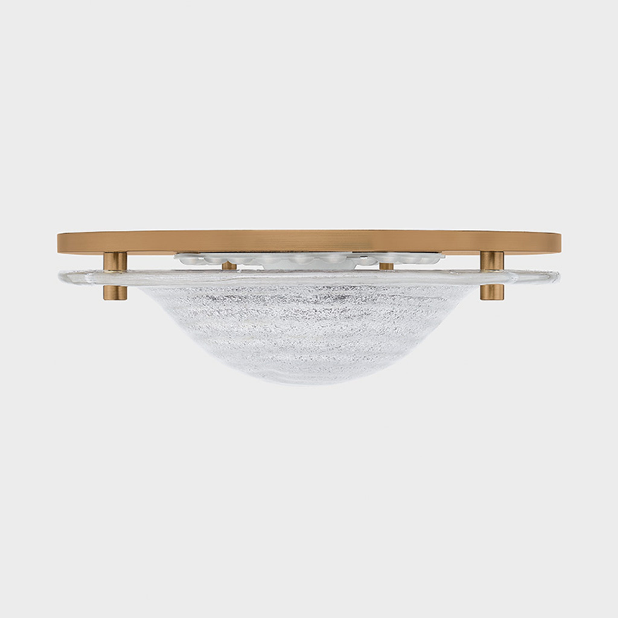 The striking silhouette of Halston hovers between the earthy and ethereal, the icy and molten. Both a functional flush mount and a work of art, this design-forward fixture seems to drip from the ceiling pan as if it were laden with light. The cast piastre glass lends an otherworldly texture, with a striking concentric ring pattern visible from below. Warmed by the lustrous Patina Brass framework, Halston transcends the ordinary with its captivating glow.