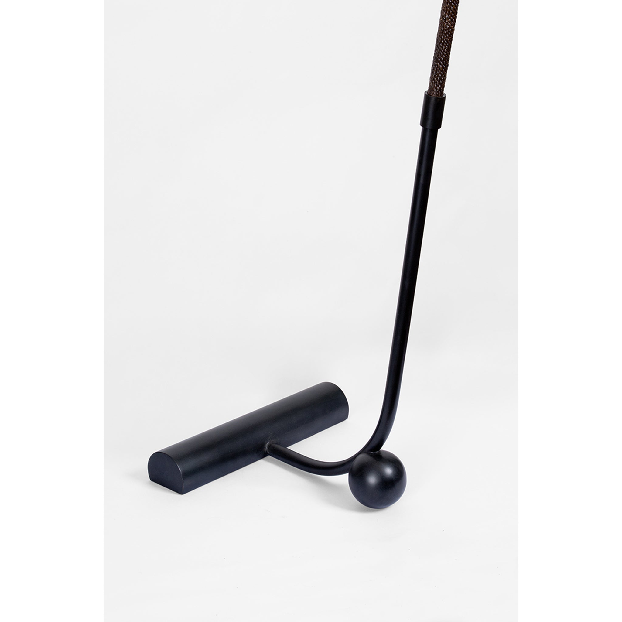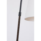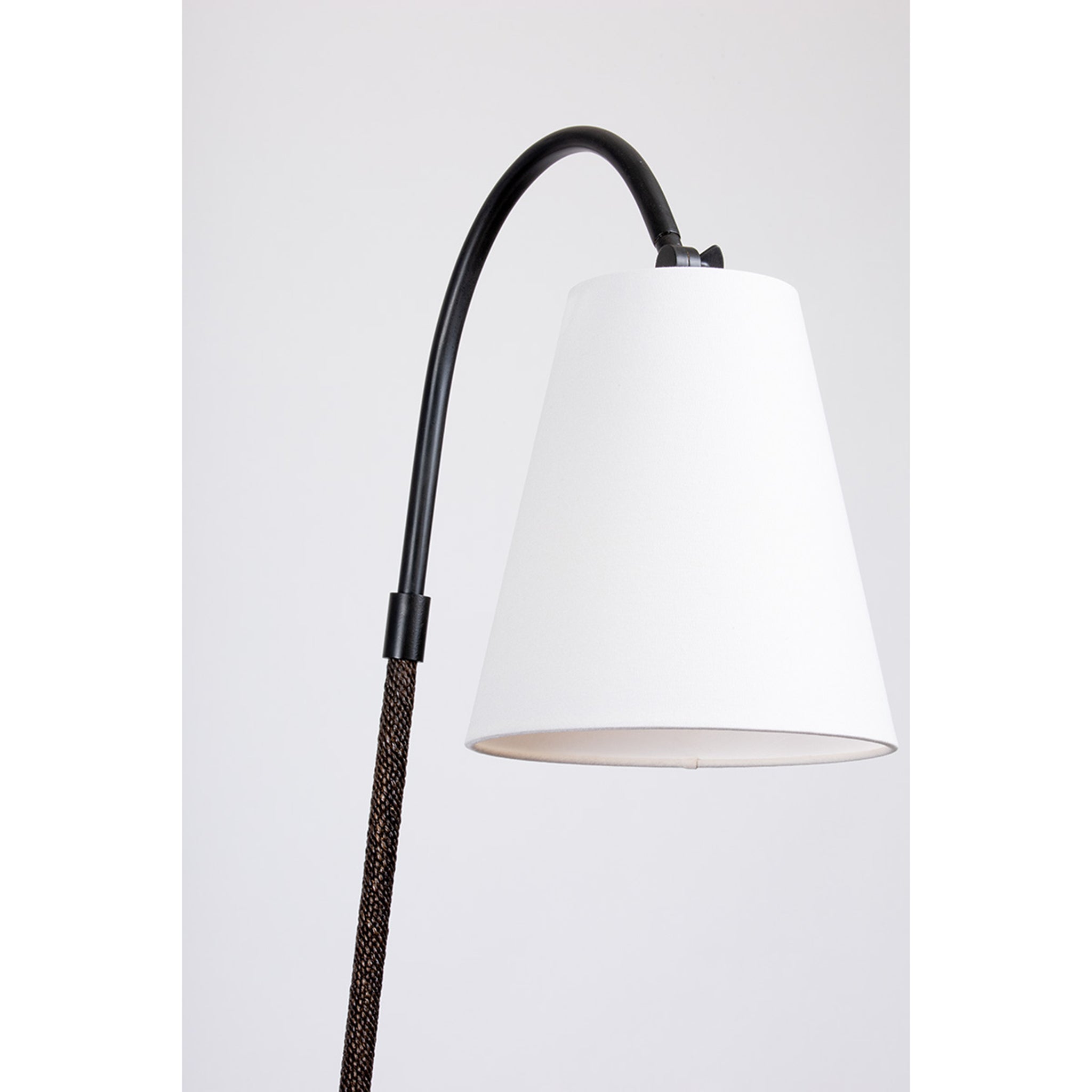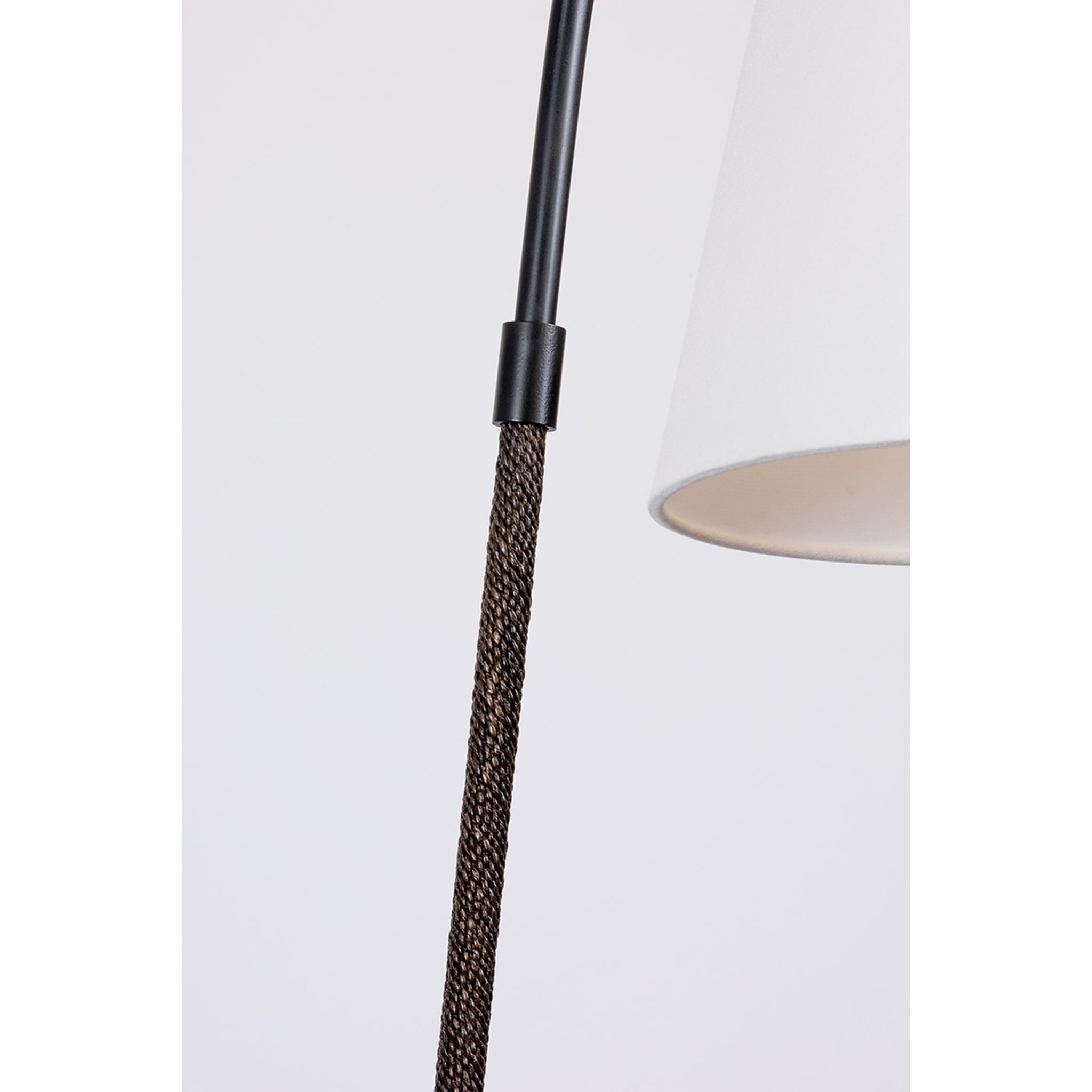 This energetic, fluid floor lamp gives the illusion that the sweeping slender stem is balancing on the metal orb at the base. The varying textures of the Forged Iron and the abaca rope in the stem add to the sense of movement and the white linen shade breaks up the darker finish of the iron and the rope.