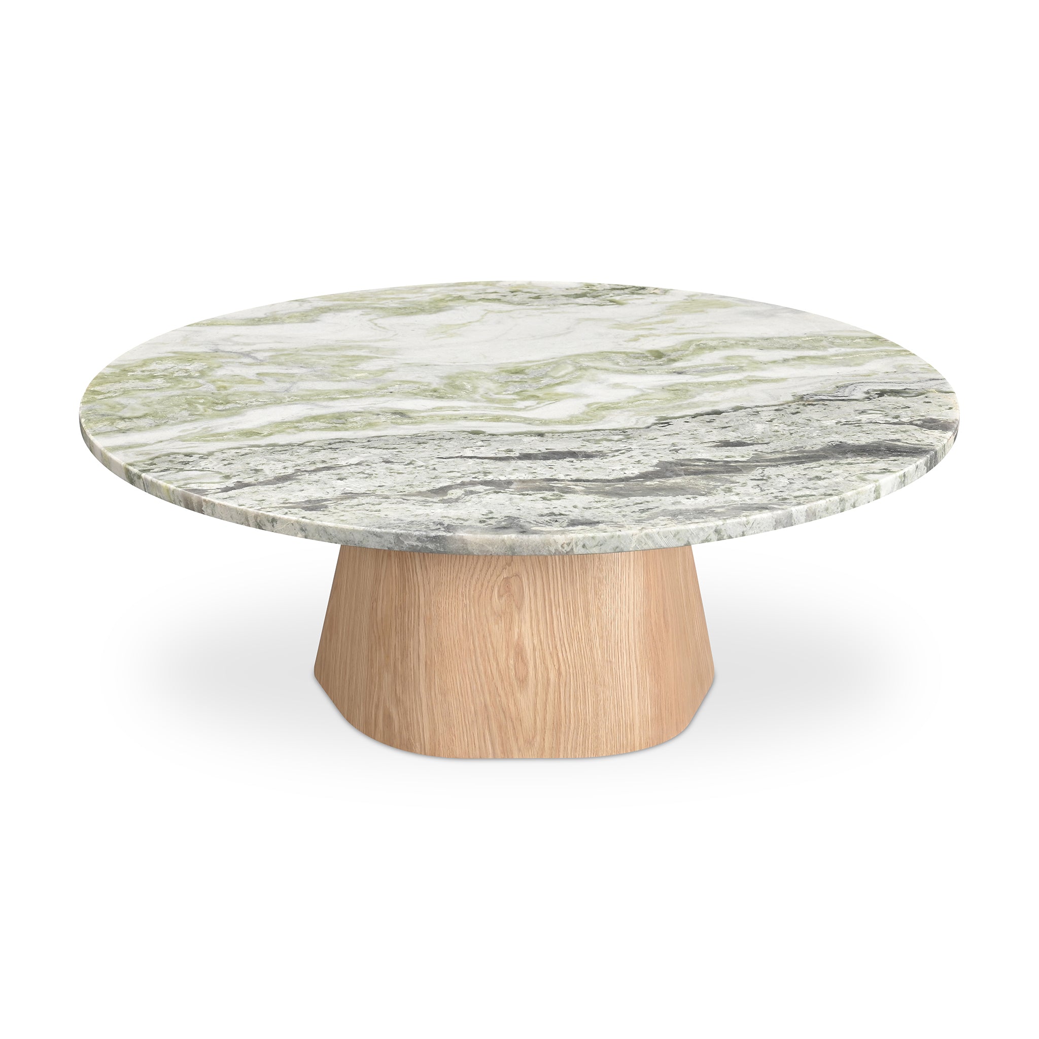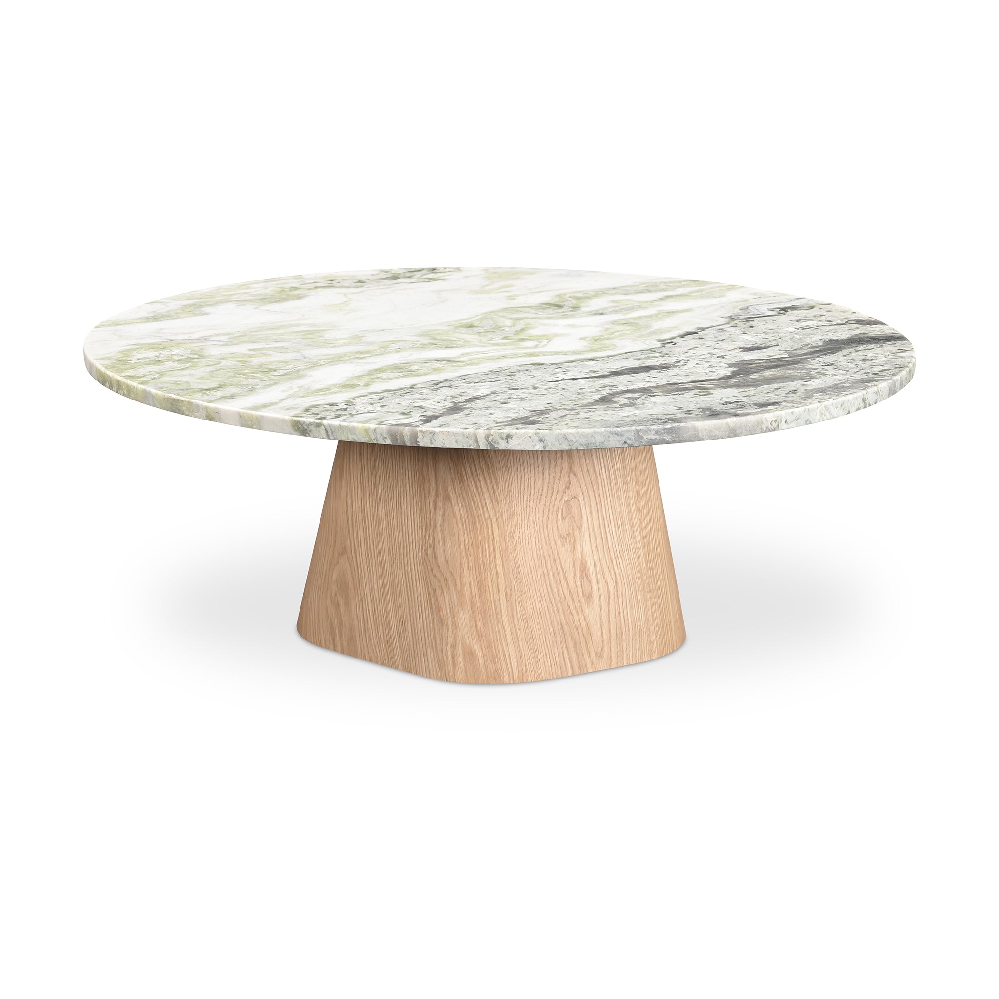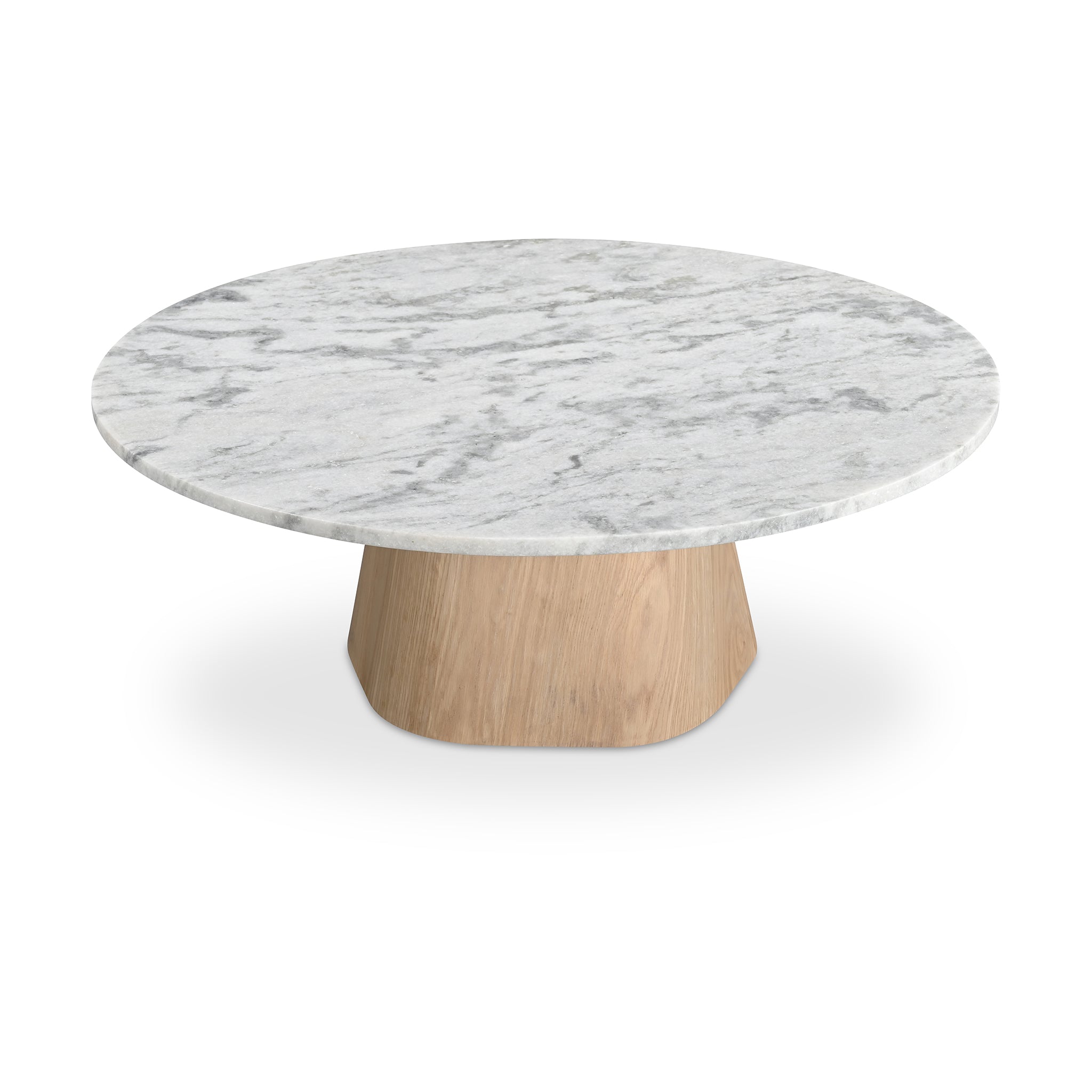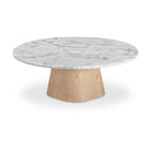 The Isaiah coffee table is a harmonious contrast of materiality and tactility, where a weighty base meets a visually light marble top. With five connected sides equipped with softened, rounded edges, the base assumes an organic appearance, its natural color subtly softening the marble top for enduring visual appeal.