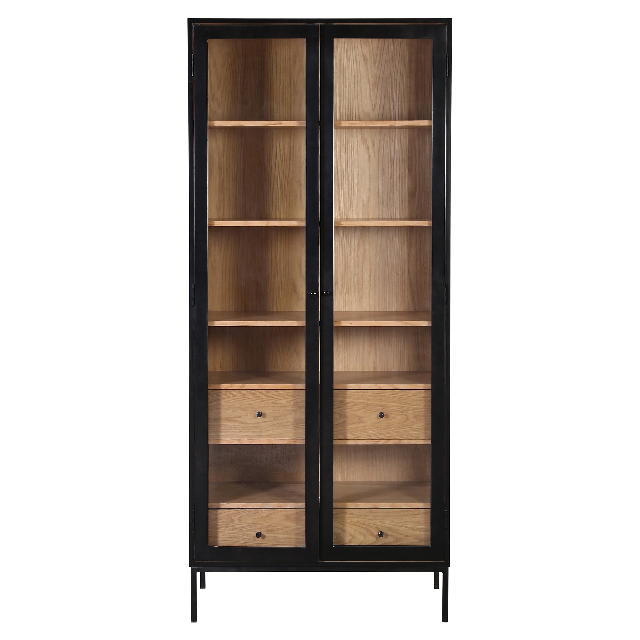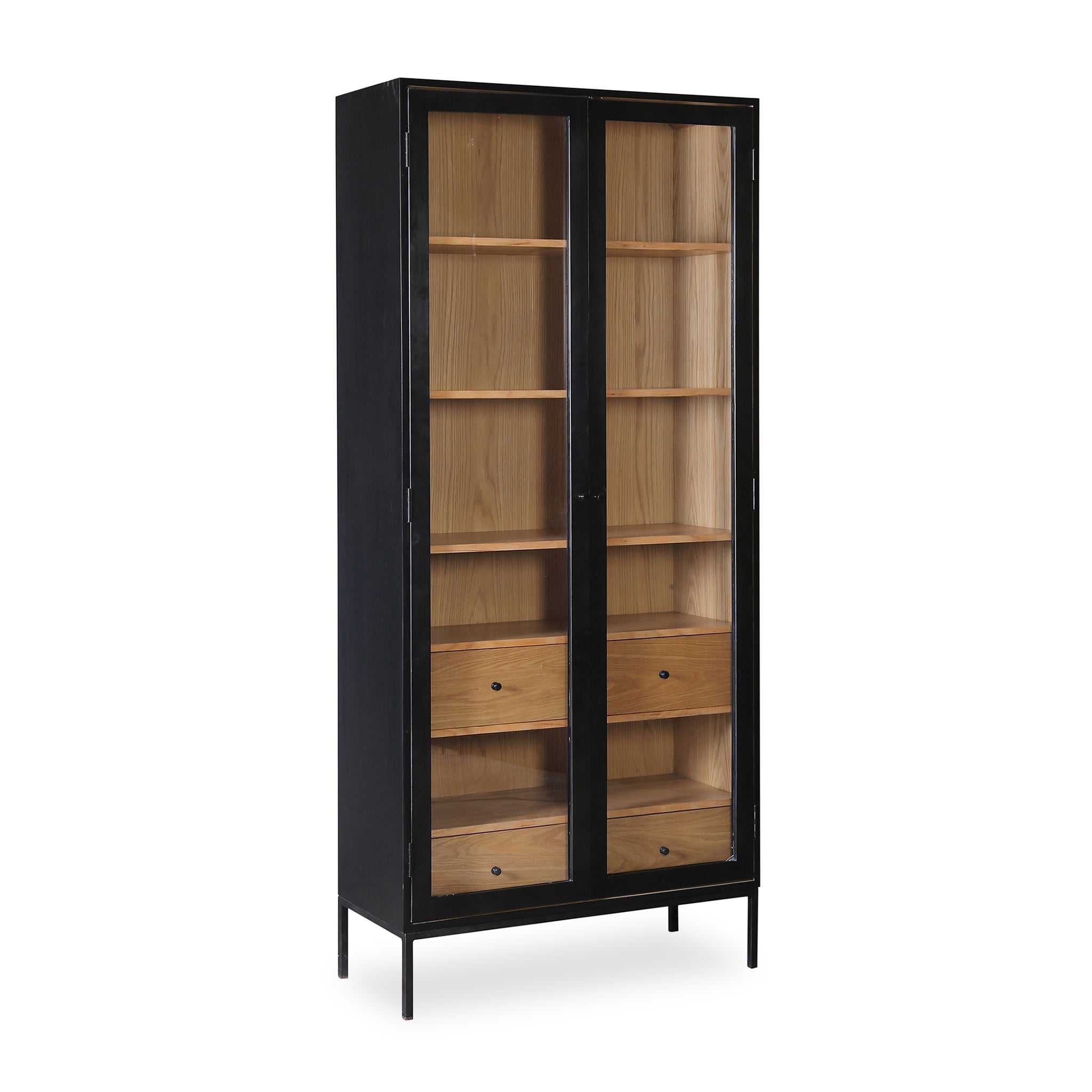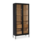 Crafted with precision, the Jenkins Cabinet boasts a striking blend of matte black and natural finishes. Its sleek silhouette, defined by black-stained exterior panels and slender legs, emanates sophistication and modernity. Through the large glass doors, the interior shelving is elegantly revealed, showcasing a beautiful natural wood tone. This interplay of colors creates a captivating contrast, adding depth and visual intrigue to any space. Whether utilized to display treasured items or to organize everyday essentials, the Jenkins Cabinet stands as a testament to both style and functionality.