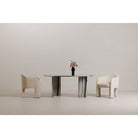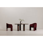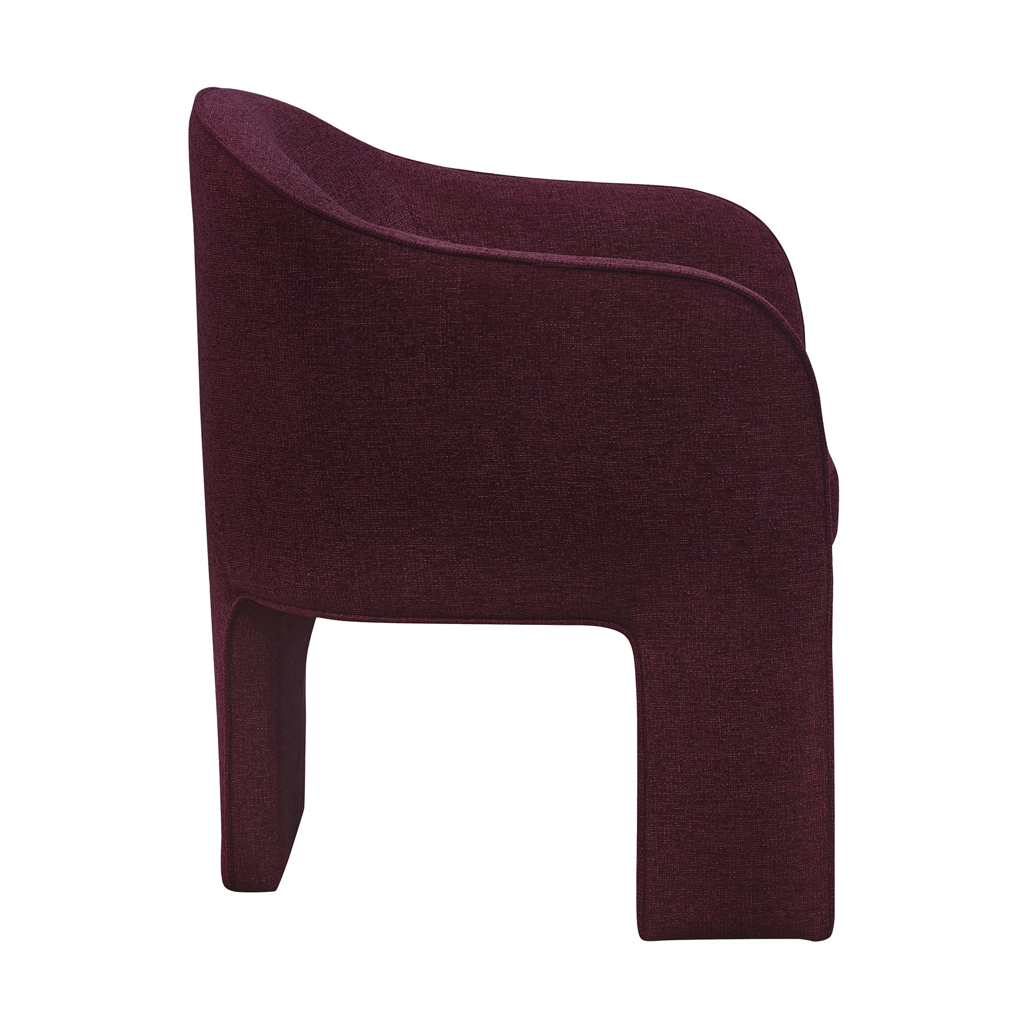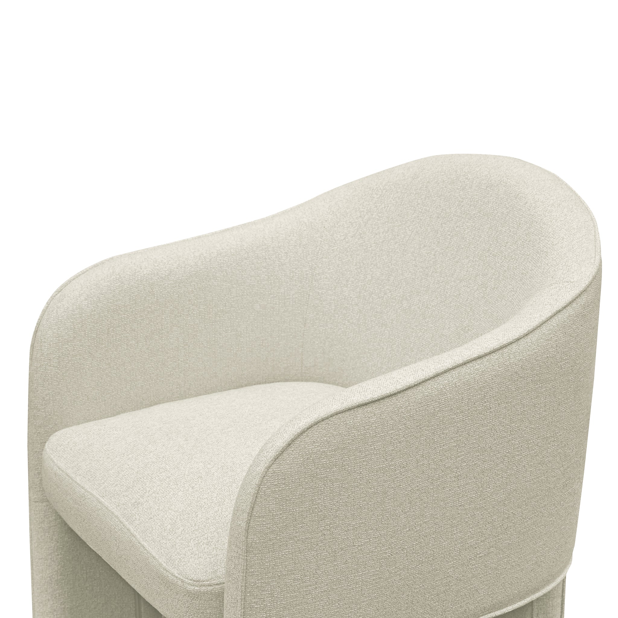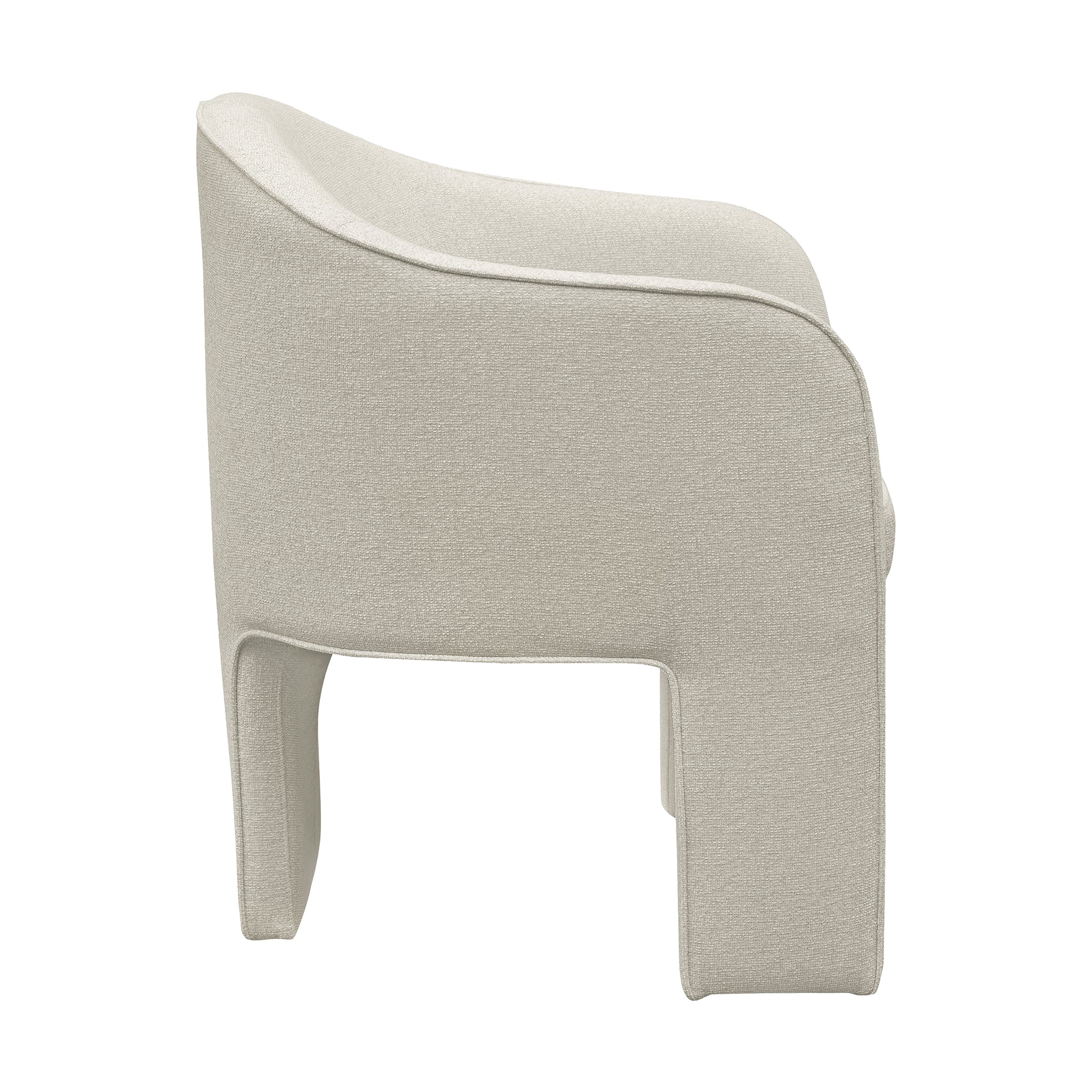 Fully upholstered in easy-to-clean performance fabric and generously sized, the Johna dining chair is all about comfort with a thoughtfully rounded back and gently curved armrests that add a touch of elegance and femininity. The sleek and minimalistic 3-legged base provides a clean and refined foundation.