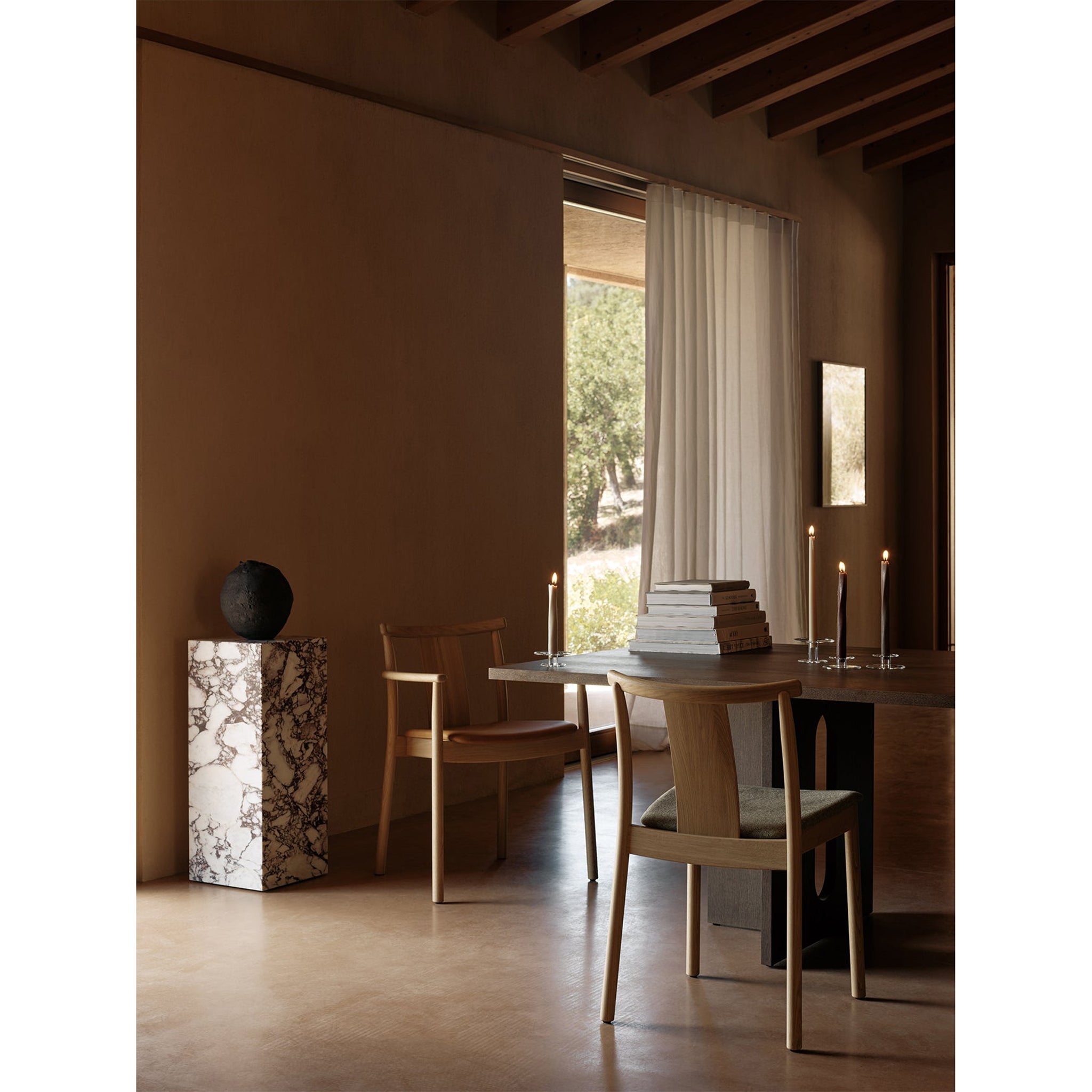 Originally designed for one of Norway's most monumental buildings, the Oslo Stock Exchange, Merkur is a modern take on the archetypal dining chair. Using traditional woodworking techniques to create its timeless form, the solid wood design is available with or without armrests and can be partially upholstered in a range of beautiful fabrics and leather to add further comfort.