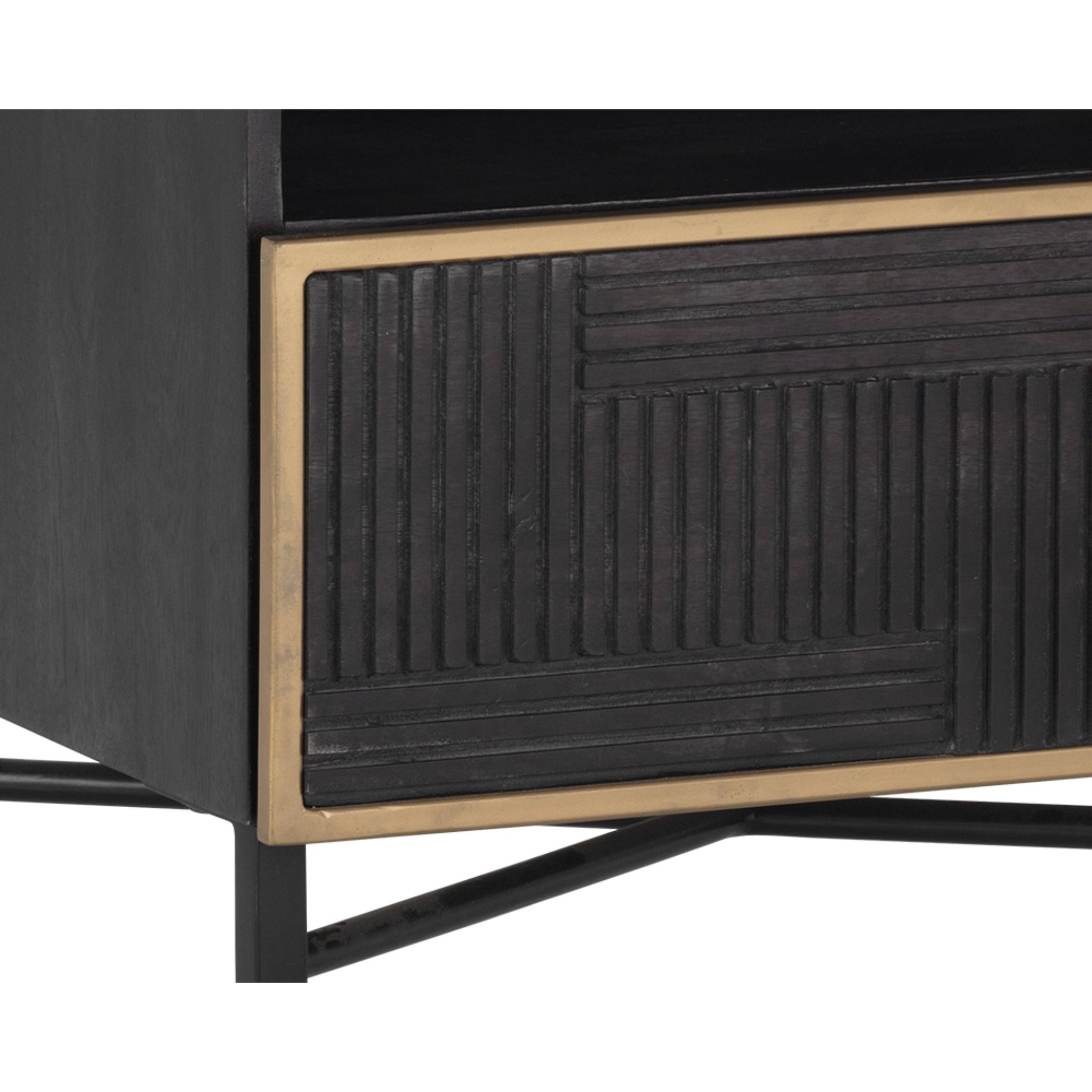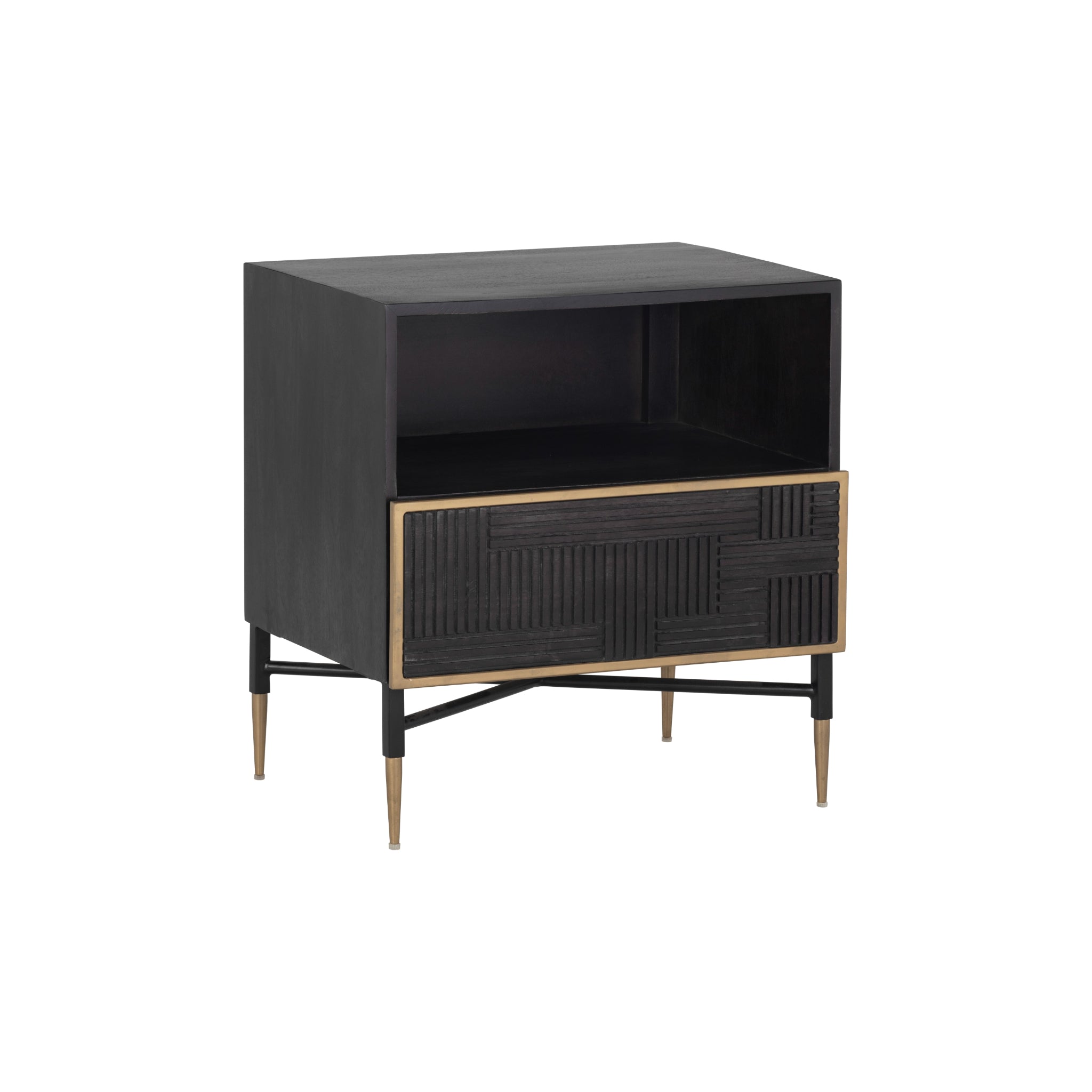 Influenced by global travels, skilled artisans use intricate woodworking techniques to bring the Nika nightstand to life. The eye-catching dark brown mango wood and antique brass frame result in a modern look. Features shelving and a drawer for ample storage.