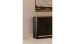 The Ophelia sideboard showcases a sleek, modern silhouette with a rounded edge frame and base. A herringbone pattern embellishes its door front, adding a touch of sophistication, while the sideboard's rich black stain finish exudes a sense of maturity and timelessness. A charming parquetry pattern adorns the exterior surfaces, infusing rustic elements into any living or dining space.