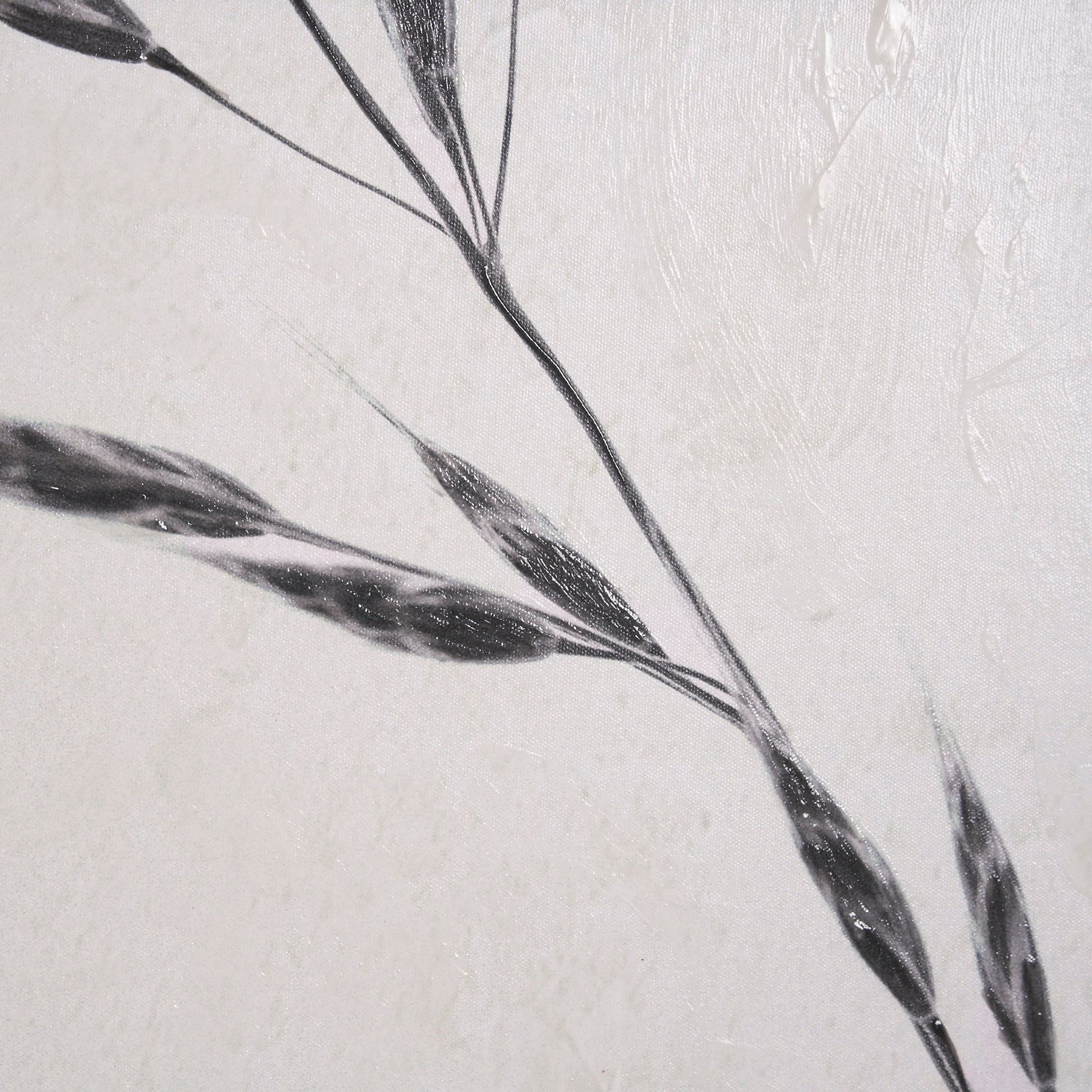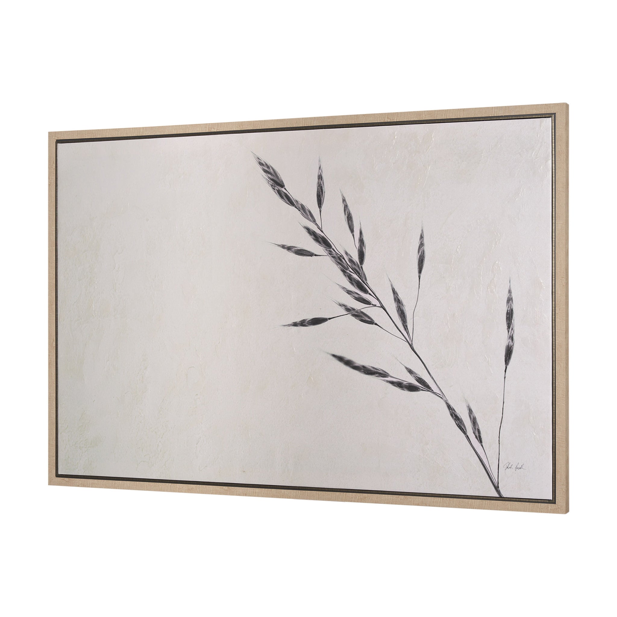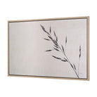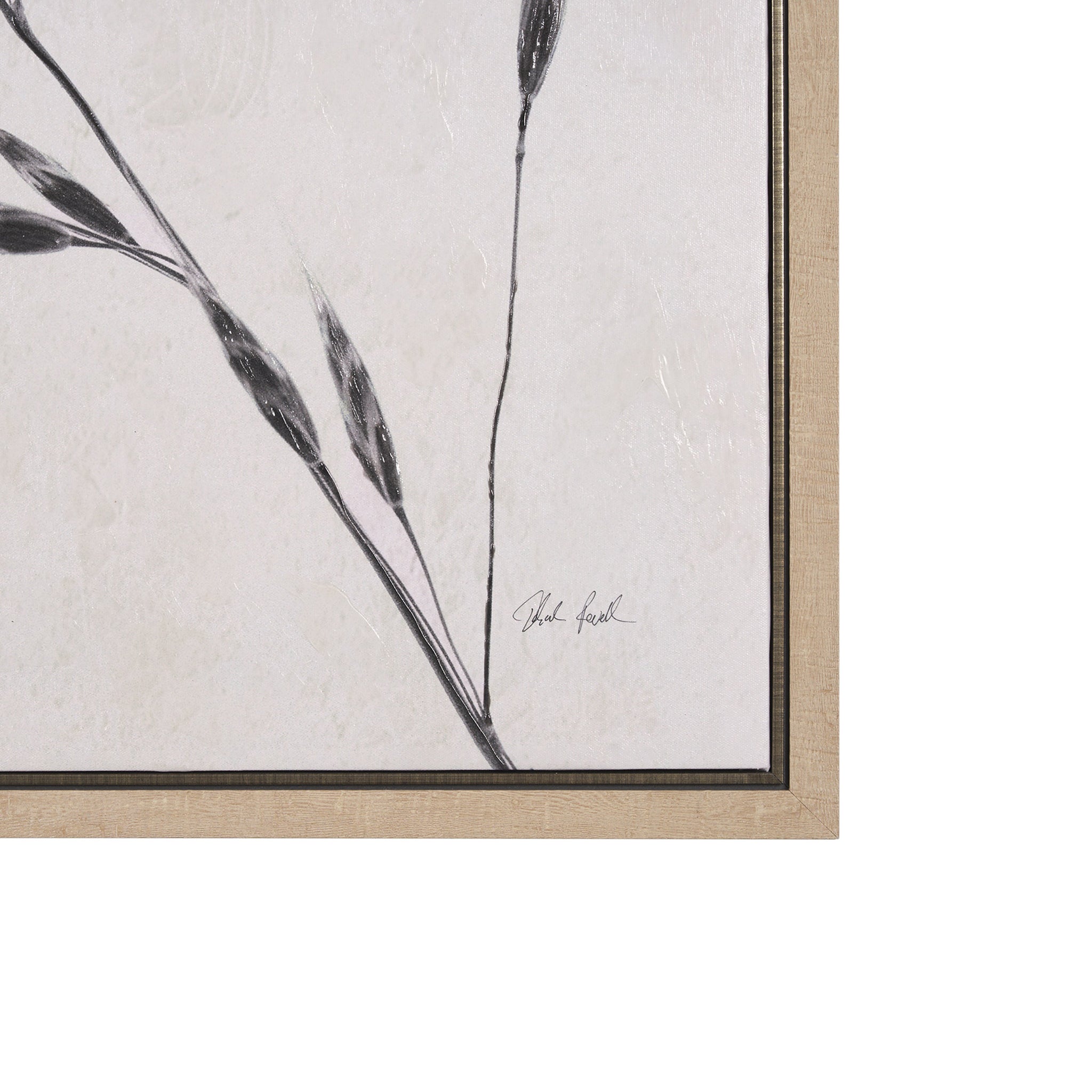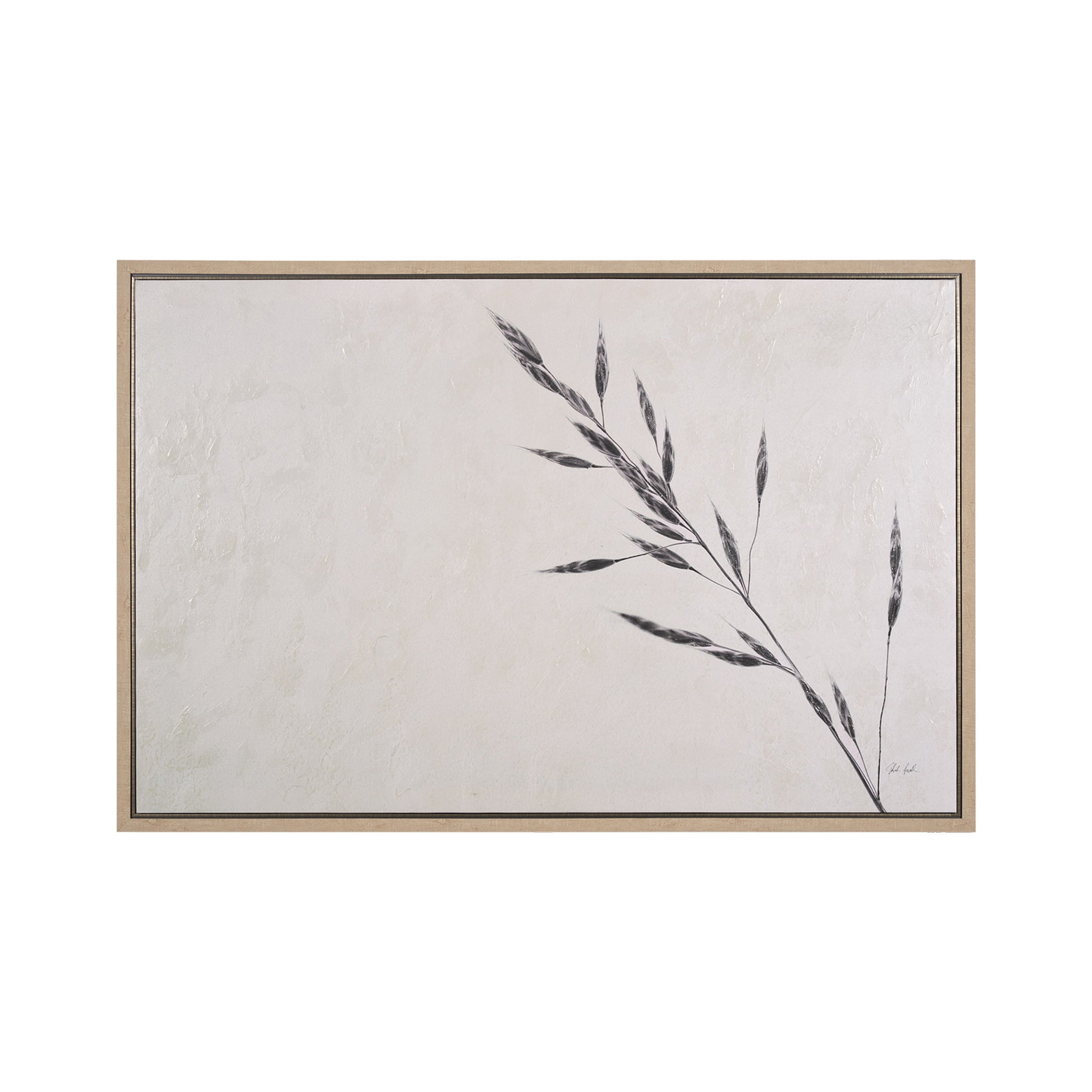 Embrace minimalist elegance with this serene framed artwork. A single, delicate sprig of grain or wild grass is rendered in striking dark tones against a subtly textured, light background, creating a calm and sophisticated visual. This piece offers a tranquil touch of nature's simplicity, perfect for modern, contemporary, or Japandi-inspired interiors.