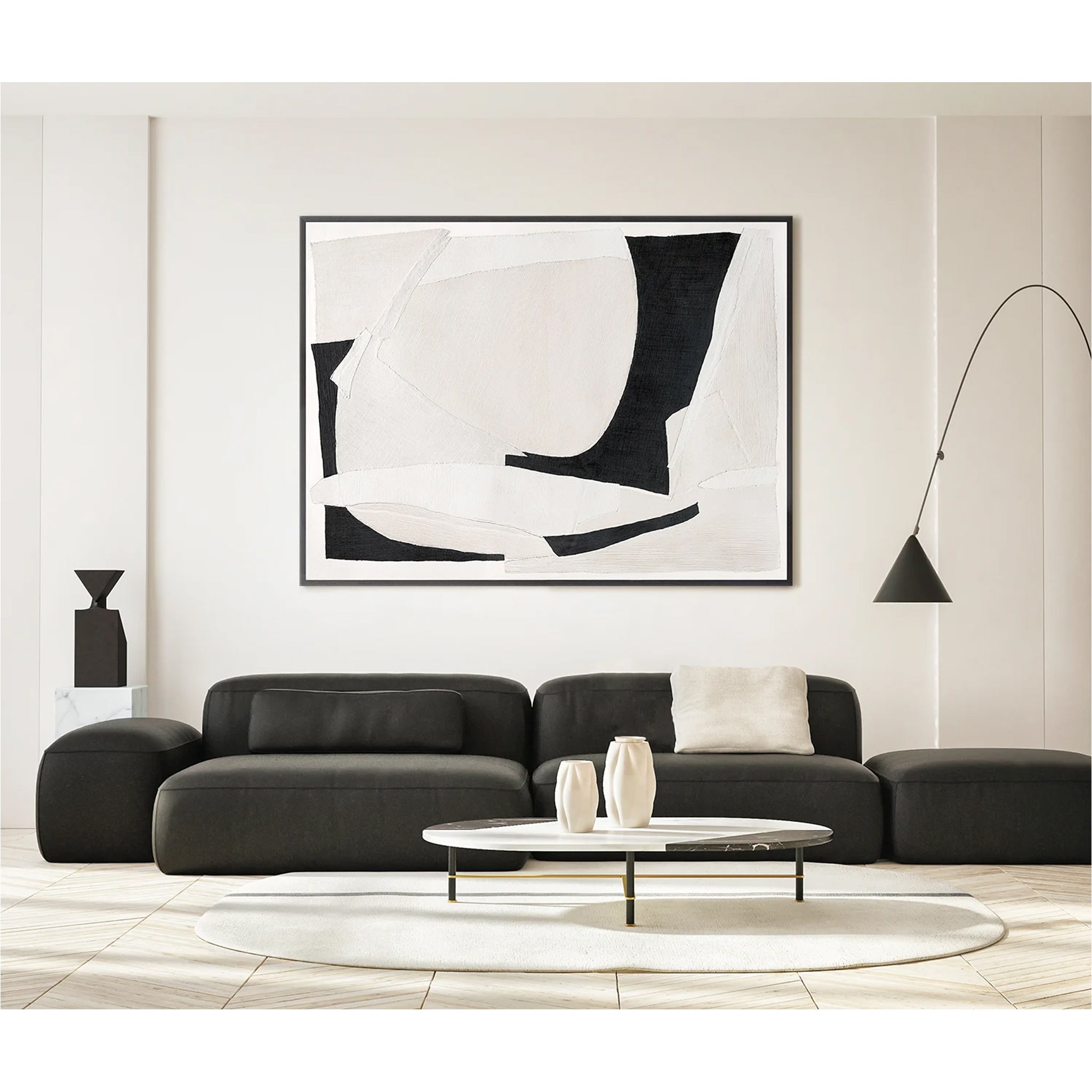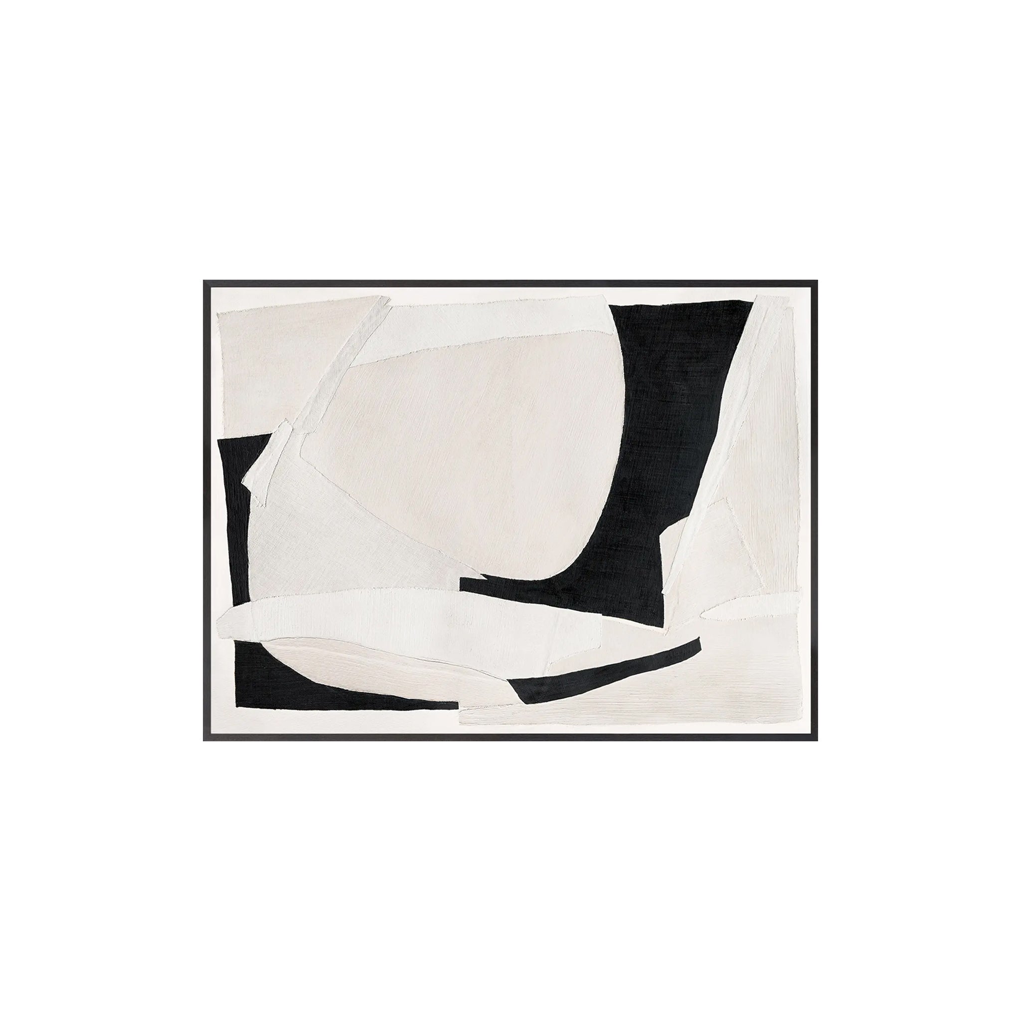 Layers of rich textiles mounted on canvas create a striking abstract image that will artfully draw the eye. The juxtaposition of black with cream and ivory tones is bold, while the distinct texture of this piece of art truly is an innovation. Framed in rustic dark wood, this mid-century style abstract is a decor dream.