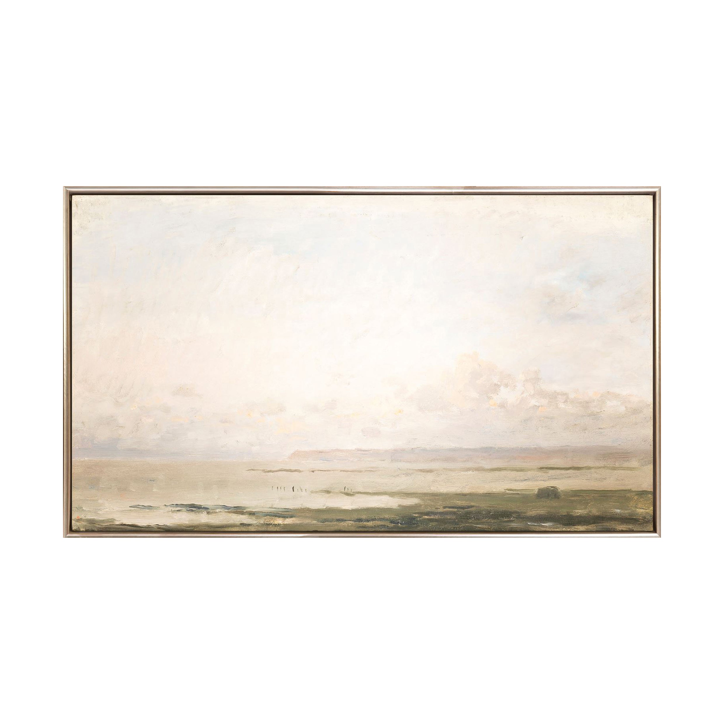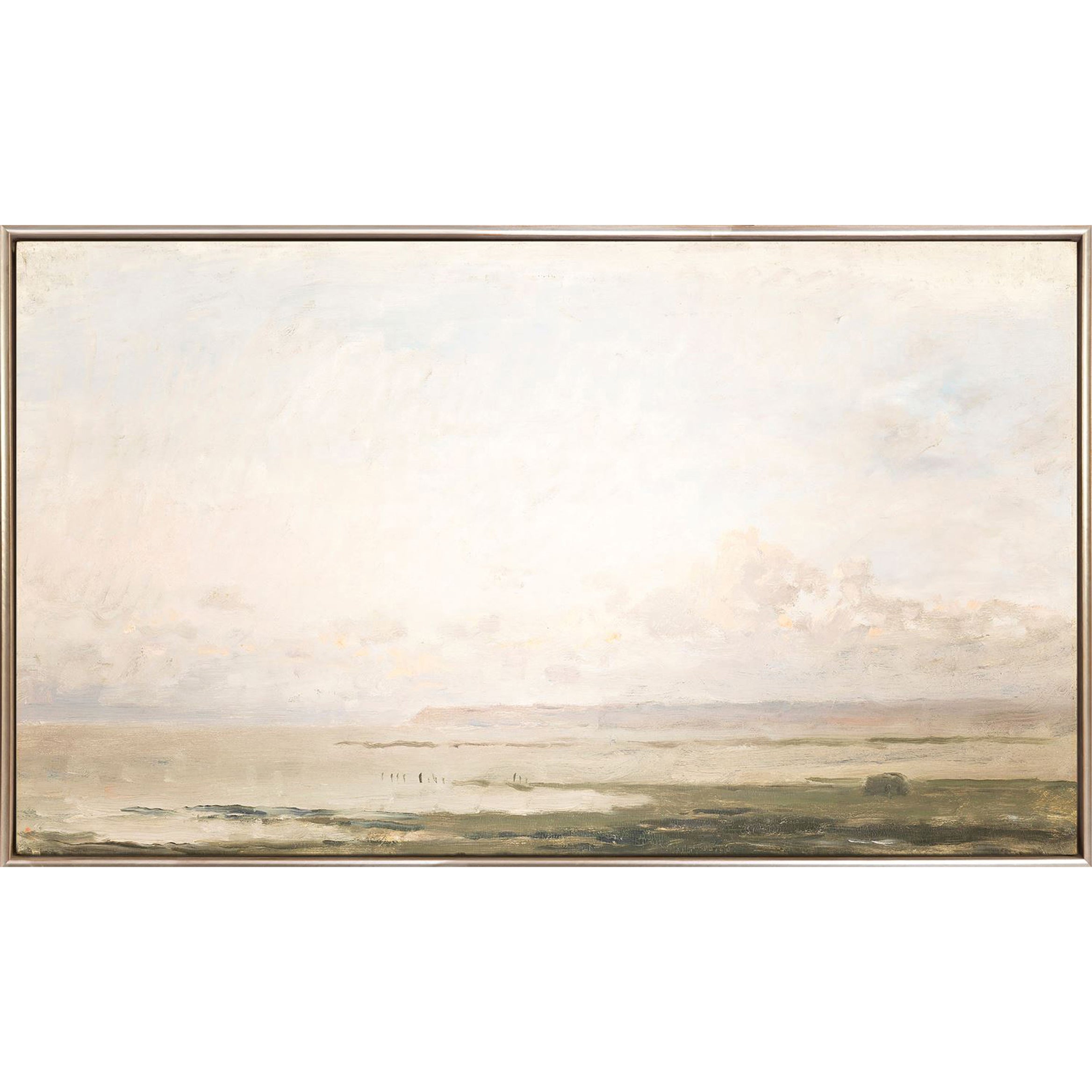 This traditional pre-expressionist piece features a luminous scenic coastline. Loose brush work in dusty blush and green tones adds the perfect amount of texture and subtle colour to this compelling piece.