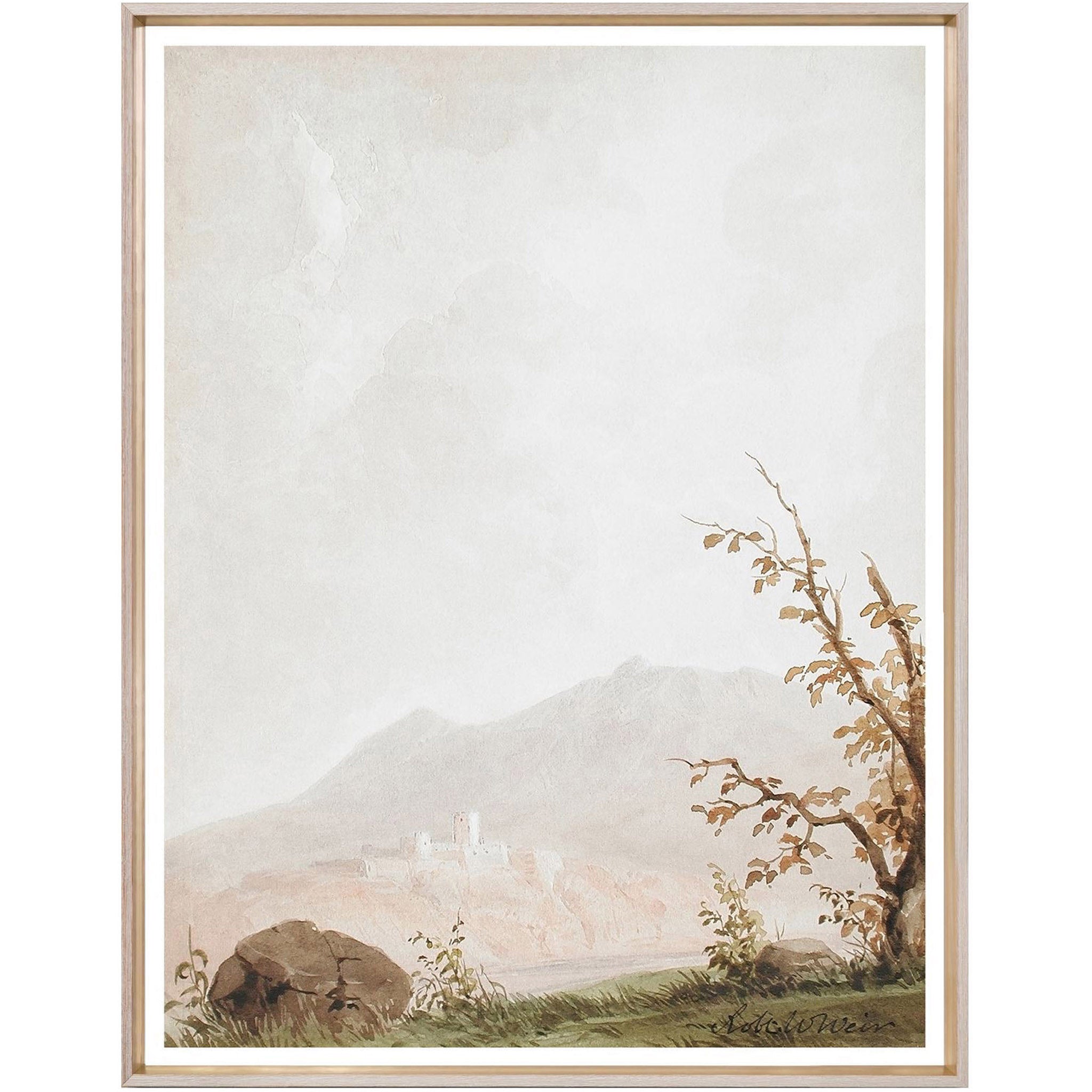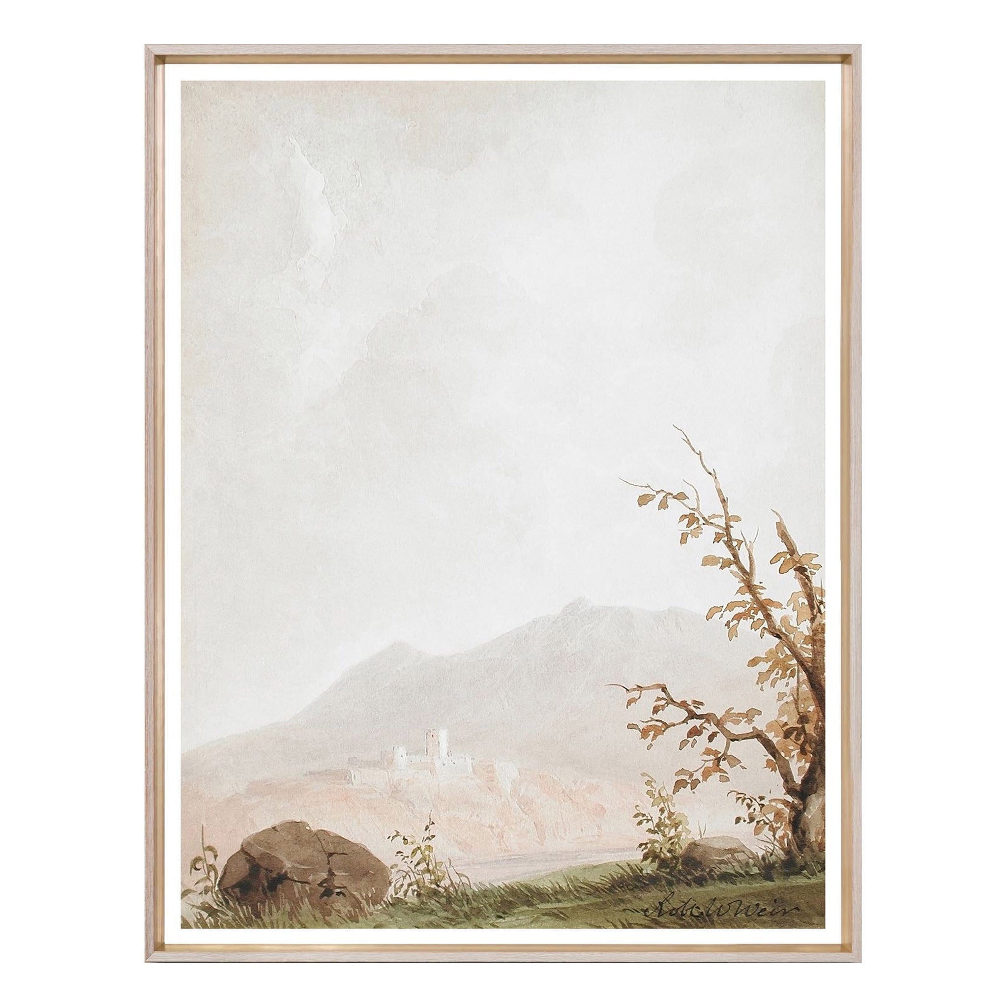 A soft and subtle Old World landscape by Hudson River School painter Robert Walter Weir in the 19th century. The stylized and atmospheric vibe of this elagant piece sets an elegant ambiance. Framed in a soft ivory wash profile with gold gild, angled, interior face.