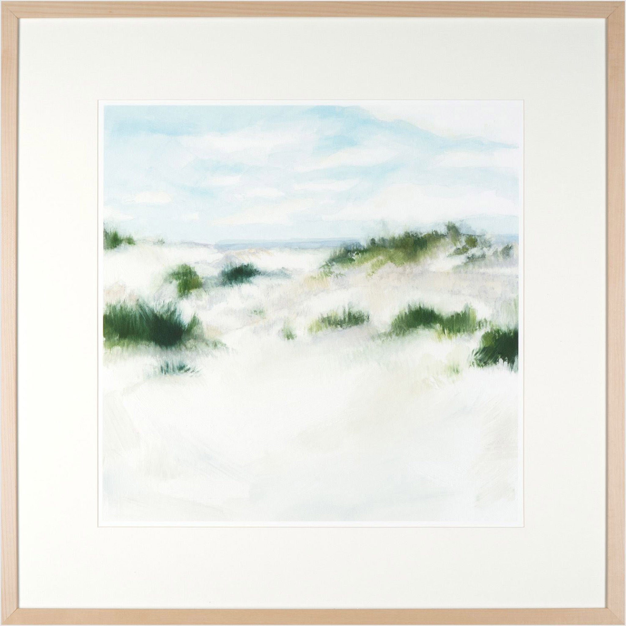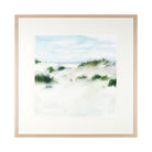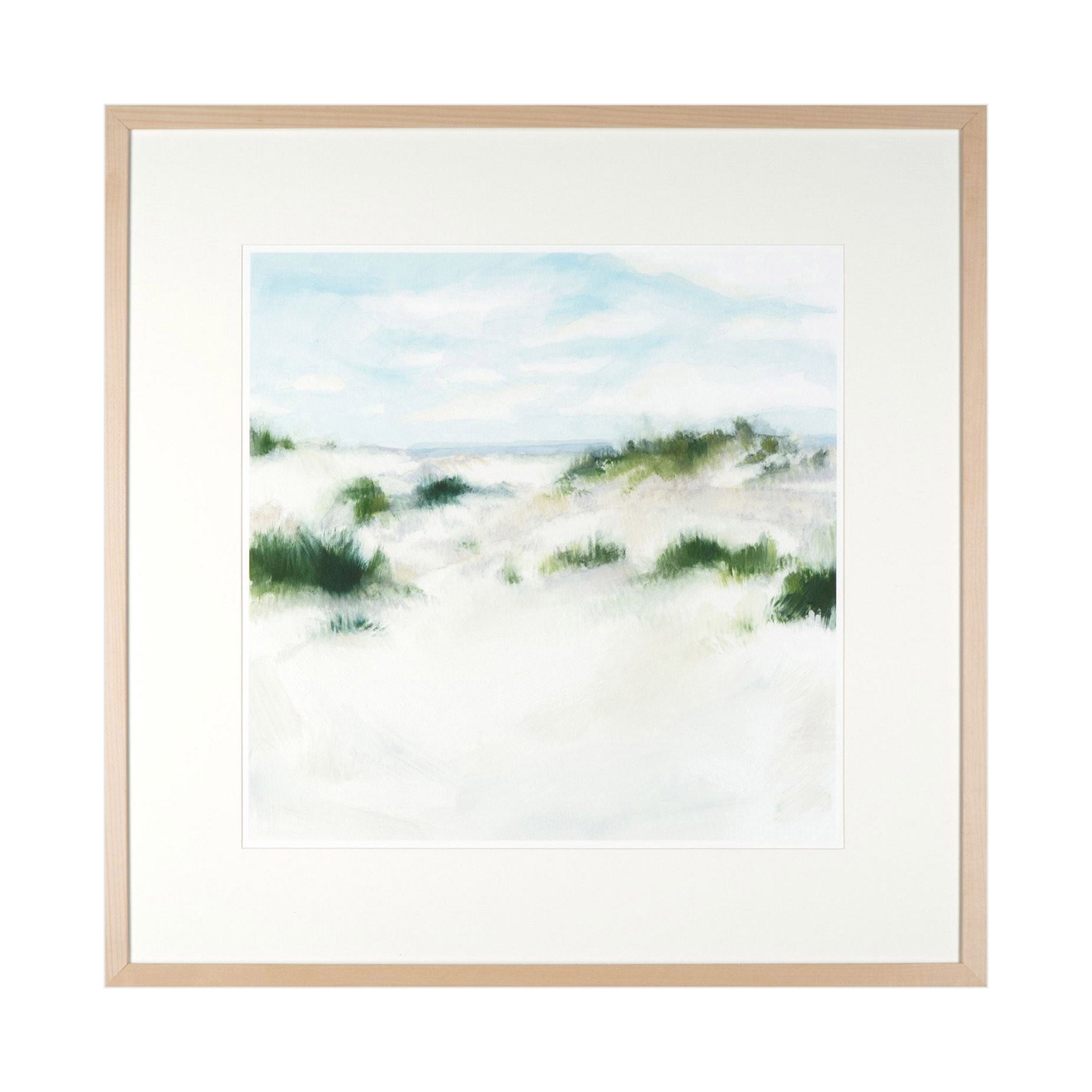 You can almost hear the seagulls among sand dune seascapes incorporating greens, soft blues and greys framed in white linen textured matt and contemporary birch frame.