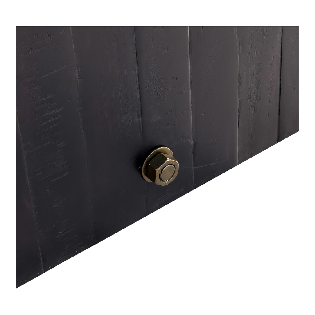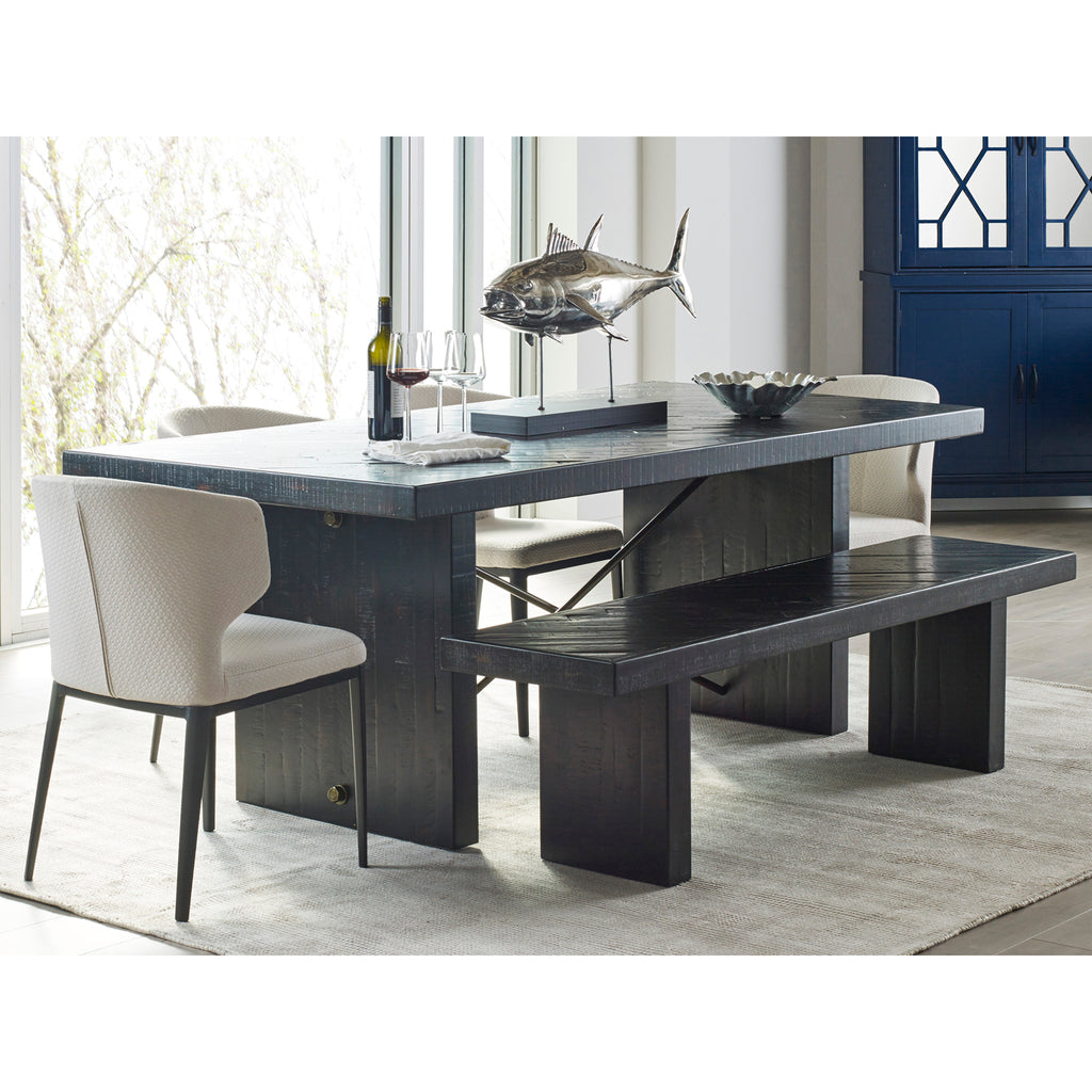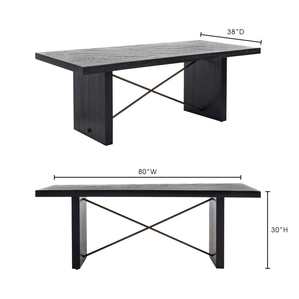 The Glen dining table has a rustic wood top with a glossy ebony stain and a contemporary parquet pattern. Steel supports and bolts give the piece a slight industrial edge. The overhang allows for additional seating on the ends, allowing room for up to 8. Check out the Glen collection.
