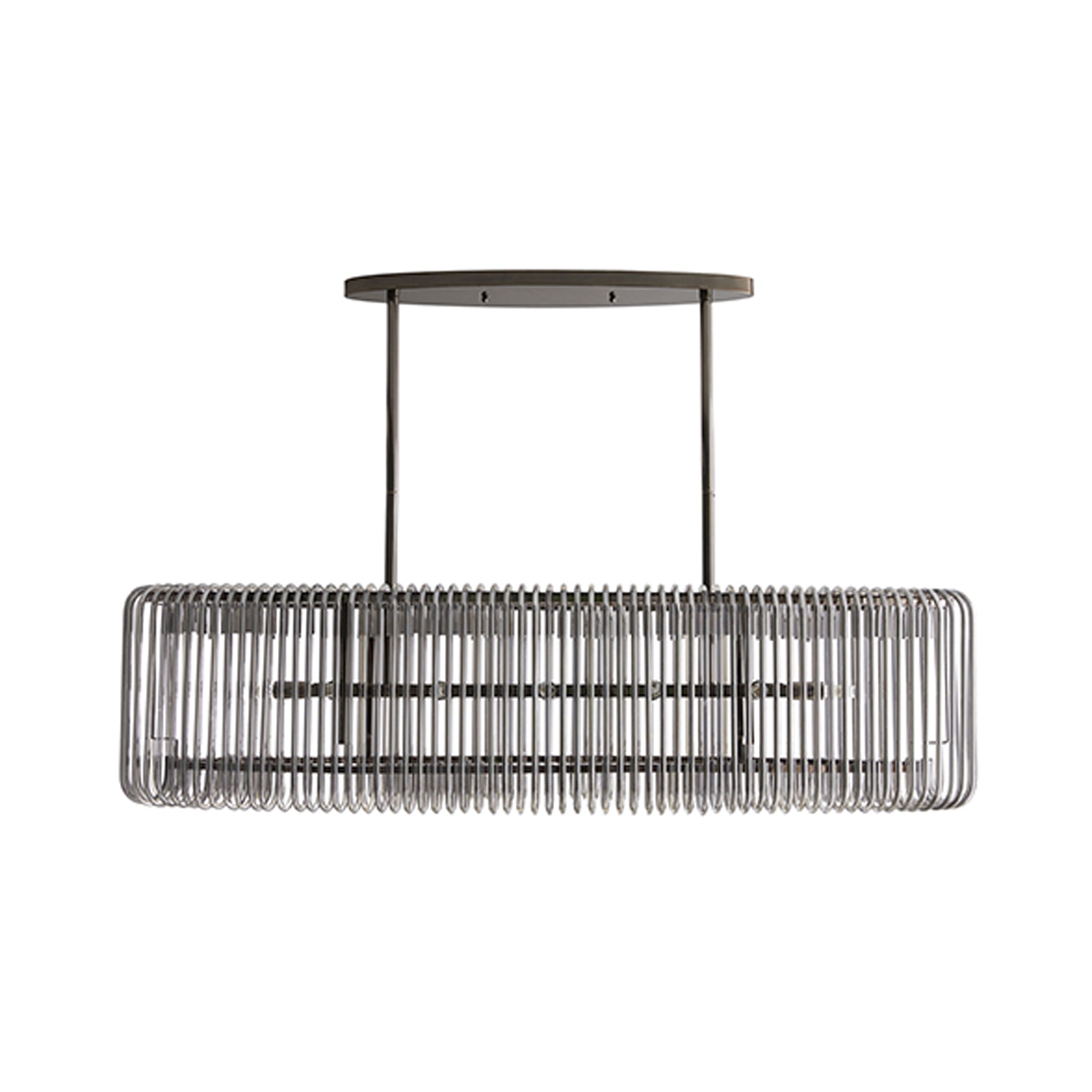 Finding the balance between being exceptionally elegant and devastatingly dramatic, the Chandler Chandelier commands a space. echoing traditional Italian design, clear glass delicately dangles from the elongated brown nickel steel frame orchestrating an unconventional shadow play. Twelve brilliant bulbs work in unison to brighten up a formal space in modern settings.