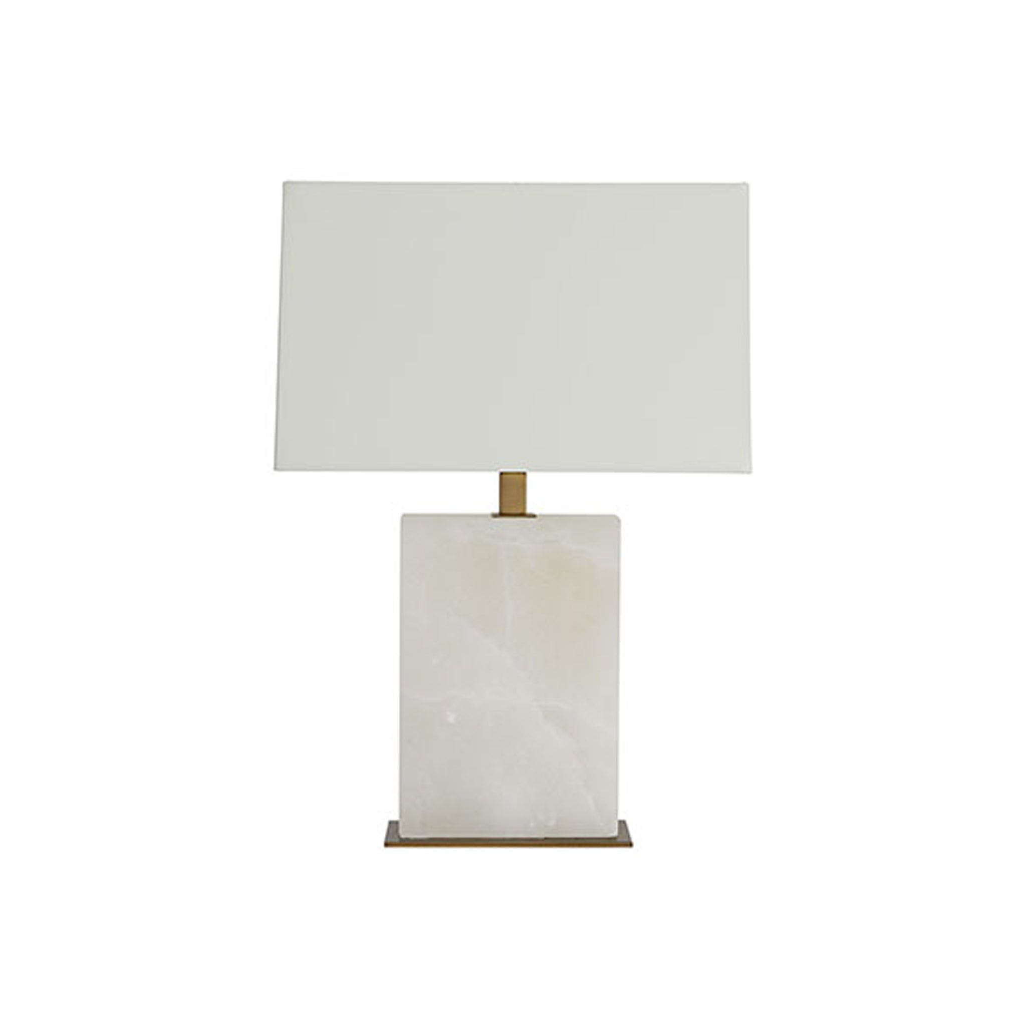 Simple and elegant, the carson is defined by a rectangular slab of snow marble atop a brass base. Topped with a rectangle ivory microfiber shade lined in cream cotton.