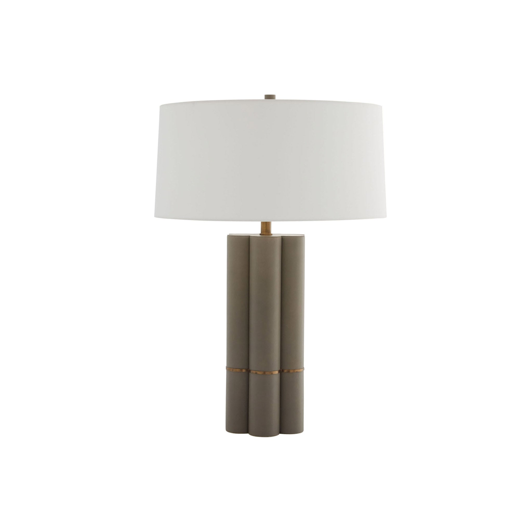 The unique scalloped column shape of the maddie finds inspiration in classic sculptural form. the dove leather construction is met with a thin antique brass band that accentuates and calls attention to its unconventional but refined form. topped with an off-white microfiber drum shade with an off-white cotton lining and a matching leather cylinder finial. finish will vary.