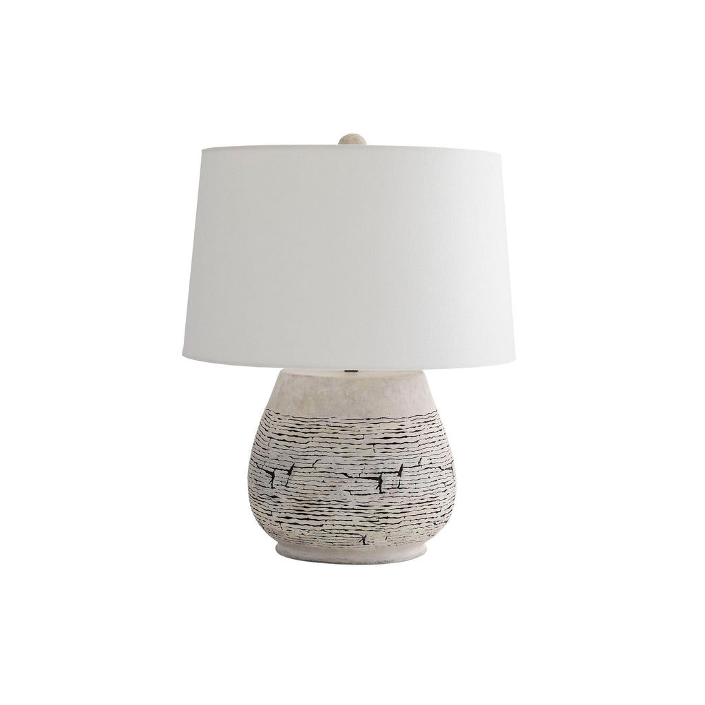 The kita establishes a strong presence in any room in which it resides. the robust terracotta formation features an etched pattern, carved by hand to look like stone. the ivory and charcoal wash finish emphasizes the crackled texture, settling into places where the etchings are present. topped with an off-white linen shade with an off-white cotton lining and a matching terracotta finial. finish will vary.