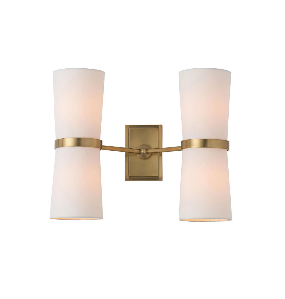 Cousin of the popular yasmin design, the inwood sconce is highlighted by two off-white linen shades, emitting light atop and below the sconce. finished in antique brass throughout. also available in vintage silver (49041). damp-rated, although limited covered outdoor conditions may affect finish.