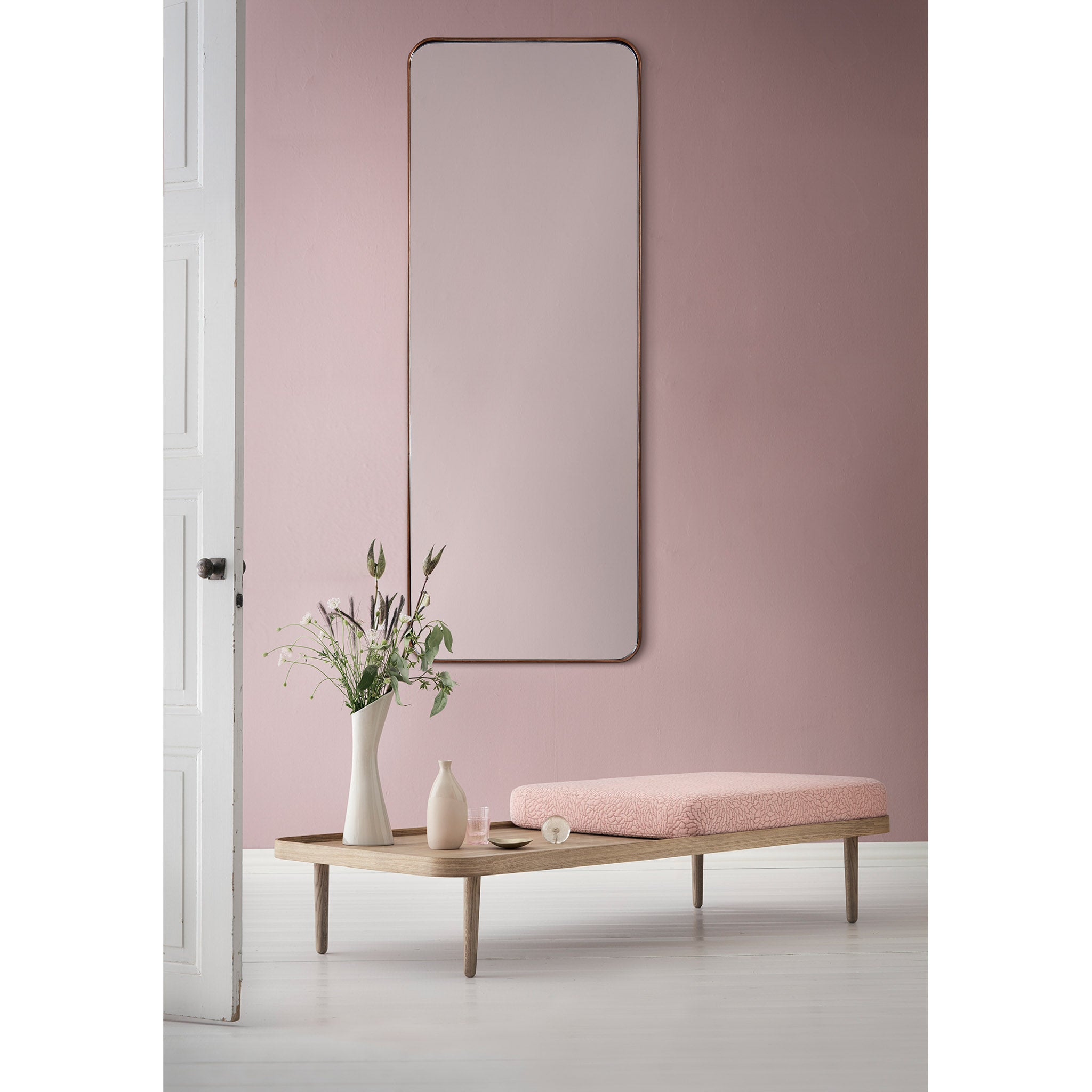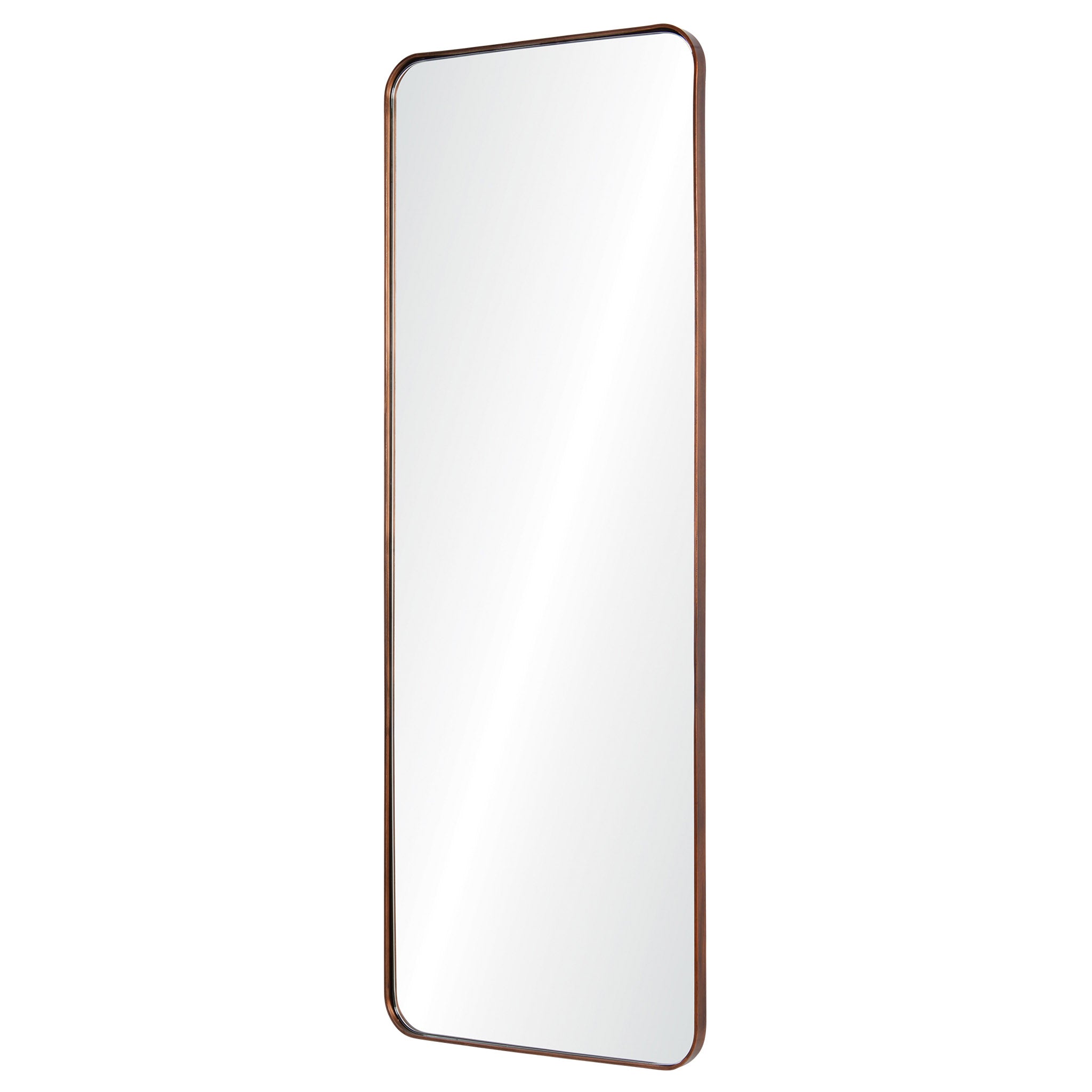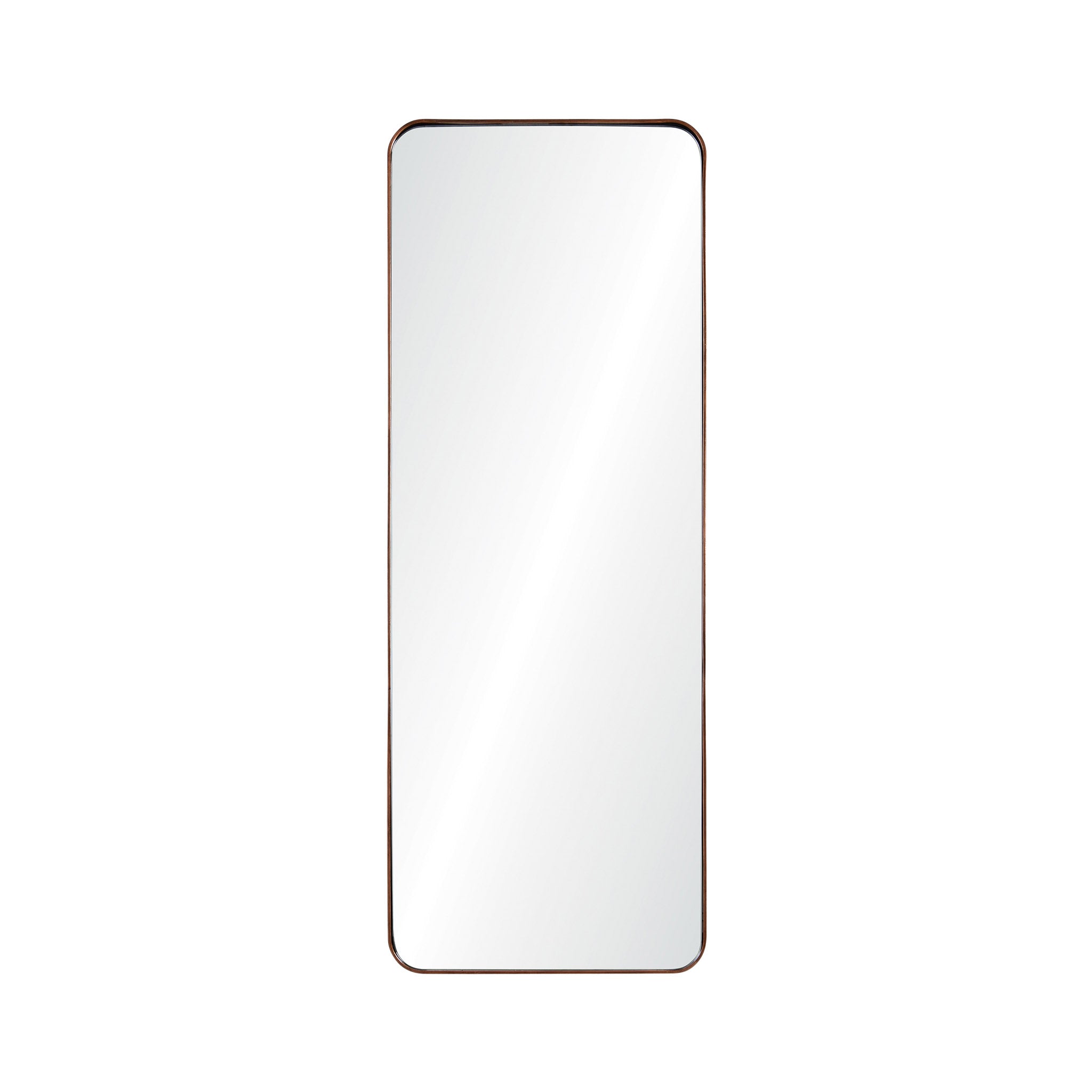 The low profile of this rectangular wall mirror serves as a stunning addition to interior walls in every room. The slightly inset looking glass is surrounded by a bronze metal frame for a touch of metallic minimalism. Gently rounded corners add a delicate curve to each edge, while the long rectangular format can be hung horizontally or vertically for a full-length view.