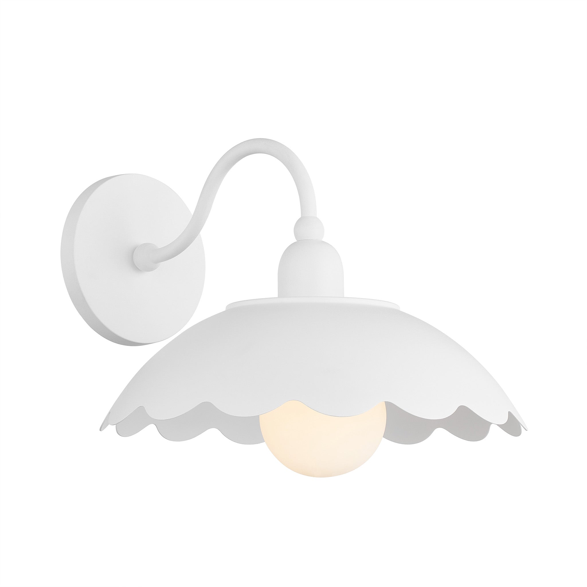 Graceful gooseneck arms curve like stems in support of the beautiful botanical forms of Yael. Each large dome shade features a scalloped edge. Small decorative spheres adorn the fixture like beads, complementing the sculptural linework of this family. Available as a sconce or a linear design, Yael makes a soft, fresh statement with its Textured White finish. Part of our Zoe Feldman collection.