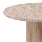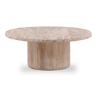 Create a serene and harmonious space with this organic modern coffee table. A thick, round slab of natural stone, with its unique veining, sits gracefully atop a solid wood pedestal base. This low-profile piece is a perfect centerpiece for a minimalist living area, bringing a sense of tranquil elegance and natural beauty to your home.