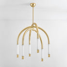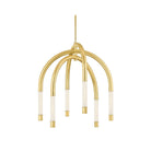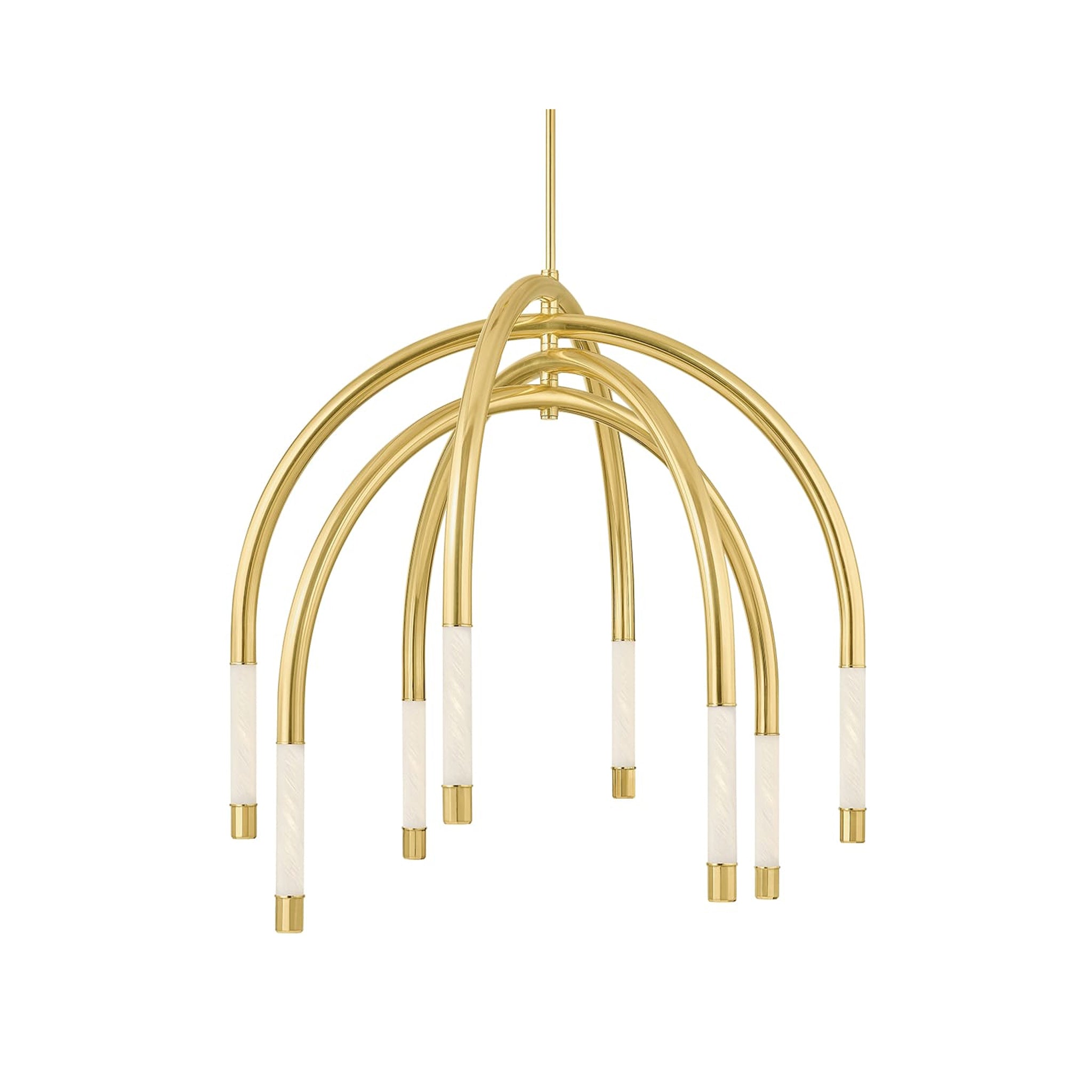 Reminiscent of a chunky, individual chain link or a beautiful modern earring, Zeme is instantly recognizable as a creation of Noz Nozawa. The simple yet exaggerated silhouette feels new and fresh yet understandable. The integrated LED light introduces a touch of innovation, while the etched cloud glass and Vintage Polished Brass finish nod to vintage glamor. Zeme is available as a 6-light or 8-light chandelier, as well as a 2-light sconce. Noz Nozawa for Corbett Lighting.