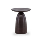 This sculptural side table is a true conversation starter. Its clean, round tabletop appears to float effortlessly above a beautifully tapered, conical base. The entire piece is finished in a rich, dark bronze with a subtle, weathered patina, giving it a timeless and artisanal feel. Perfect as a striking accent piece, it provides a stylish and functional surface for a drink, a book, or a small lamp in any living room or reading nook.